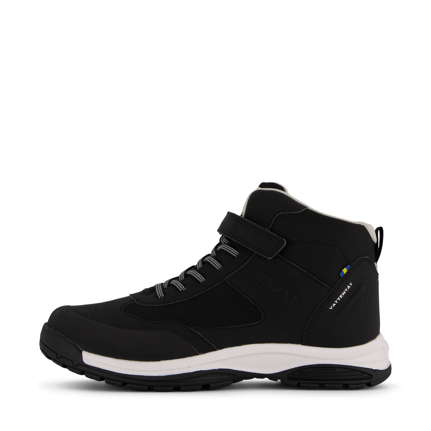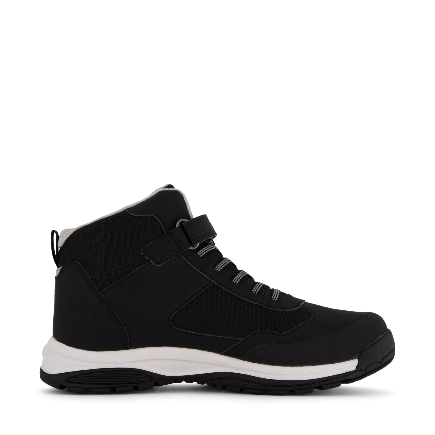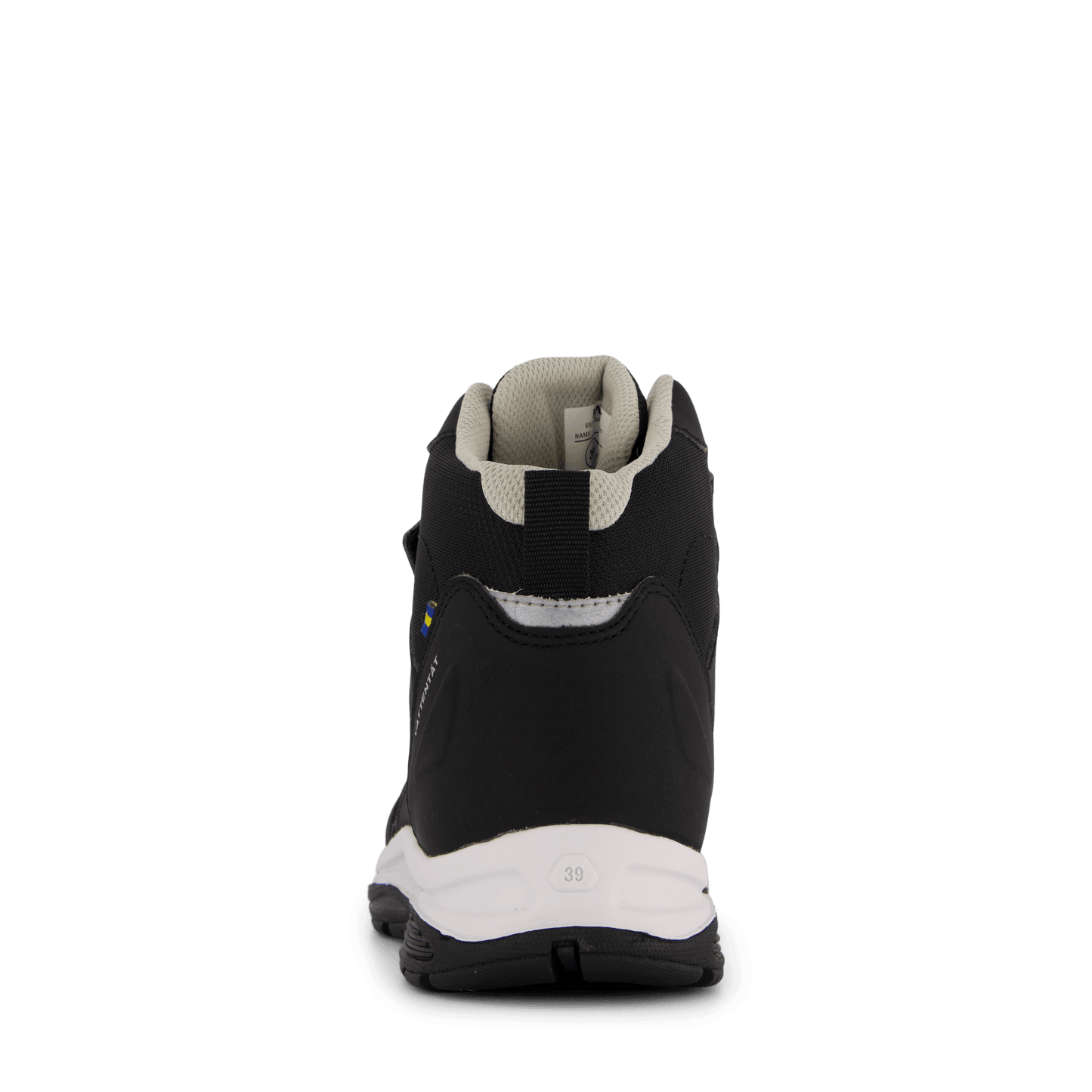 The Killinge High WP Black is a sporty, waterproof mid-cut bootie for older kids and teens. Made with partly recycled materials, it features a reinforced toe box, hook-and-loop fastening, and reflective laces. The shoe boasts a biodegradable membrane, sealed seams, and a lightweight EVA rubber sole with natural rubber bottom for superior grip, making it ideal for autumn and winter wear.