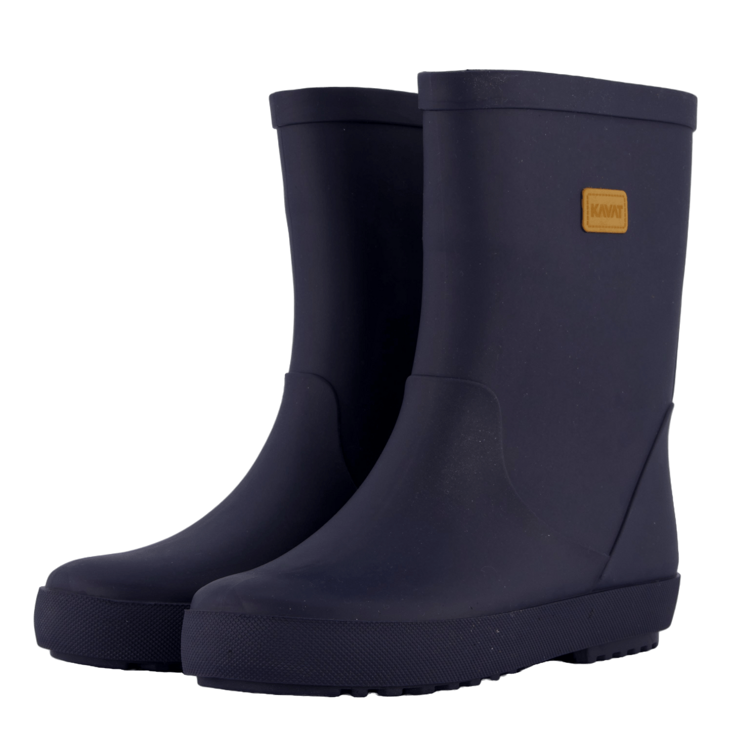 Elevate your rainy day style with Kavat's Skur Wp Blue rain boot. This sleek, navy blue mid-calf boot features a waterproof rubber construction, non-slip textured sole, and a minimalist design. The boot's smooth matte finish is complemented by a distinctive mustard yellow brand patch, offering both functionality and fashion for wet weather conditions.