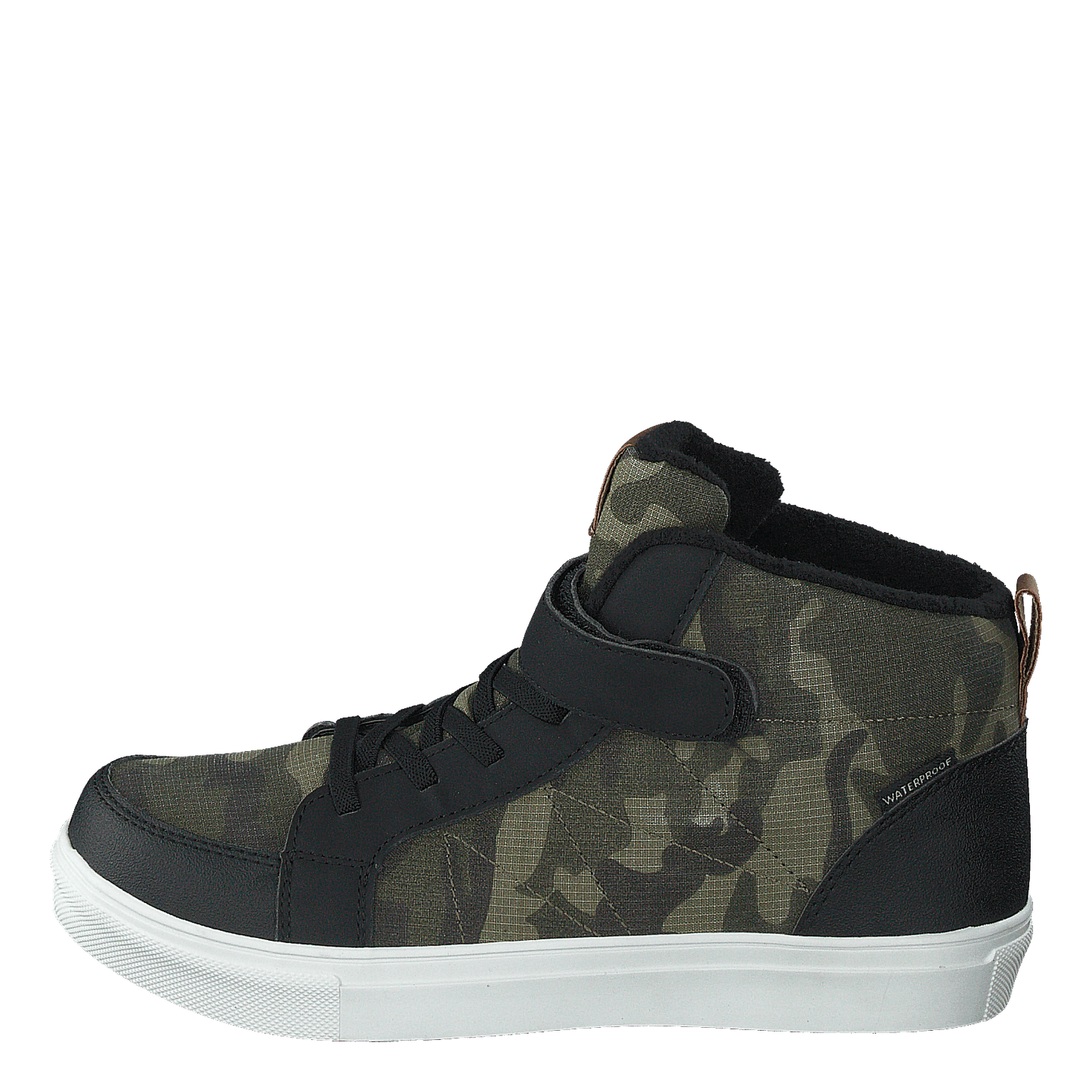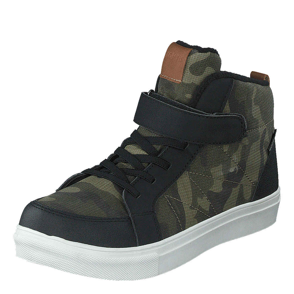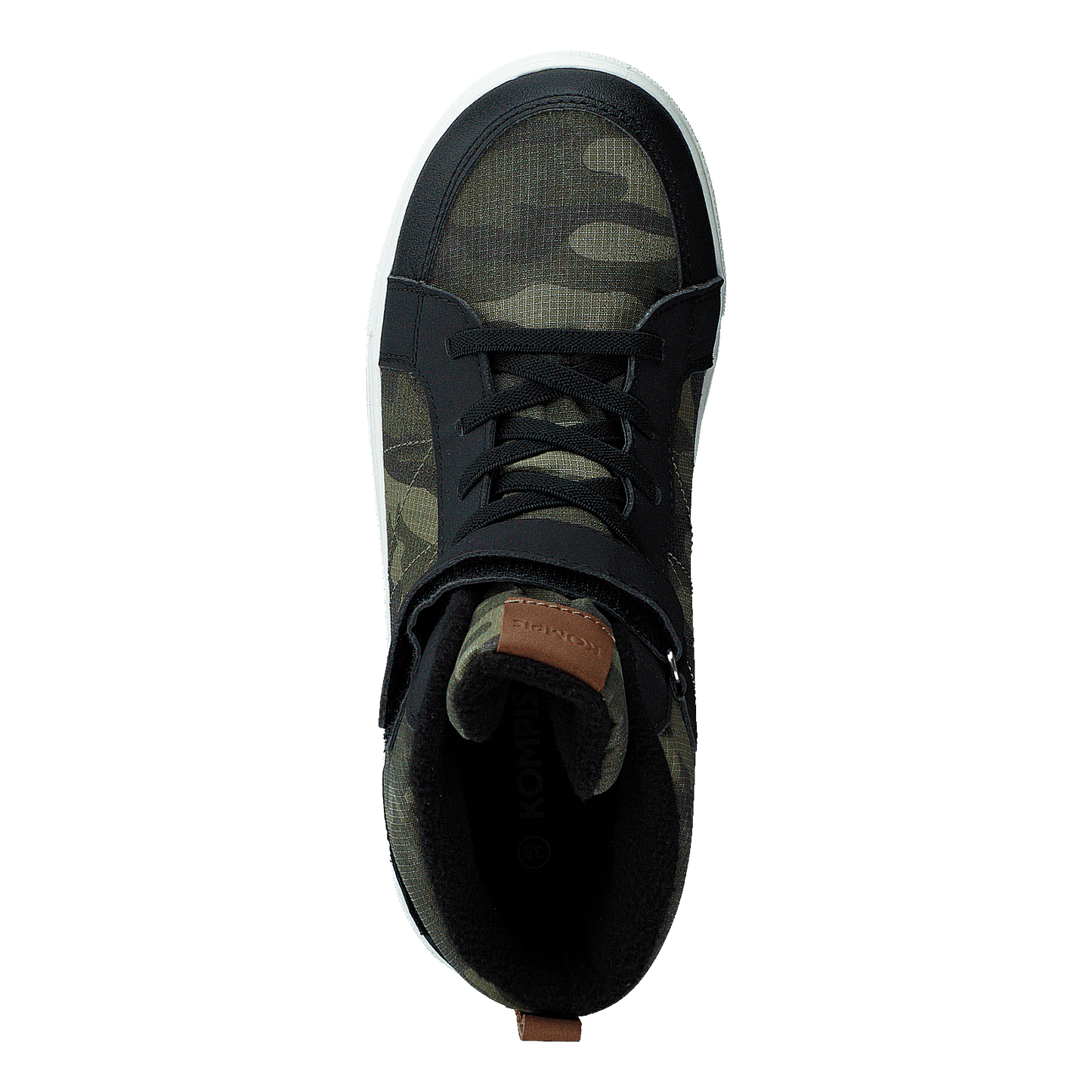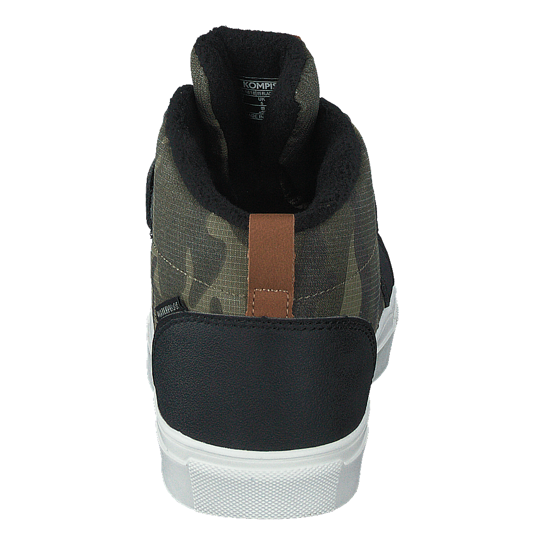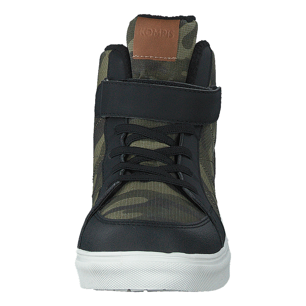 Discover the Kompis 430-1818, a versatile high-top sneaker that combines style and functionality. Featuring a waterproof design, this shoe boasts a black and muted green camouflage pattern on its textile upper, complemented by a black synthetic trim. With a secure velcro strap, black laces, and a contrasting white sole, it offers a rugged, outdoor-inspired look perfect for urban adventures.