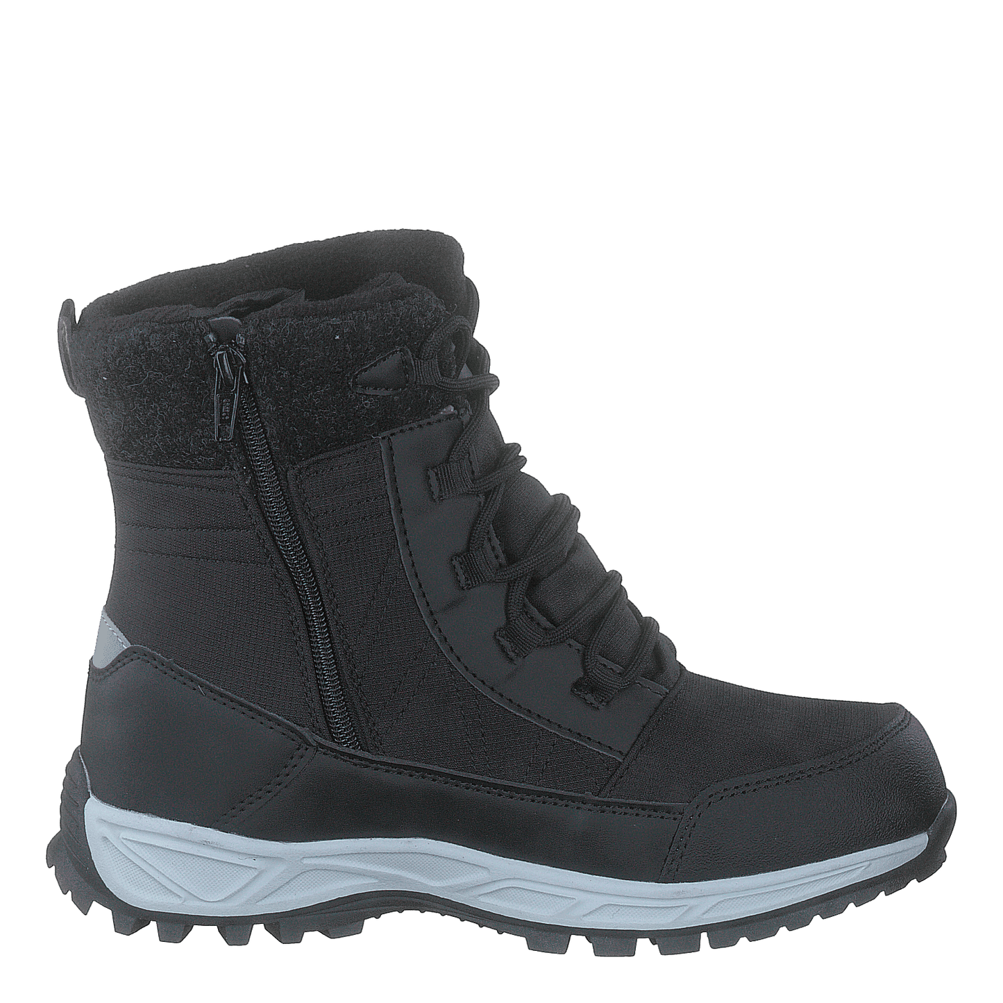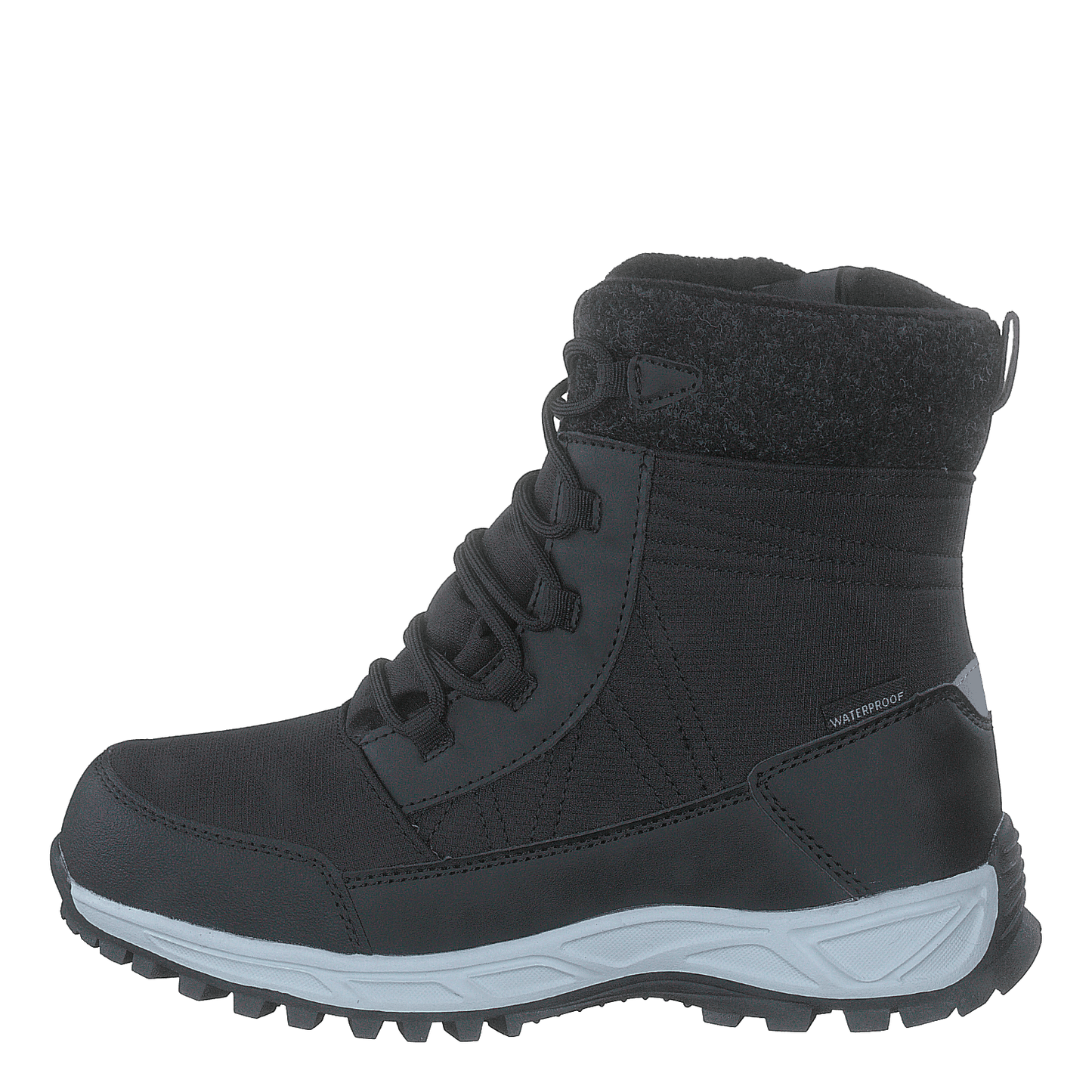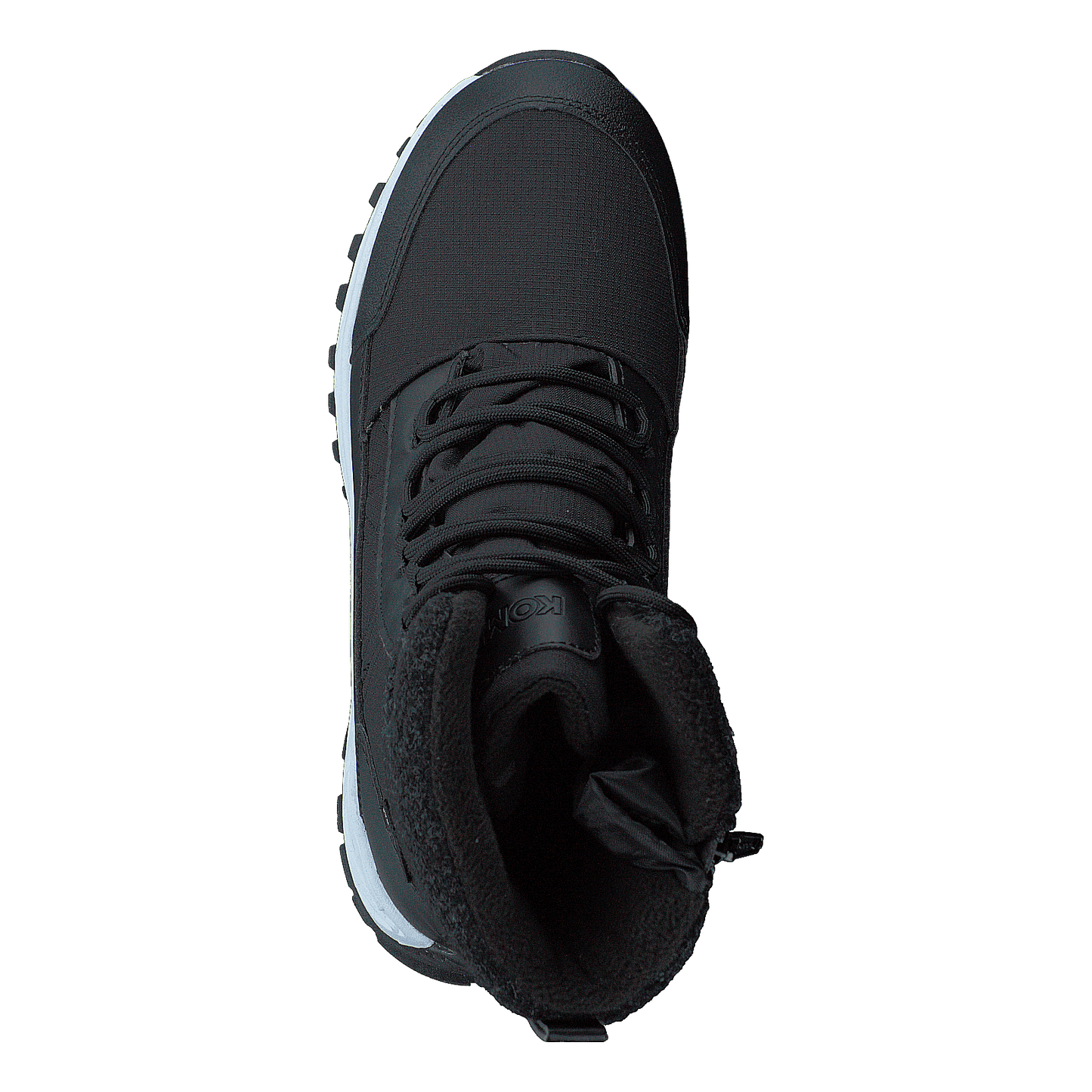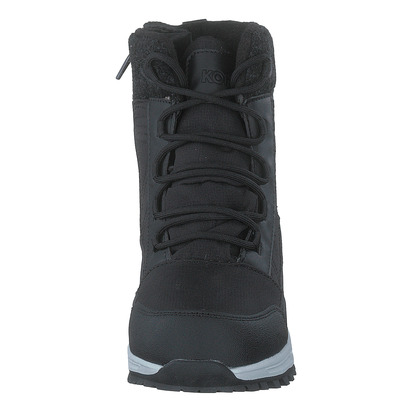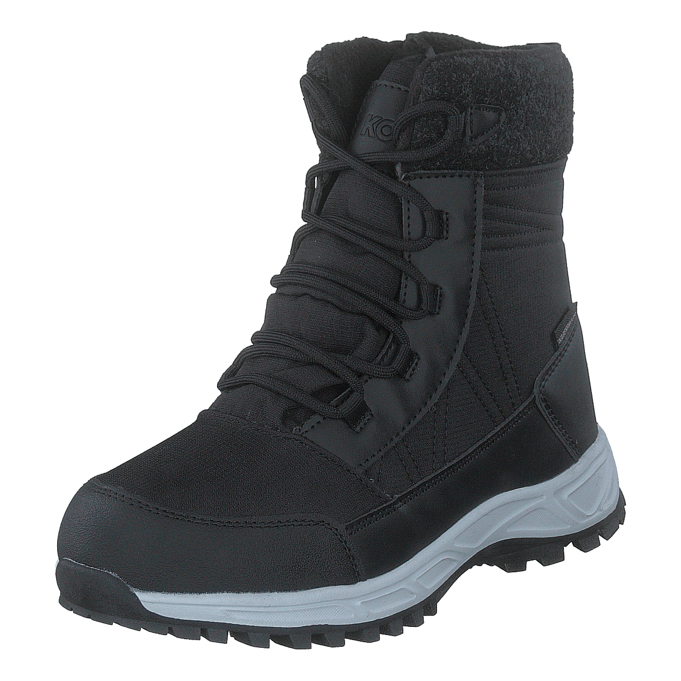 Kompis 430-1863 Black is a stylish and functional winter boot designed for harsh weather conditions. This mid-height boot features a waterproof construction, combining leather and synthetic materials with a warm, fuzzy lining for superior insulation. The lace-up design with metal eyelets ensures a secure fit, while the chunky, rugged sole with a contrasting white midsole provides excellent traction on slippery surfaces.