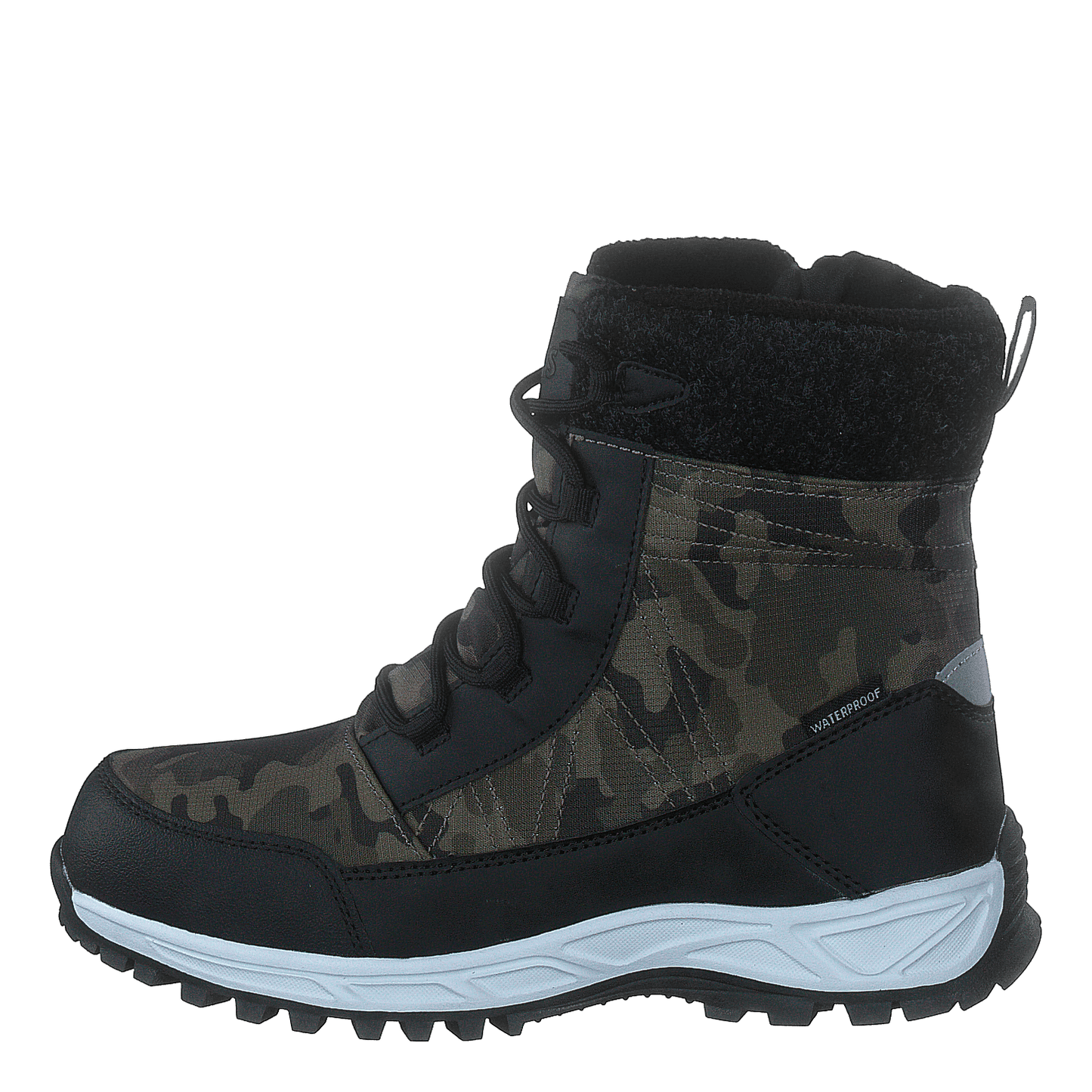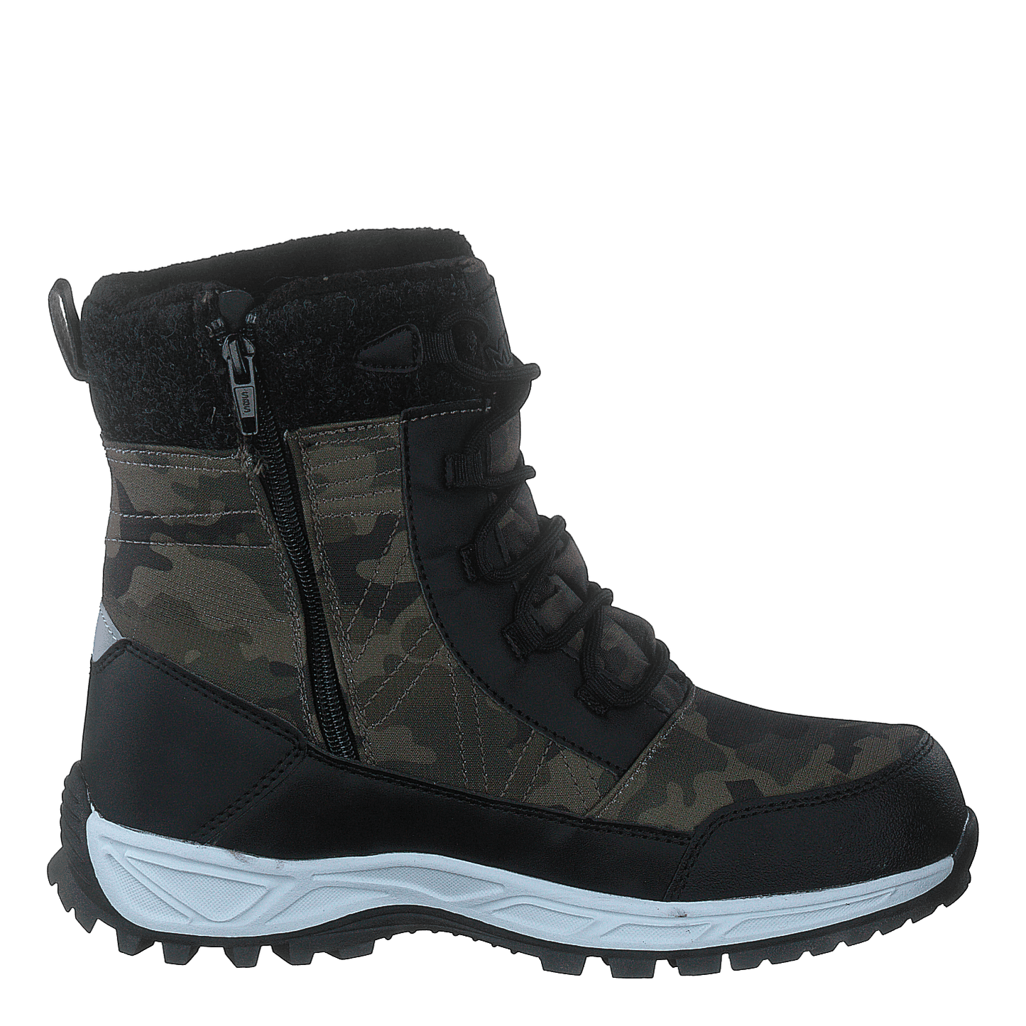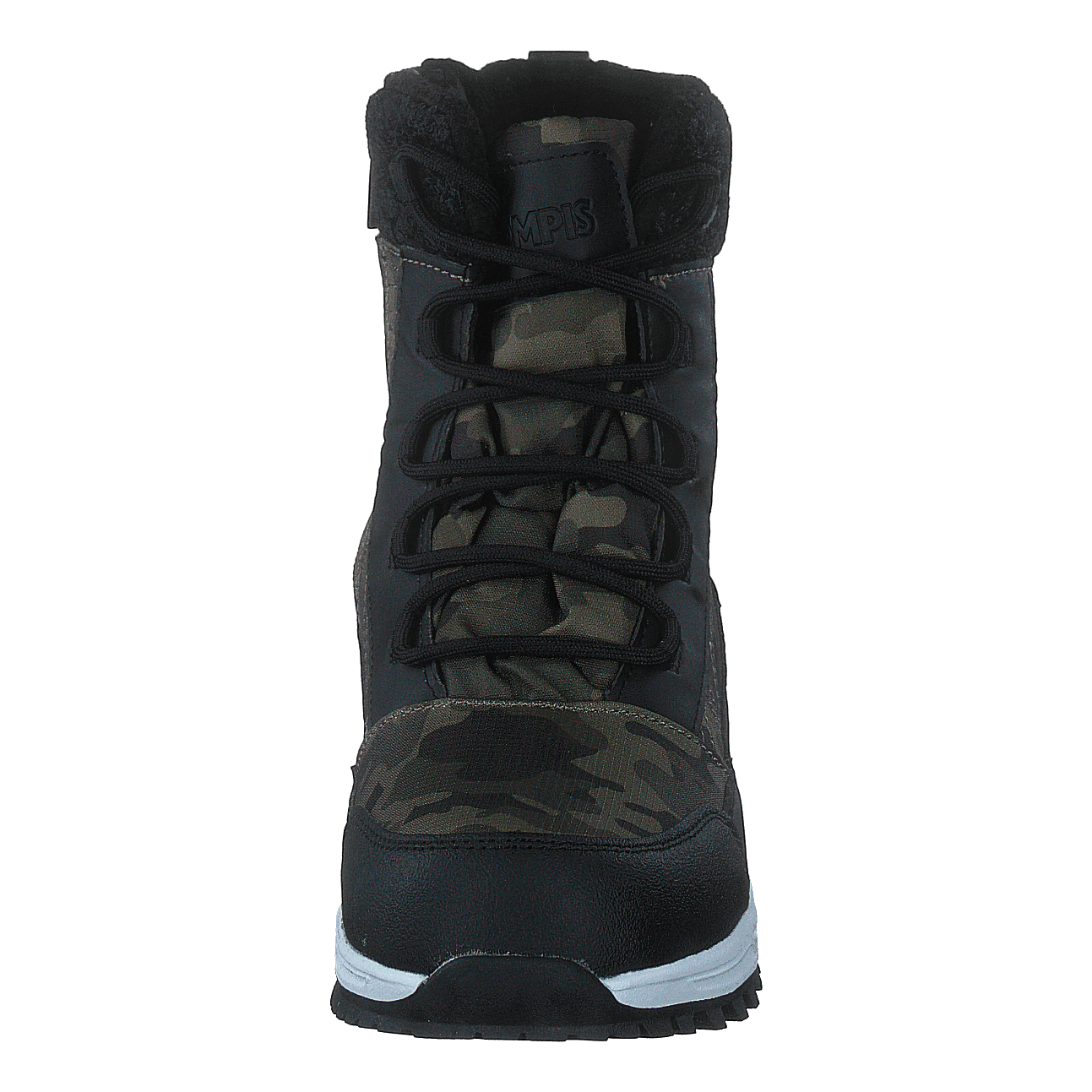 Rugged winter boot combining style and functionality. Features black waterproof upper with fuzzy collar, green and black camouflage mid-section, and chunky white sole for excellent traction. Lace-up design with metal eyelets ensures a secure fit. Reflective heel patch adds safety for low-light conditions. Ideal for cold weather and outdoor activities.