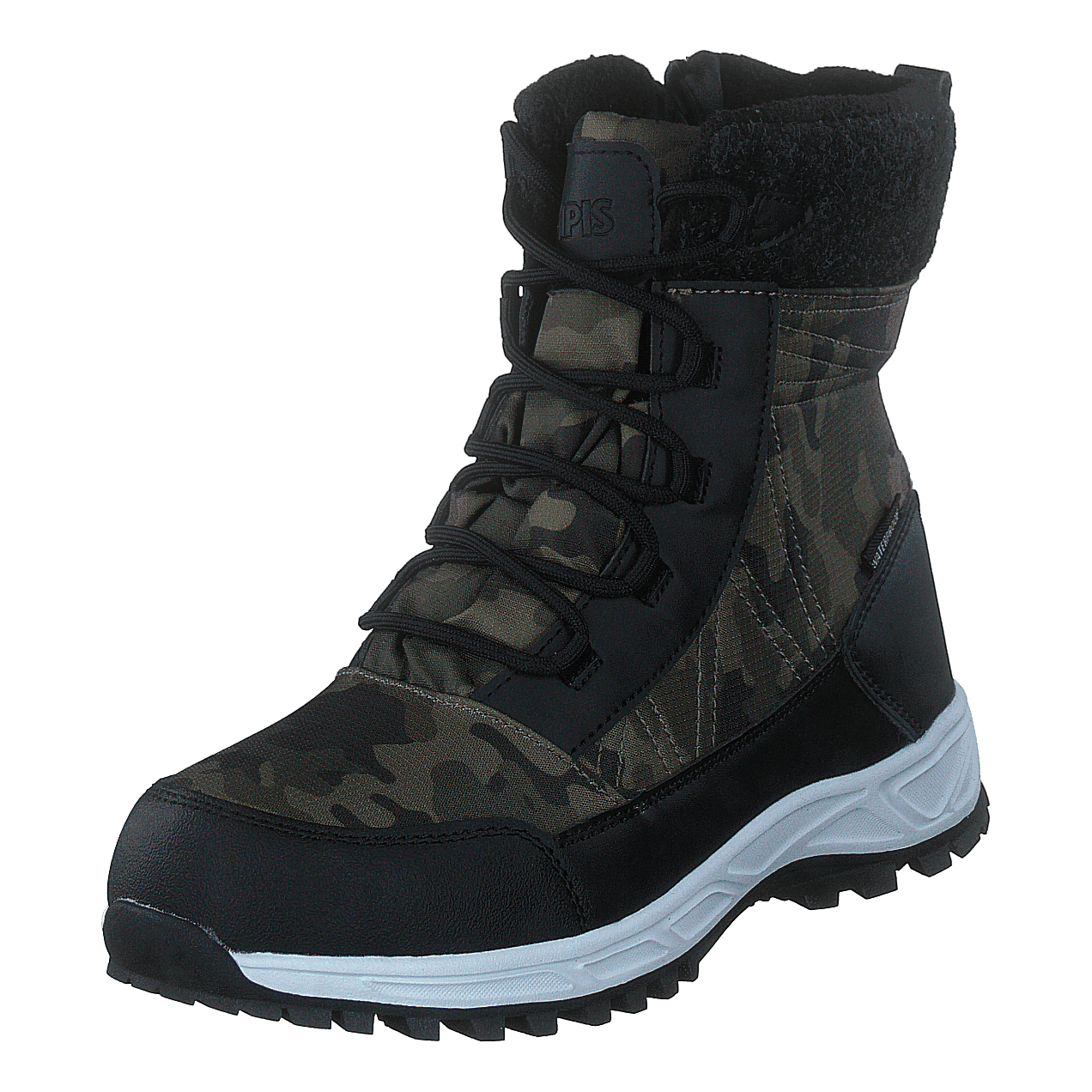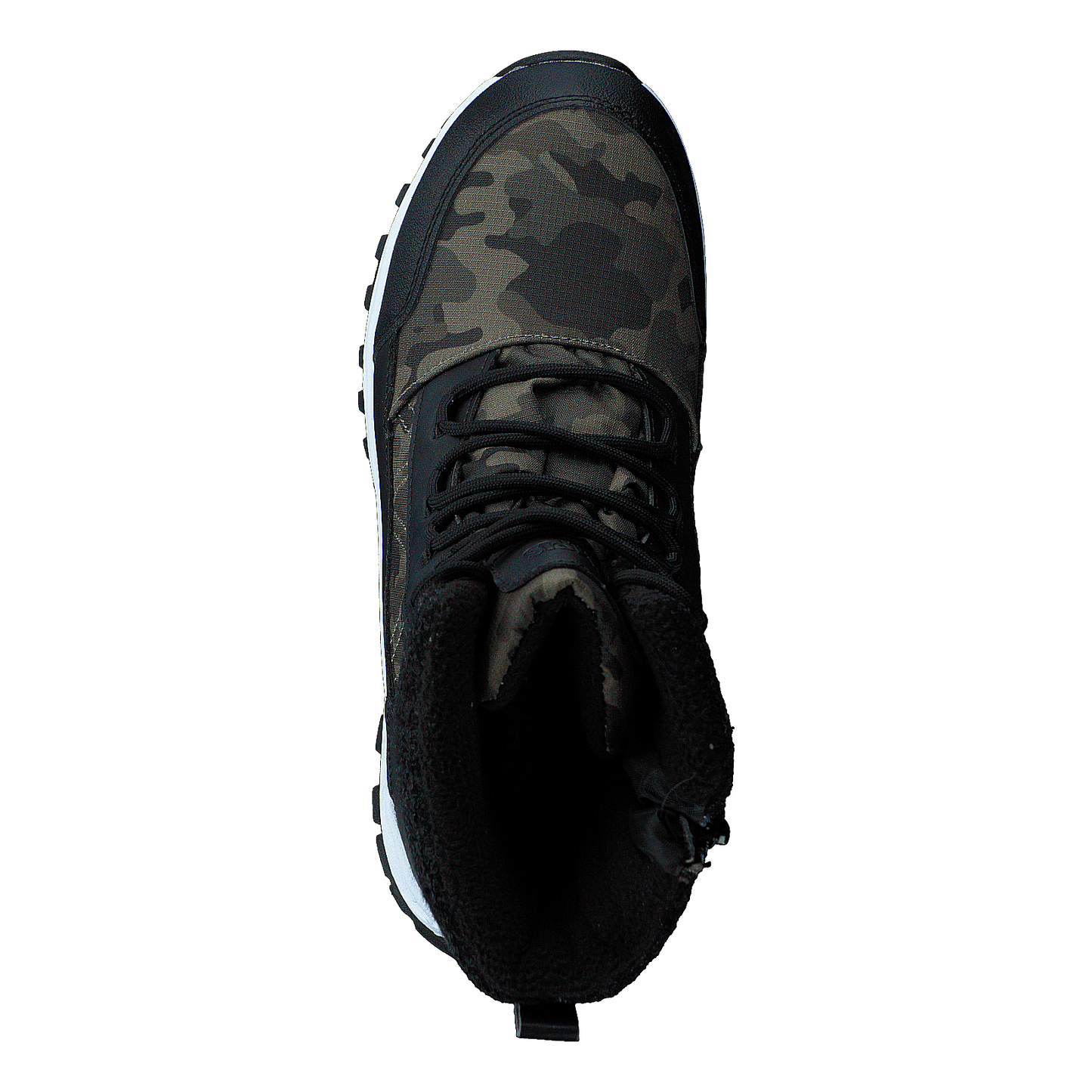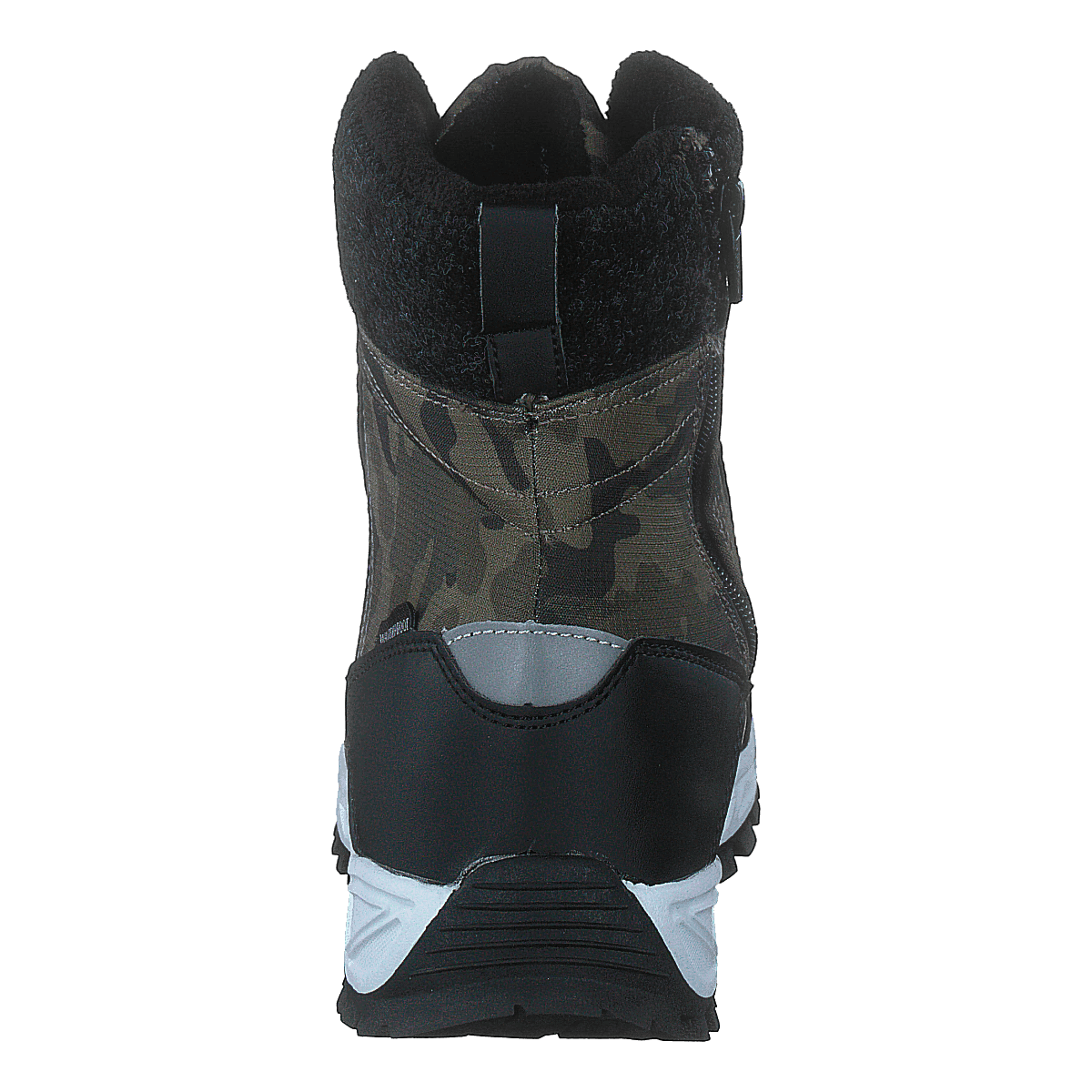 Rugged winter boot combining style and functionality. Features black waterproof upper with fuzzy collar, green and black camouflage mid-section, and chunky white sole for excellent traction. Lace-up design with metal eyelets ensures a secure fit. Reflective heel patch adds safety for low-light conditions. Ideal for cold weather and outdoor activities.