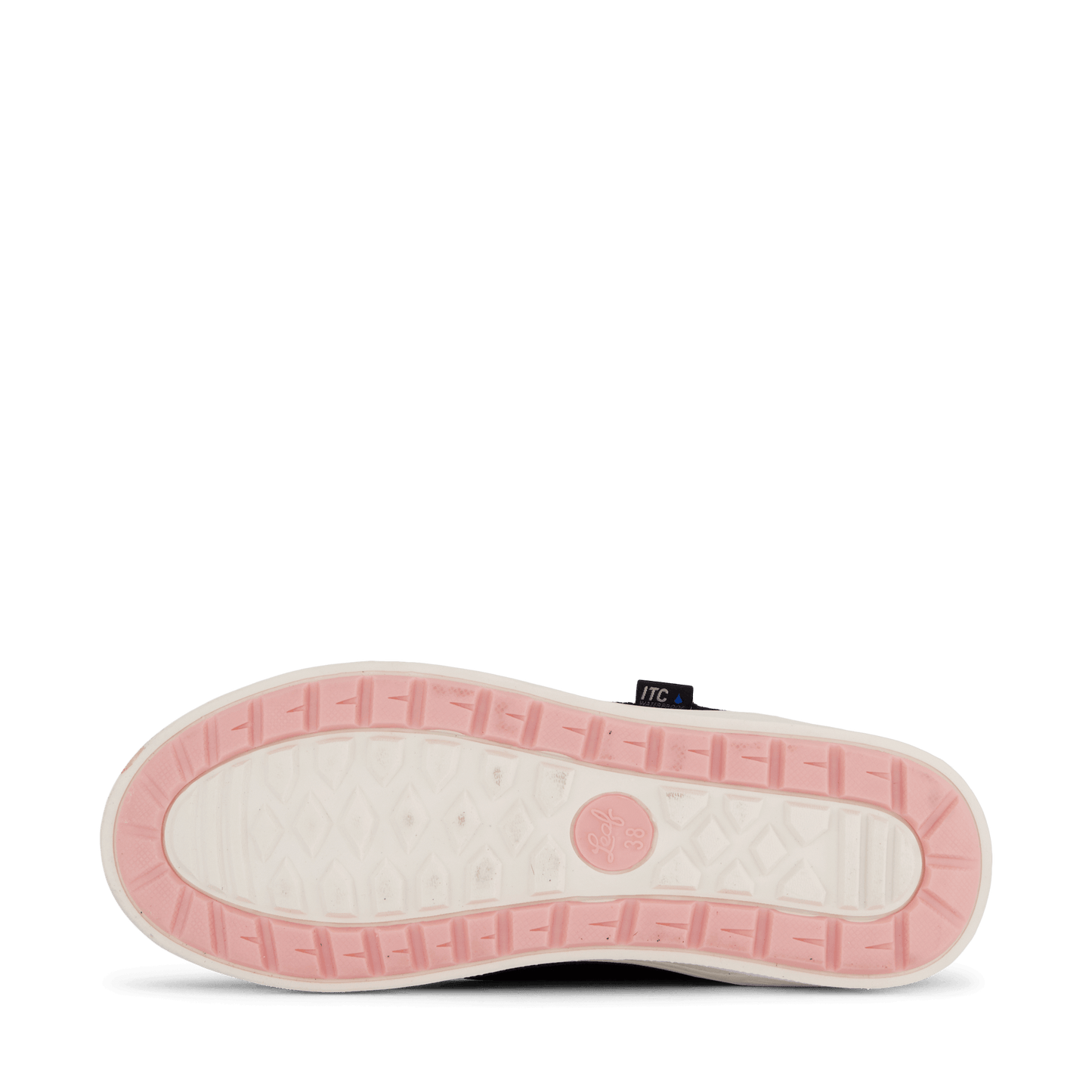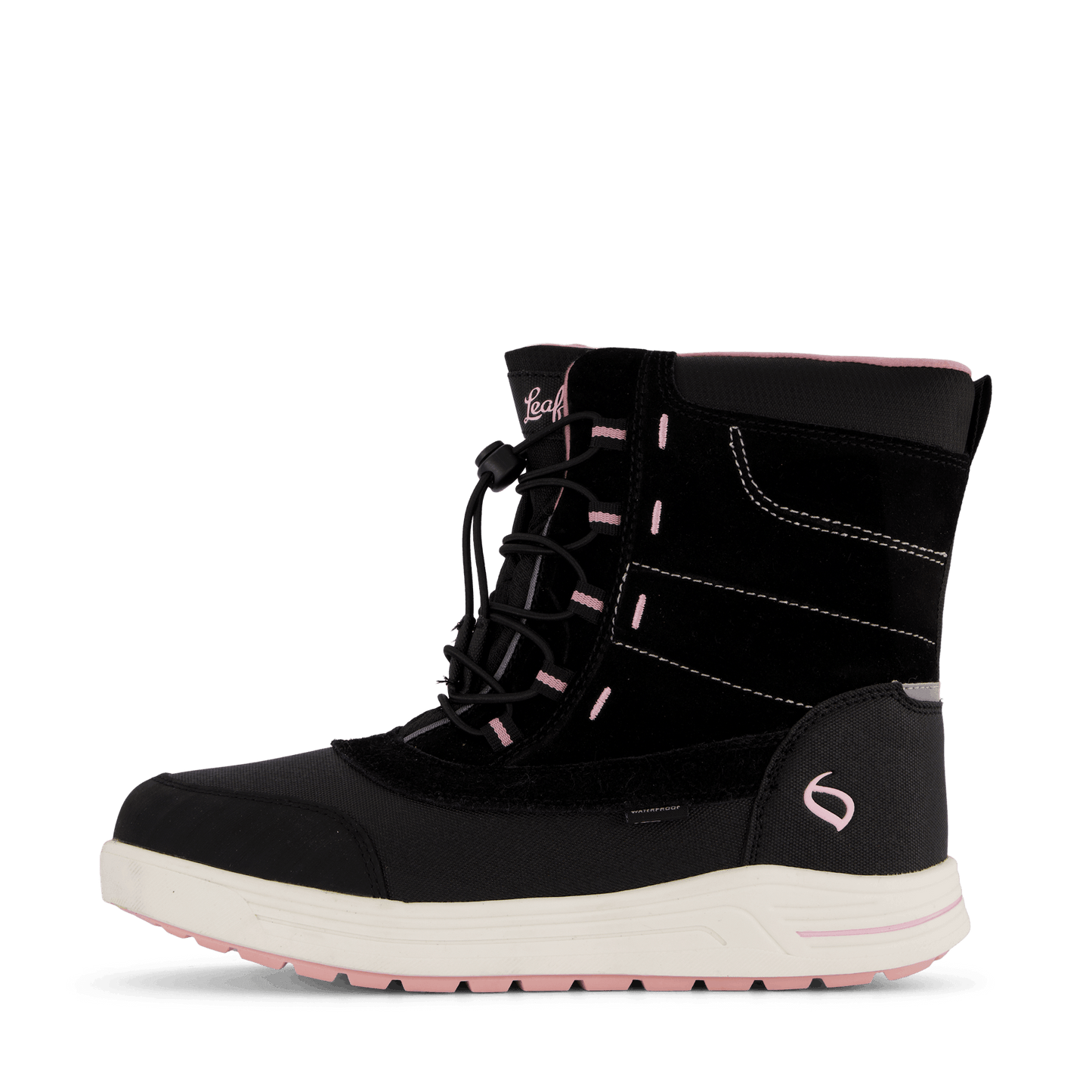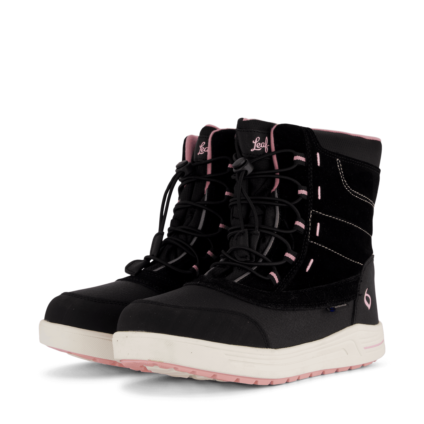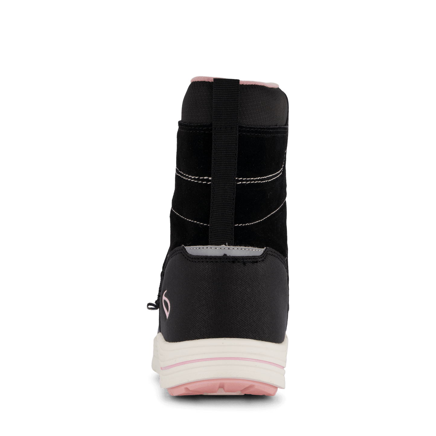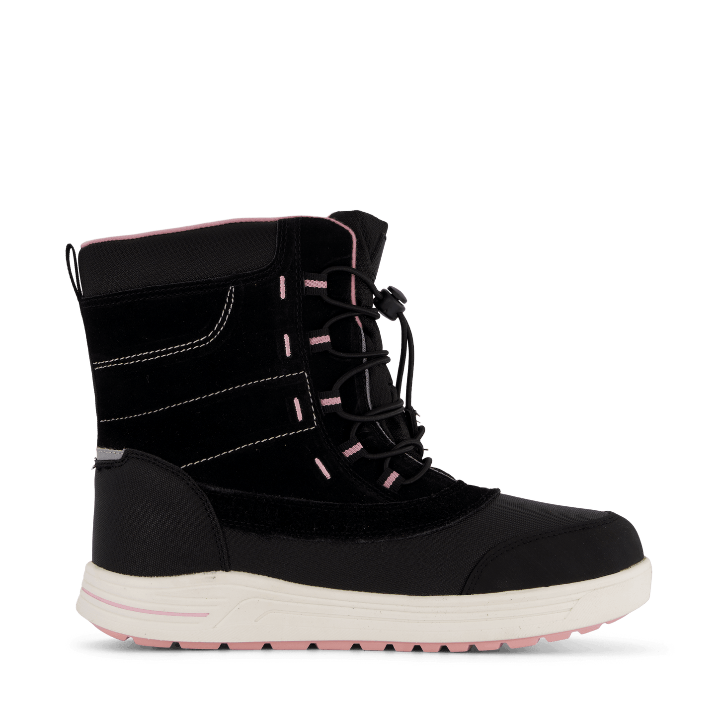 Stay stylish and warm with the Jaren Black/pink winter boot. This women's boot features a black suede/nubuck upper with pink accents, including pink-rimmed eyelets and a branded tongue. The lace-up design ensures a secure fit, while the thick, light-colored sole with pink detailing offers durability and protection in winter conditions.