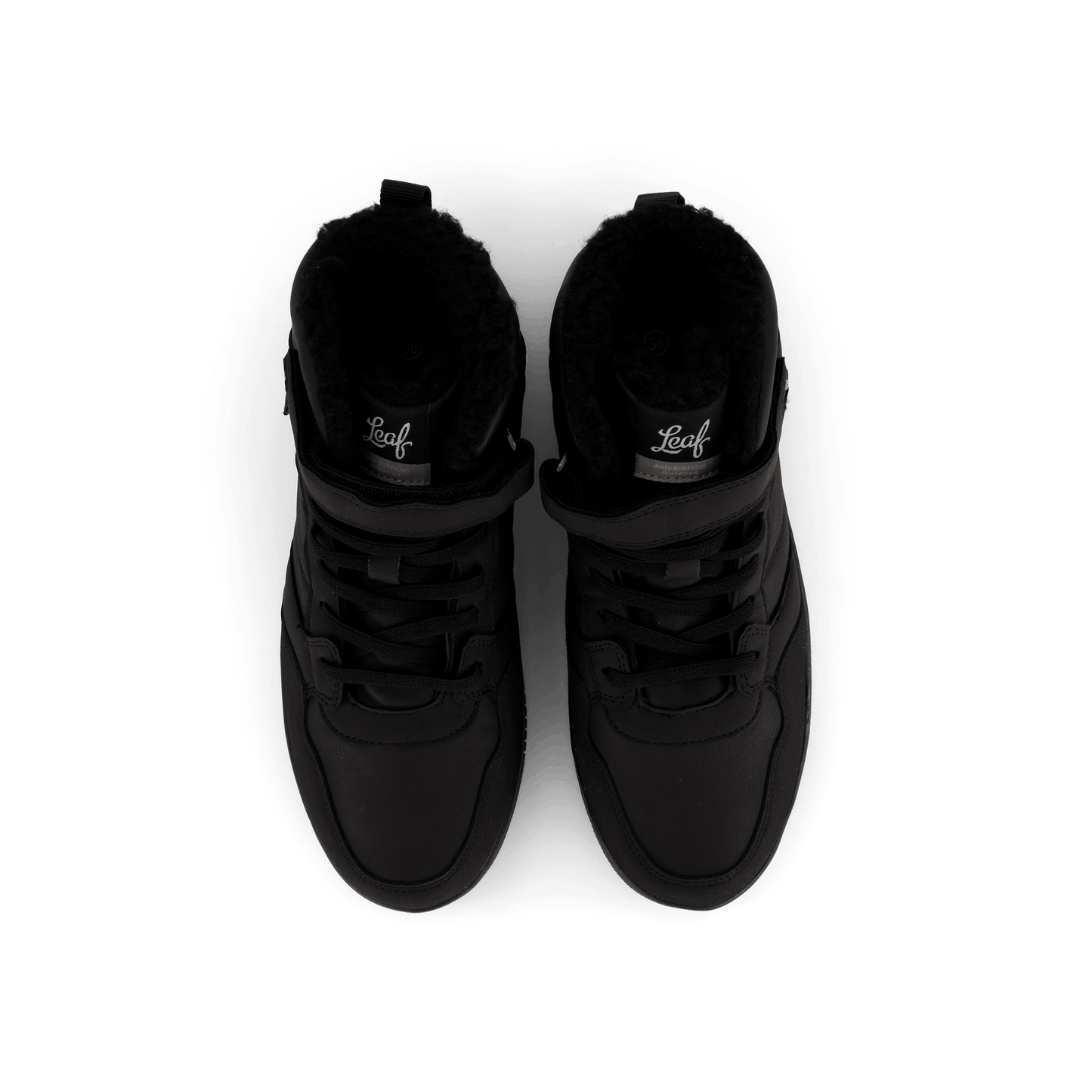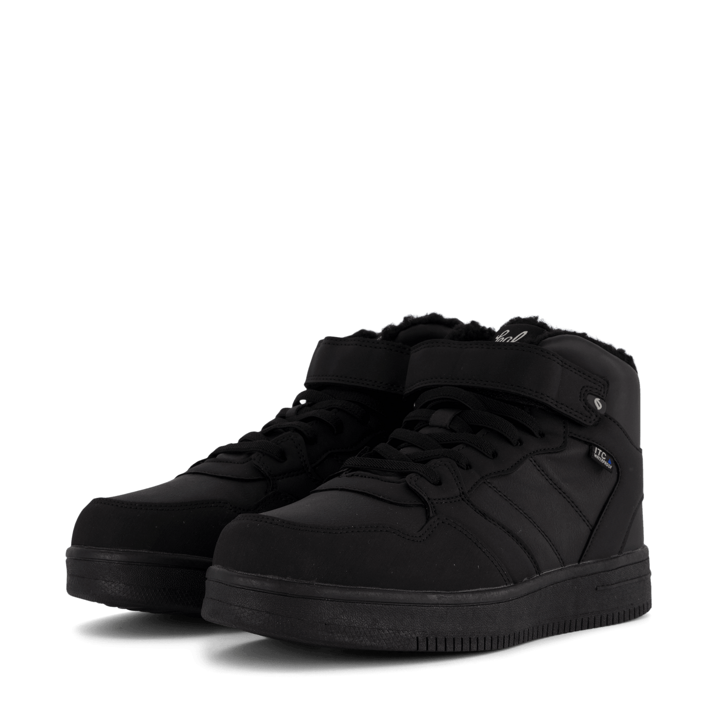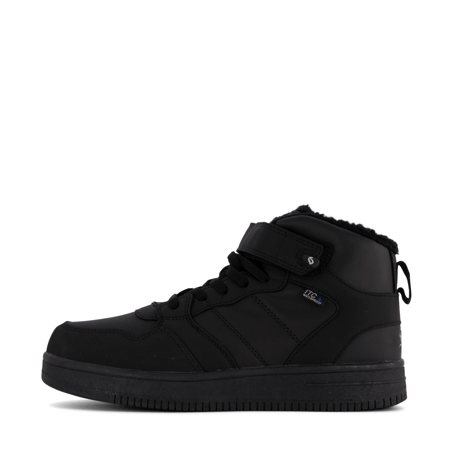 Step into sleek style with the Lojo Black high-top sneaker. This all-black leather-like shoe features a lace-up closure and velcro ankle strap for adjustable support. With a padded collar for comfort and a thick, flat sole, it's perfect for casual wear or light athletic activities. The minimalist design includes a small blue detail, possibly a logo or waterproof indicator.