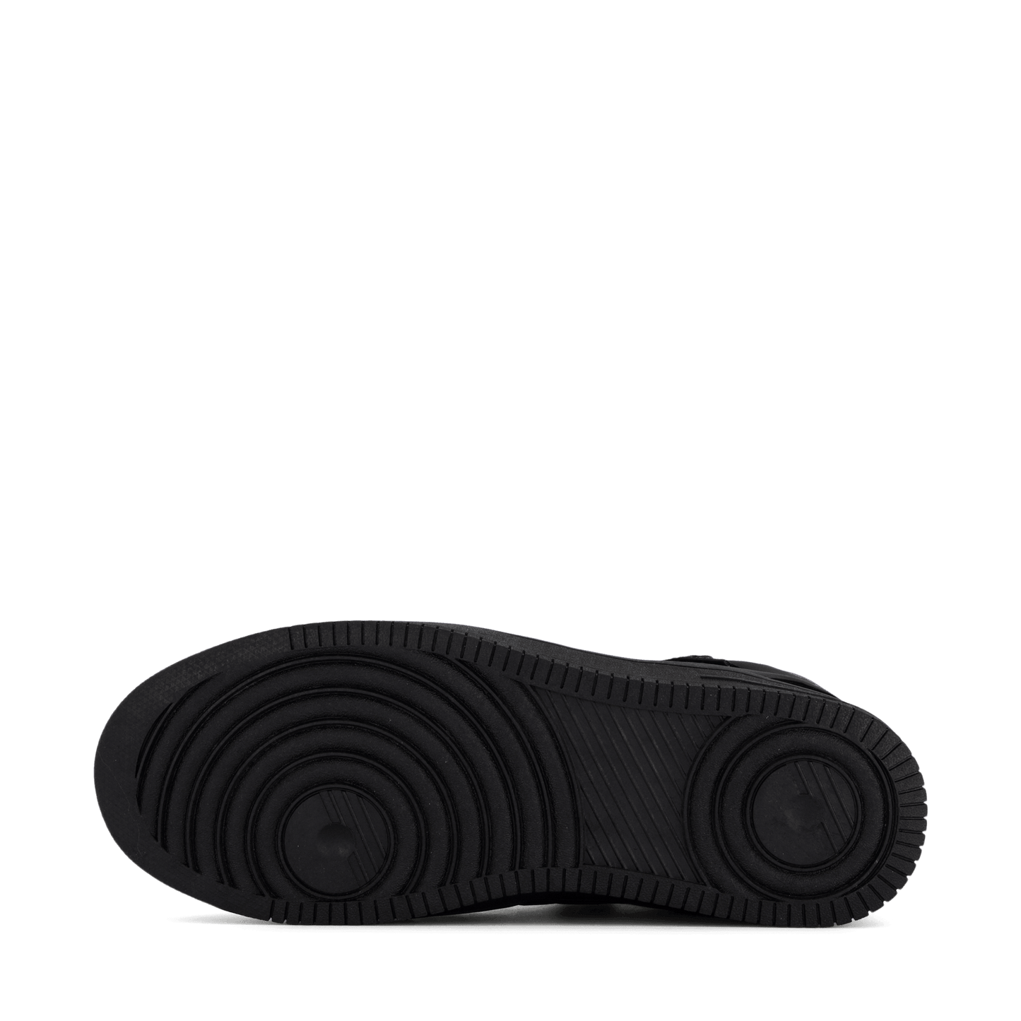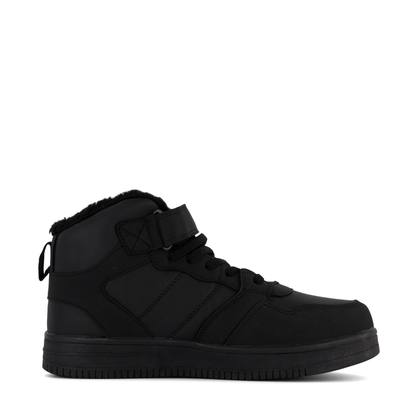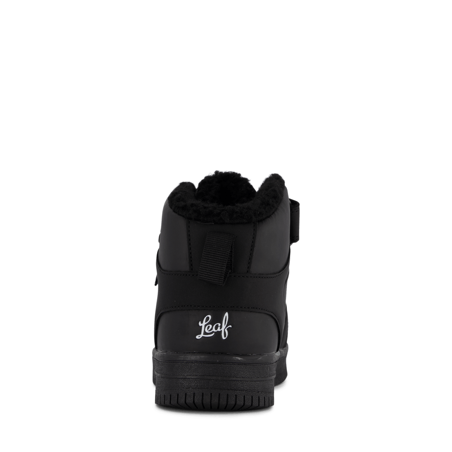Step into sleek style with the Lojo Black high-top sneaker. This all-black leather-like shoe features a lace-up closure and velcro ankle strap for adjustable support. With a padded collar for comfort and a thick, flat sole, it's perfect for casual wear or light athletic activities. The minimalist design includes a small blue detail, possibly a logo or waterproof indicator.