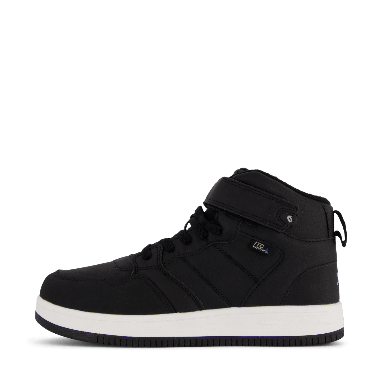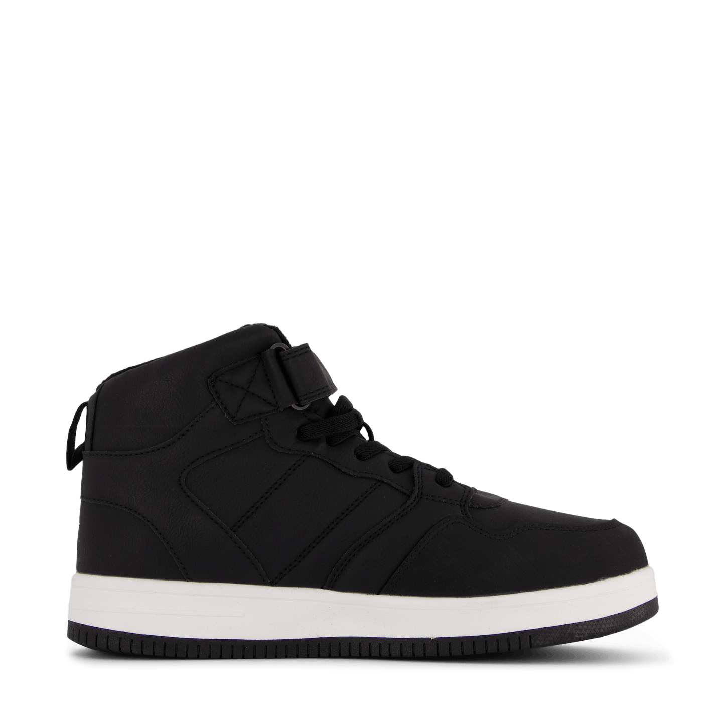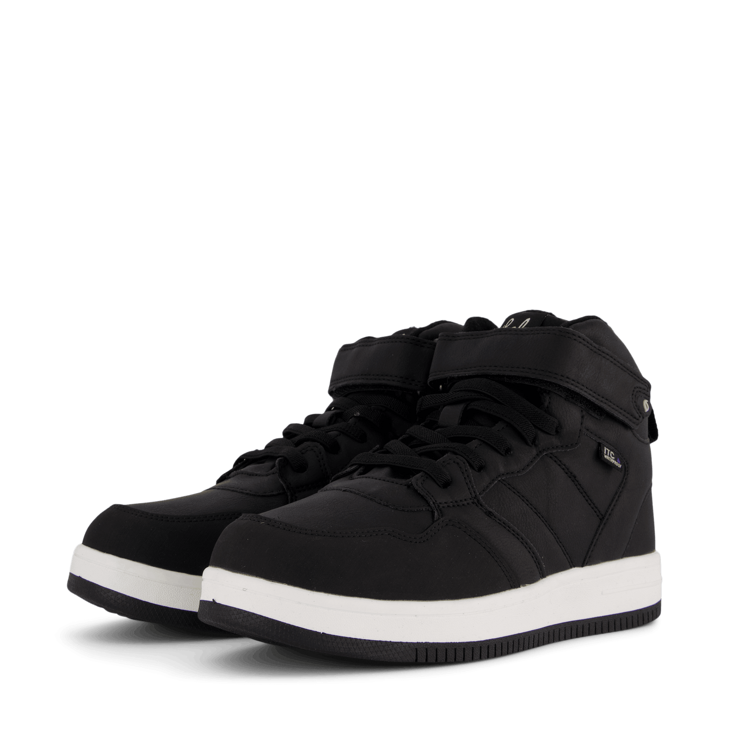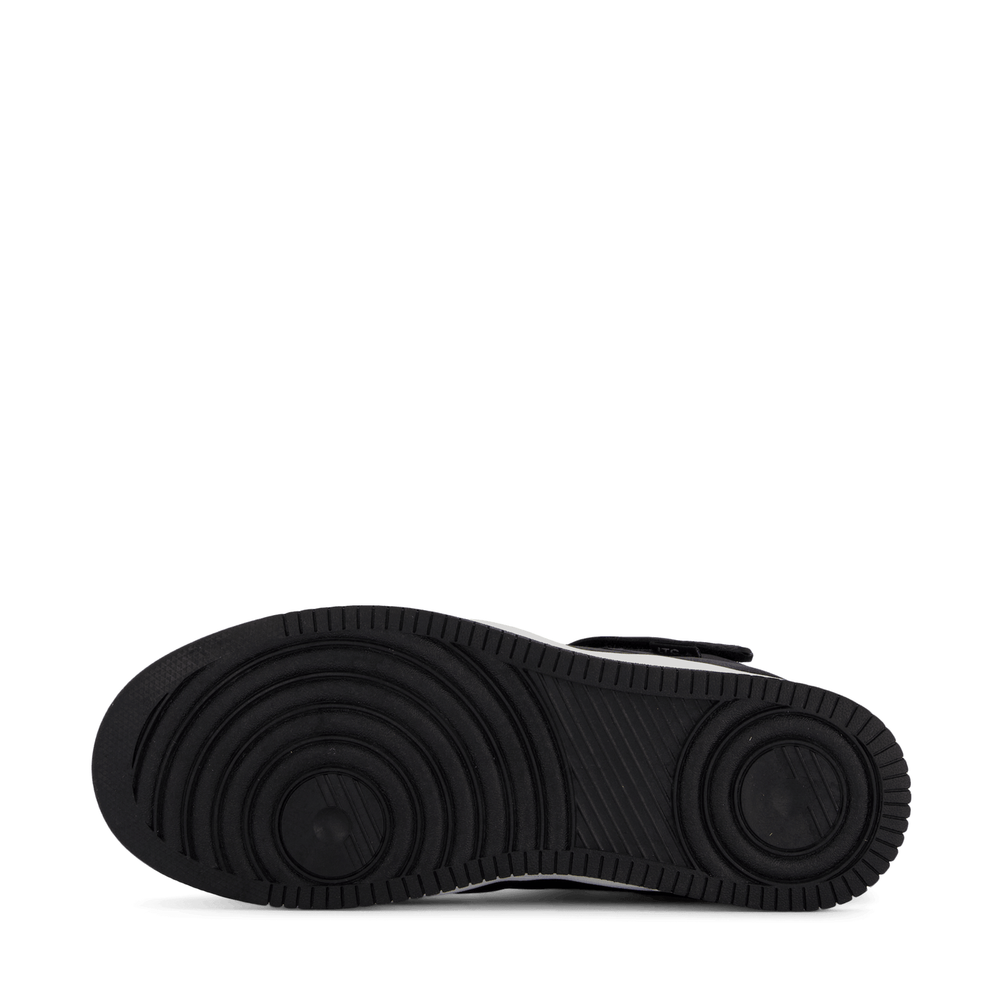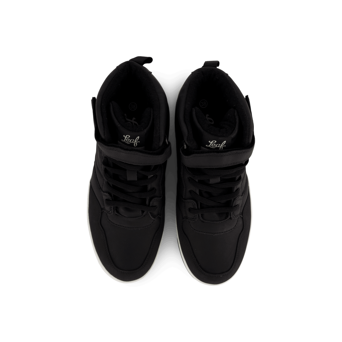 The Omne Black high-top sneaker combines style and functionality with its sleek leather upper and modern design. Featuring a supportive velcro ankle strap, traditional laces, and a contrasting white platform midsole, this versatile shoe offers both comfort and contemporary aesthetics. Its minimalist black colorway ensures easy pairing with various outfits, making it suitable for casual wear and light athletic activities.