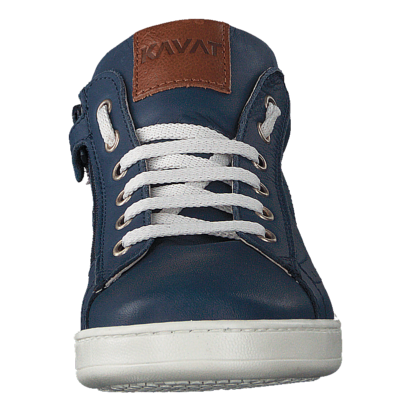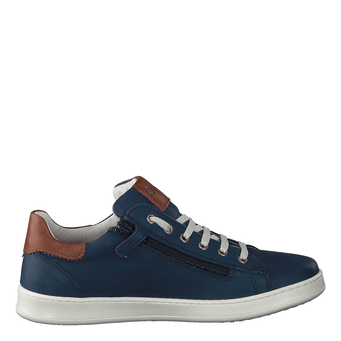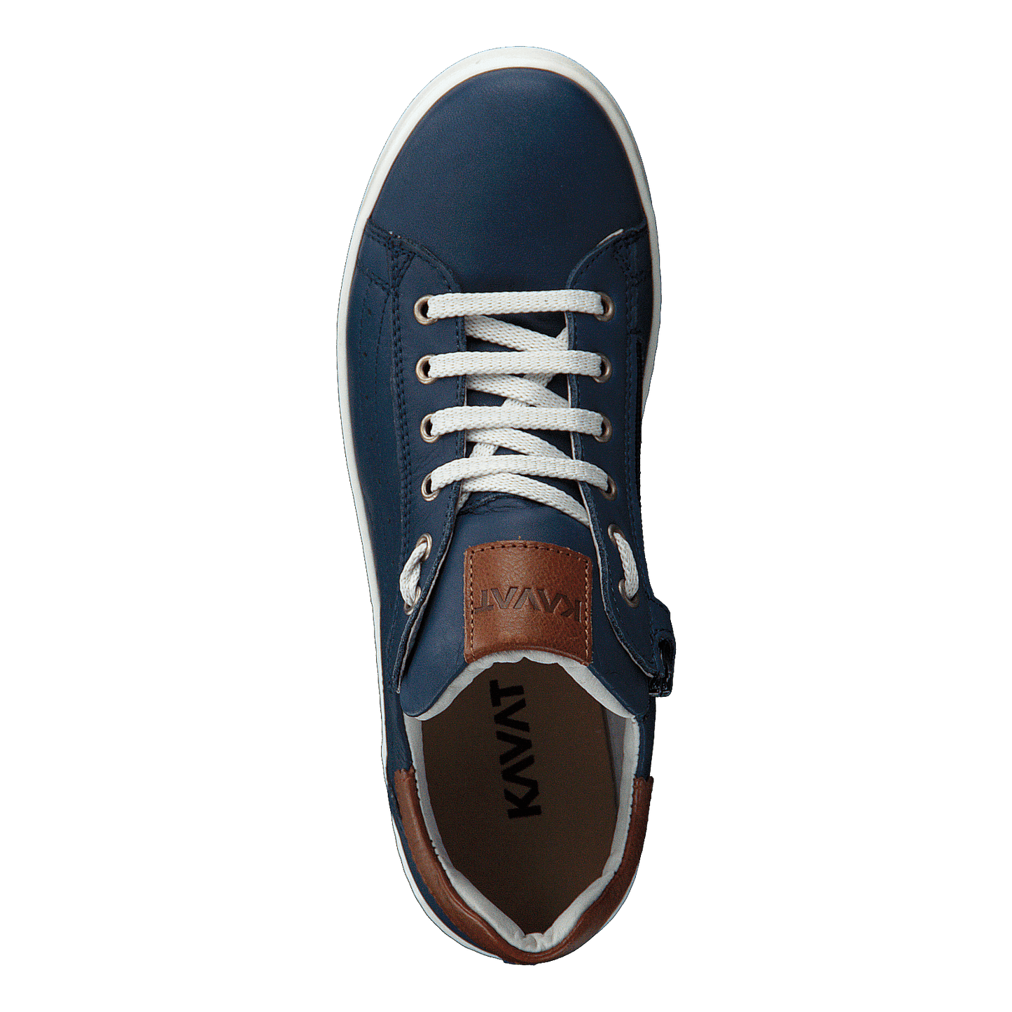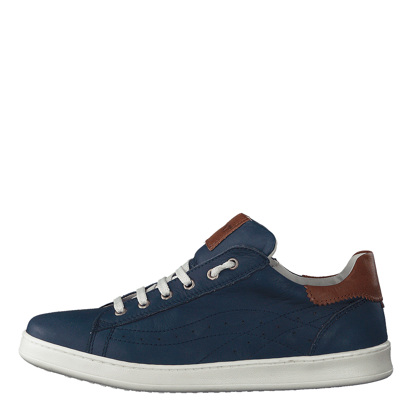 Mellby Blue is a versatile, low-top sneaker featuring a sleek navy leather upper with white laces and silver eyelets. The shoe combines sporty elements like side perforations with classic touches, including a brown leather heel accent. Its round toe and flexible design offer comfort, while the white sole completes the stylish, minimalist look suitable for various casual occasions.