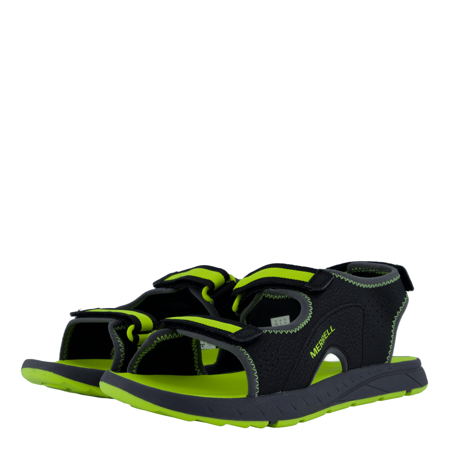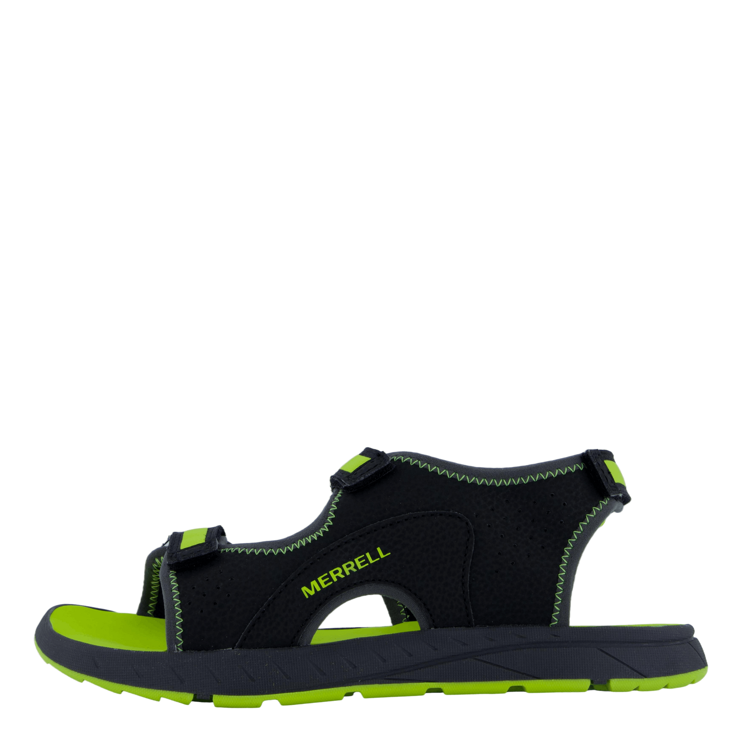 Merrell's Panther Sandal 3.0 in Black/Hi Viz combines style and functionality for outdoor enthusiasts. Featuring a breathable synthetic upper with adjustable velcro straps, this sporty sandal offers a customizable fit. The striking contrast of black and vibrant lime green accents, along with a durable rubber sole, ensures both comfort and eye-catching appeal for active wear or casual outdoor use.