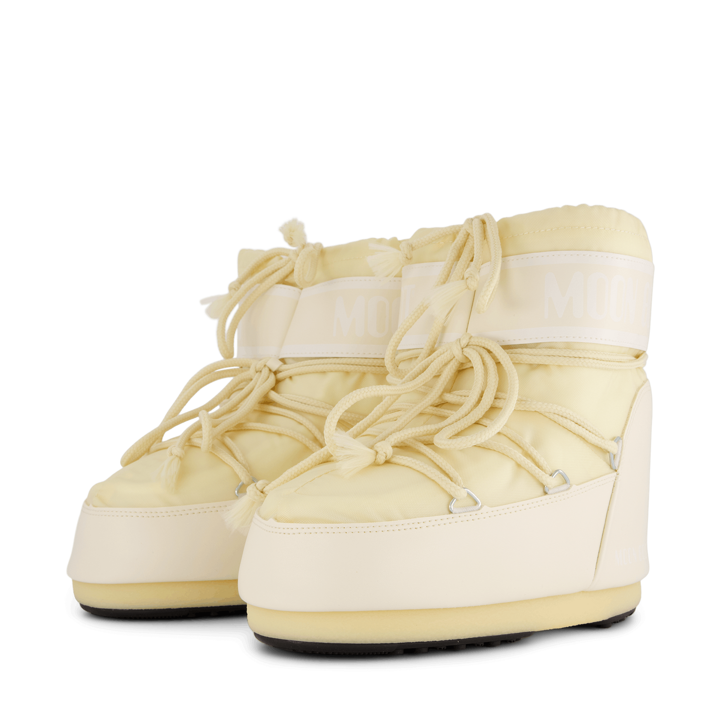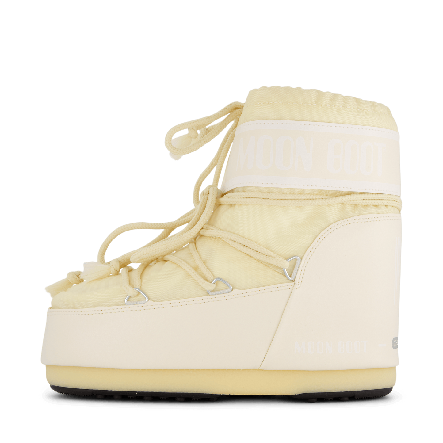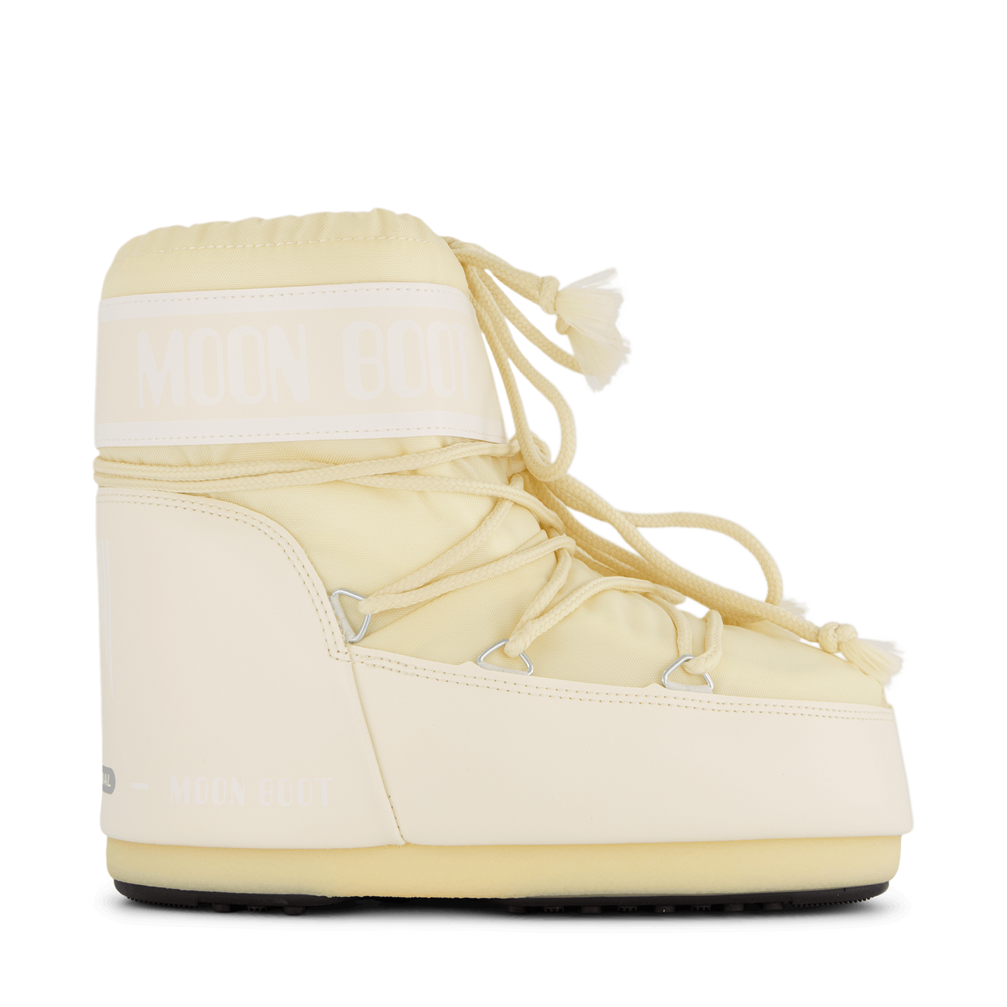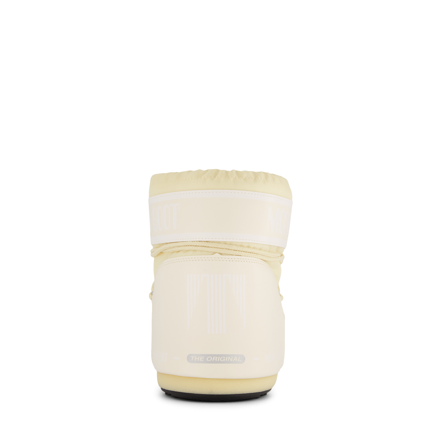Experience winter style with the Icon Low 2 Cream boot from Moon Boot. This sleek, monochromatic design features a soft textile upper and durable rubber sole, offering both fashion and functionality. The cream-colored boot boasts a distinctive rounded silhouette, lace-up closure with metal D-rings, and a branded ankle band, perfect for cold weather comfort and modern aesthetics.