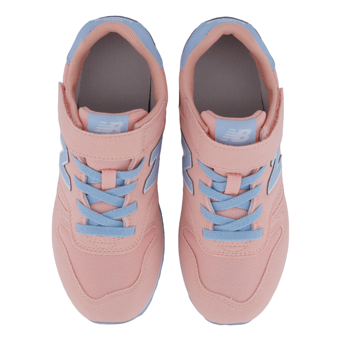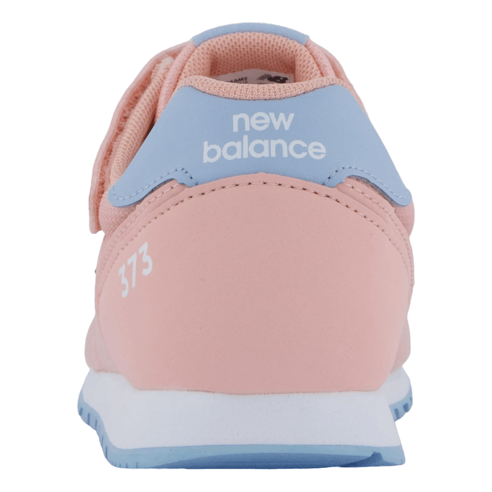 New Balance 373 kids' sneakers blend style and comfort with a soft pink suede and mesh upper, accented by light blue details. Featuring a Velcro strap and bungee laces for easy wear, these low-top shoes offer a secure fit for active children. The white sole complements the pastel aesthetic, making these versatile for casual and light athletic use.