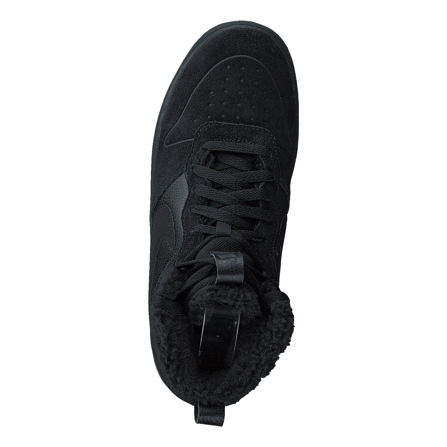 Nike's Court Borough Mid 2 in all-black offers a sleek, modern take on basketball-inspired footwear. This high-top sneaker features suede leather construction with a textured fabric collar for added comfort. The lace-up closure, metal eyelets, and subtle Nike swoosh logo blend seamlessly into the monochromatic design. A durable rubber midsole and soft interior lining complete this versatile, urban-style shoe.