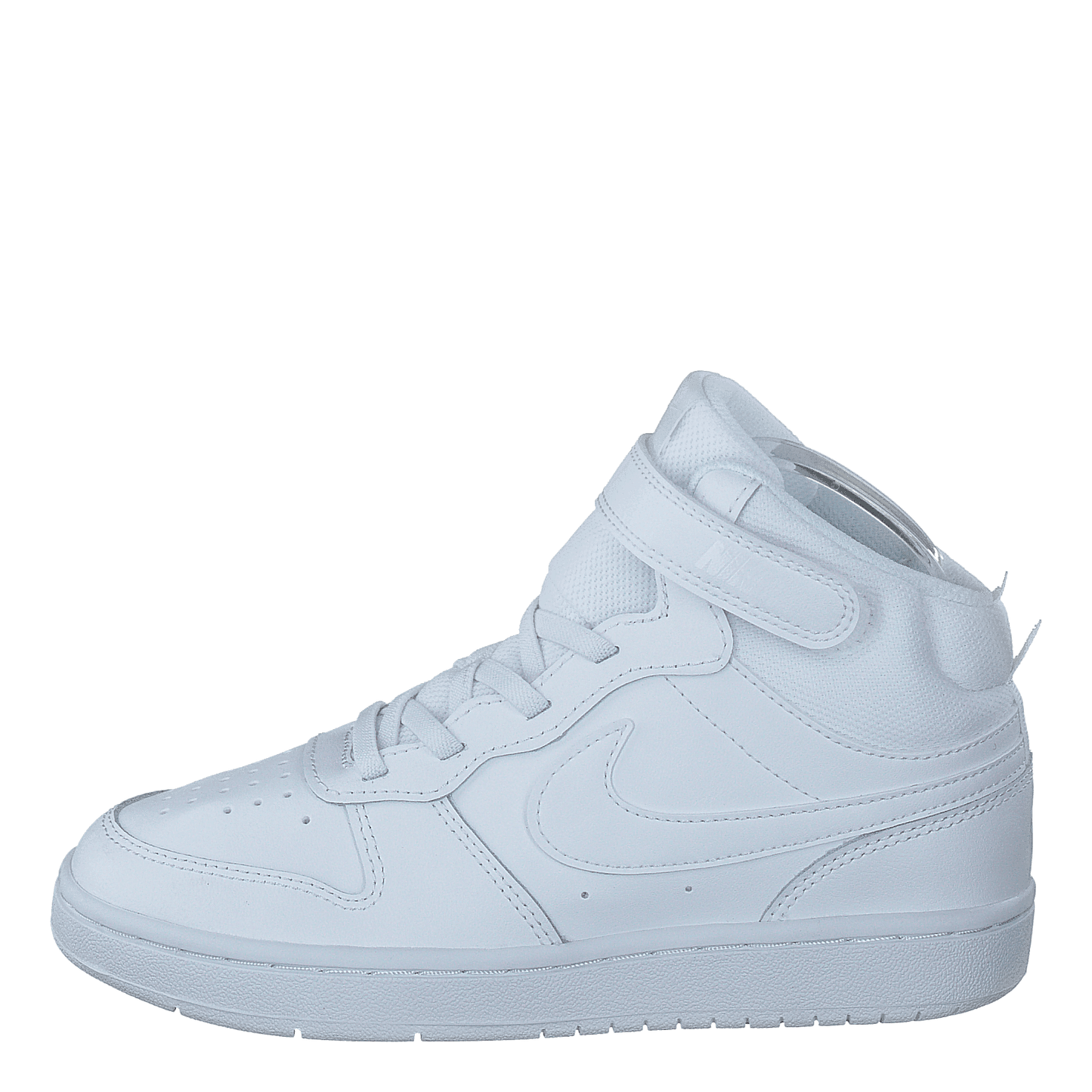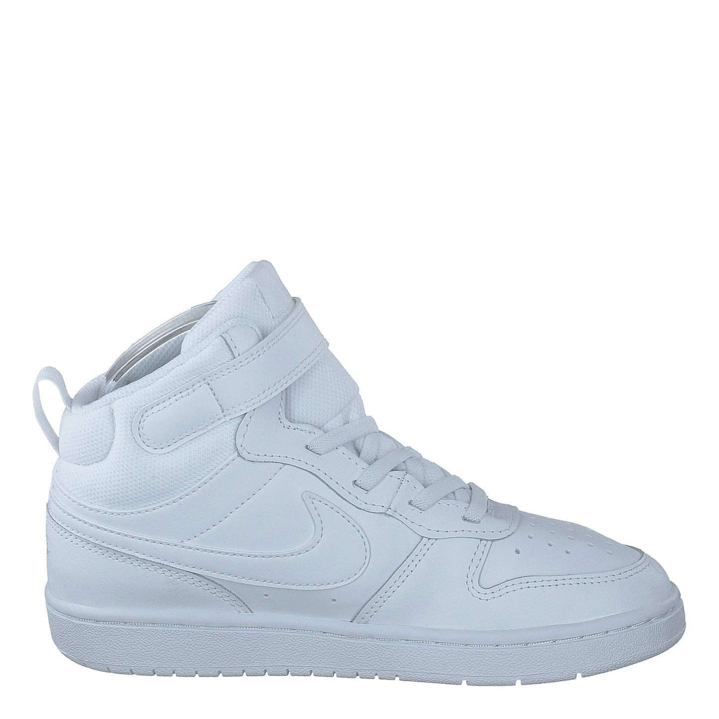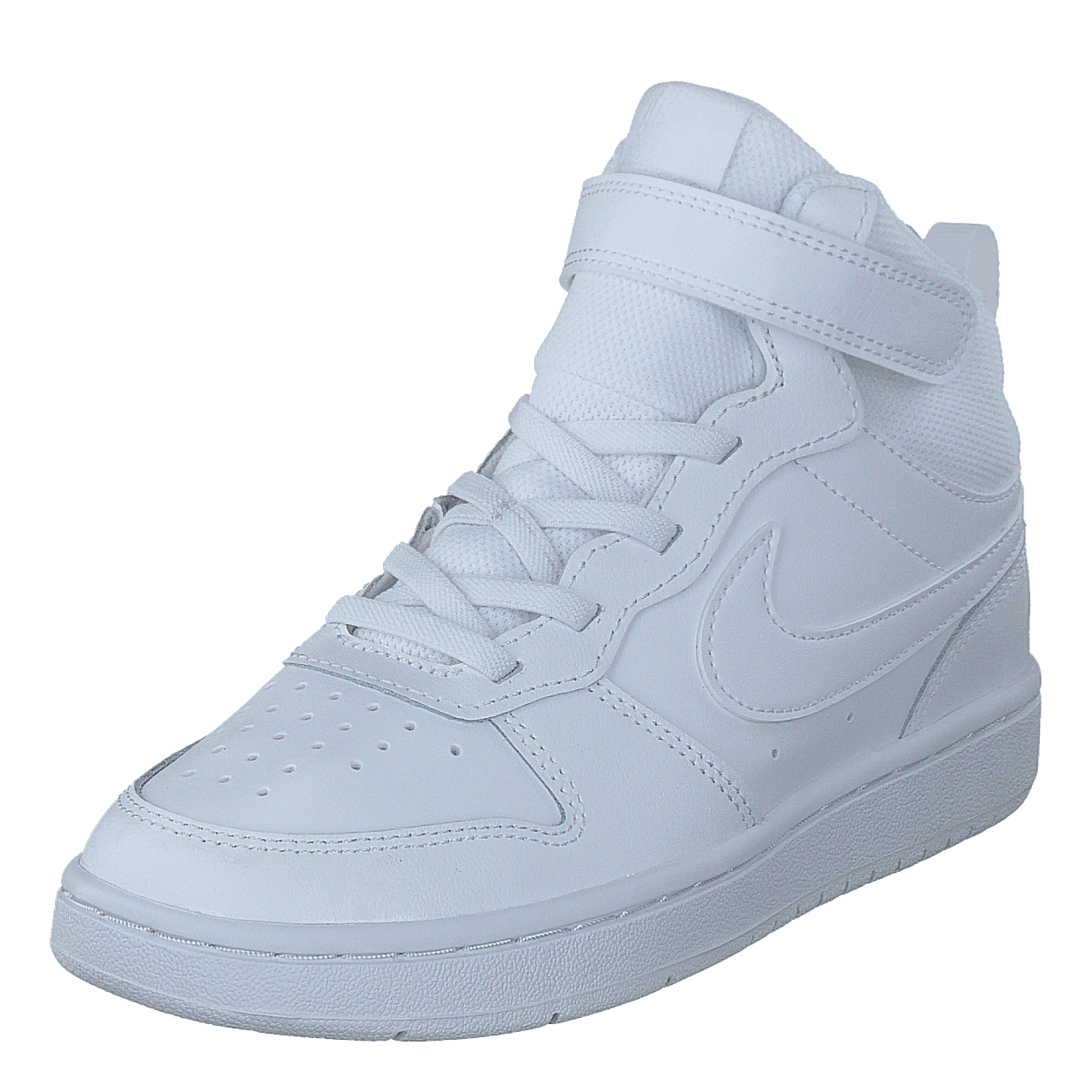 Nike's Court Borough Mid 2 offers a classic all-white look for little kids. This mid-top sneaker features durable leather construction, a breathable perforated toe area, and a combination of laces and velcro strap for easy on-off and secure fit. The iconic Nike swoosh and sporty design make it versatile for everyday wear and light activities.