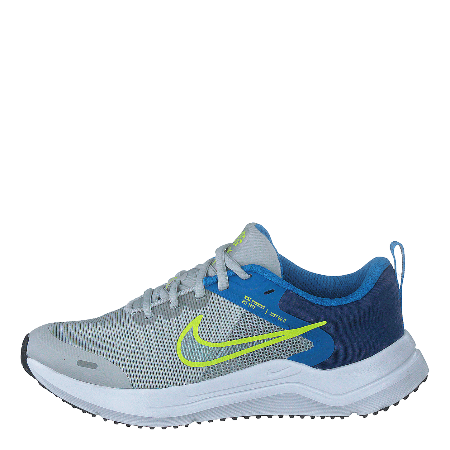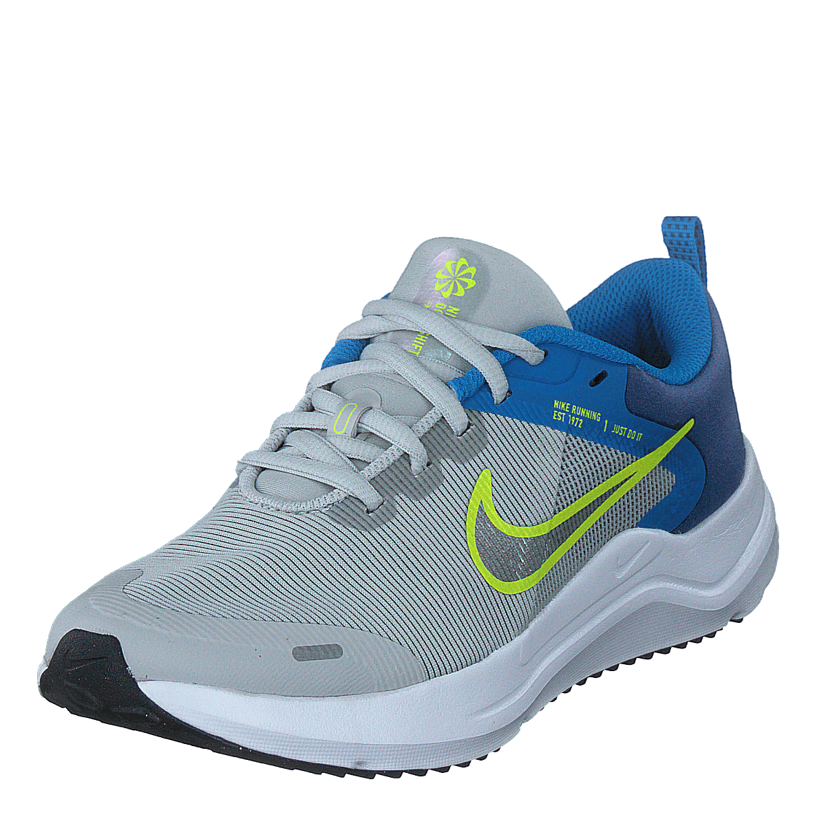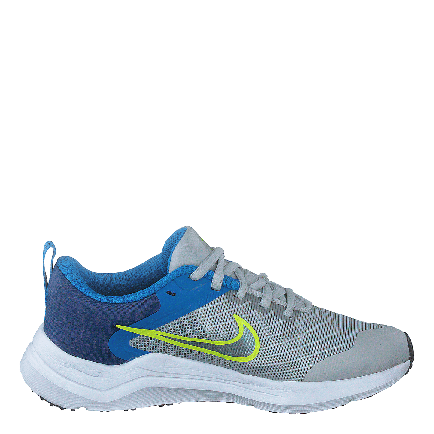 Nike's Downshifter 12 GS running shoe combines style and performance. Featuring a breathable grey mesh upper with vibrant blue and neon green accents, this sleek design offers both ventilation and visual appeal. The white midsole provides cushioning, while the streamlined silhouette ensures a lightweight feel. Ideal for athletic activities or casual wear.