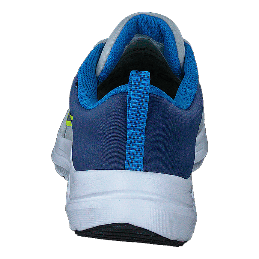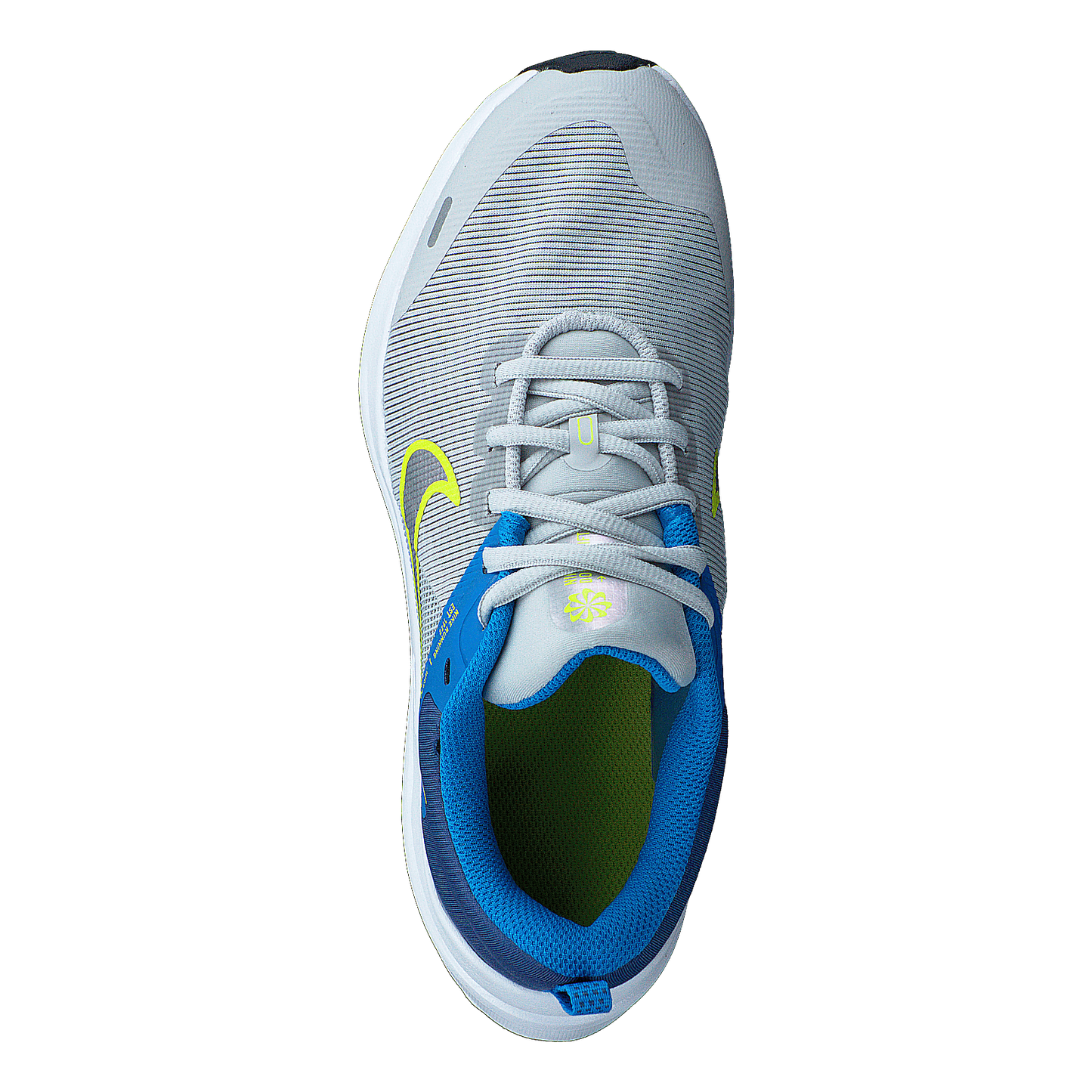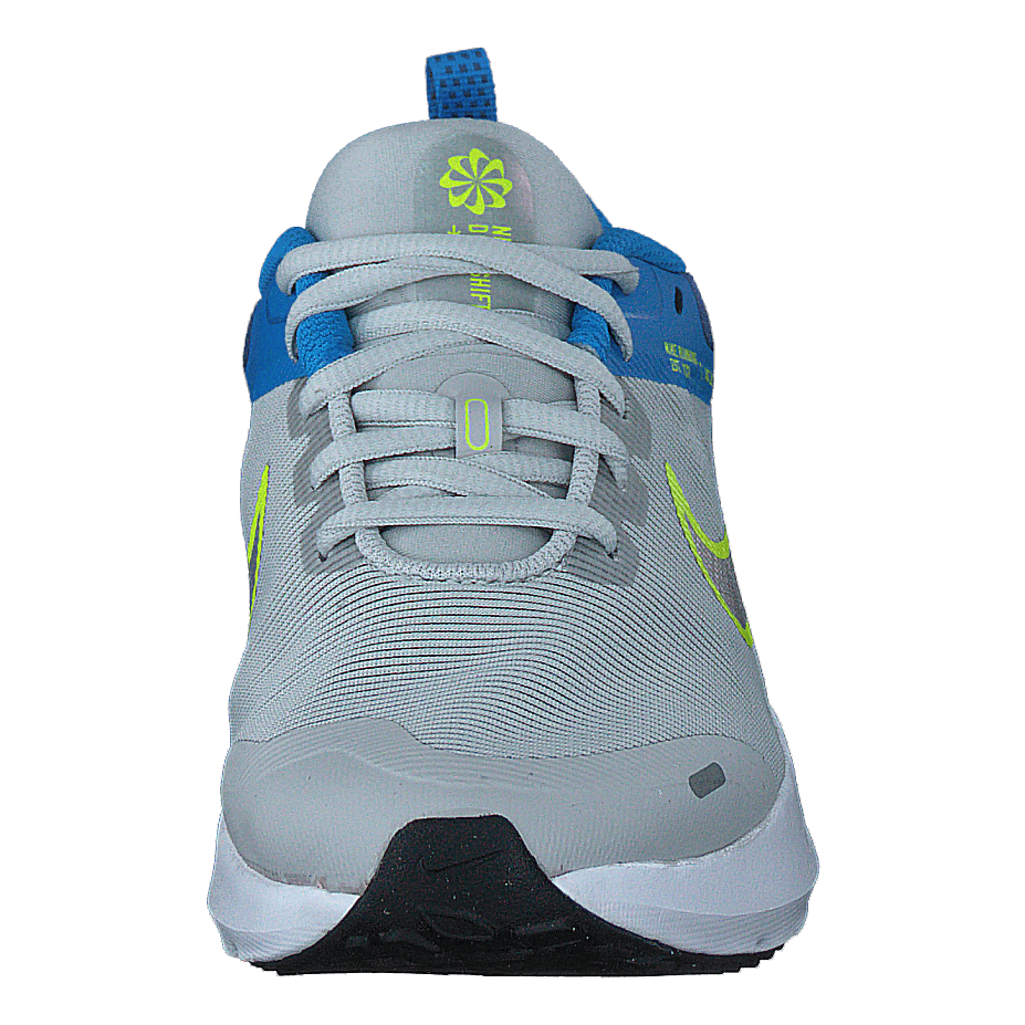Nike's Downshifter 12 GS running shoe combines style and performance. Featuring a breathable grey mesh upper with vibrant blue and neon green accents, this sleek design offers both ventilation and visual appeal. The white midsole provides cushioning, while the streamlined silhouette ensures a lightweight feel. Ideal for athletic activities or casual wear.