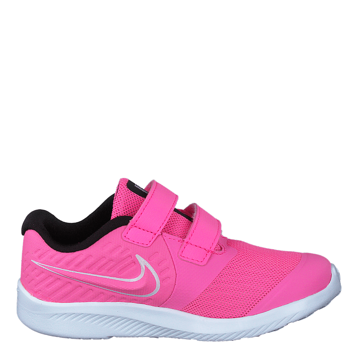 Nike Star Runner 2 Tdv kids' shoe in vibrant pink features a breathable mesh upper with synthetic overlays for support. Easy-on velcro straps replace laces, ideal for small feet. Padded collar and tongue enhance comfort, while the curved white rubber sole offers flexibility. A black Nike swoosh adds a stylish touch to this sporty, eye-catching design.