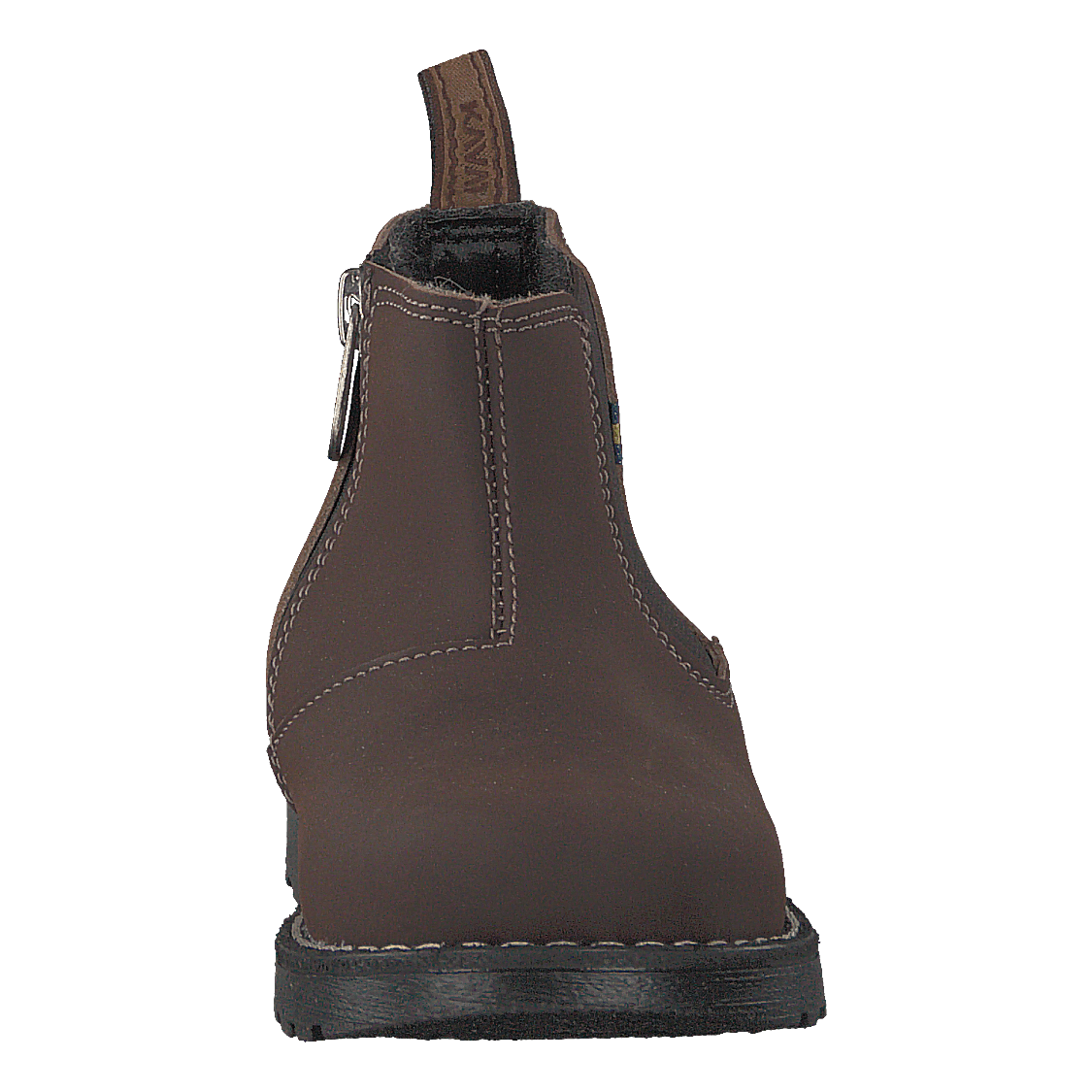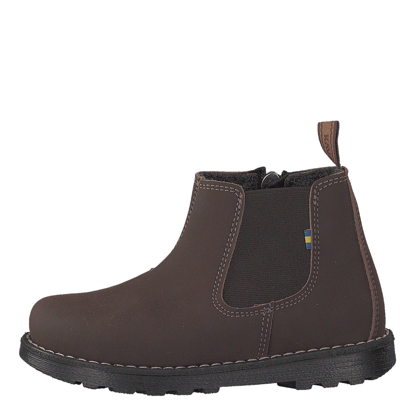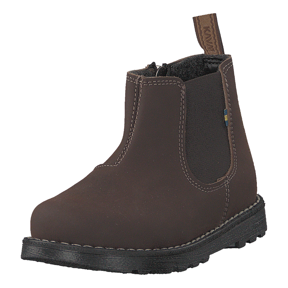 Nymölla Xc is a comfortable Chelsea boot for young children, crafted from durable, water-repellent European leather. Features include a practical inner zipper for easy on/off, warm wool fleece lining, and a shock-absorbing insole. The dark brown boot boasts a grip-friendly rubber outsole, elastic side panels, and is free from fluorocarbons, making it both stylish and functional.