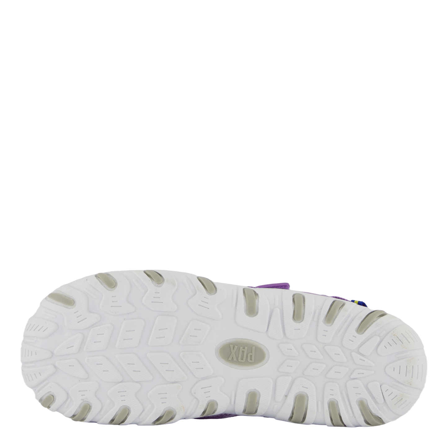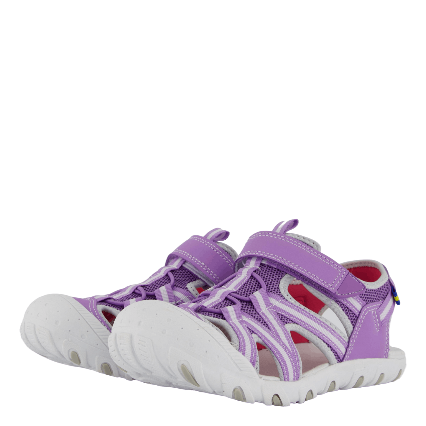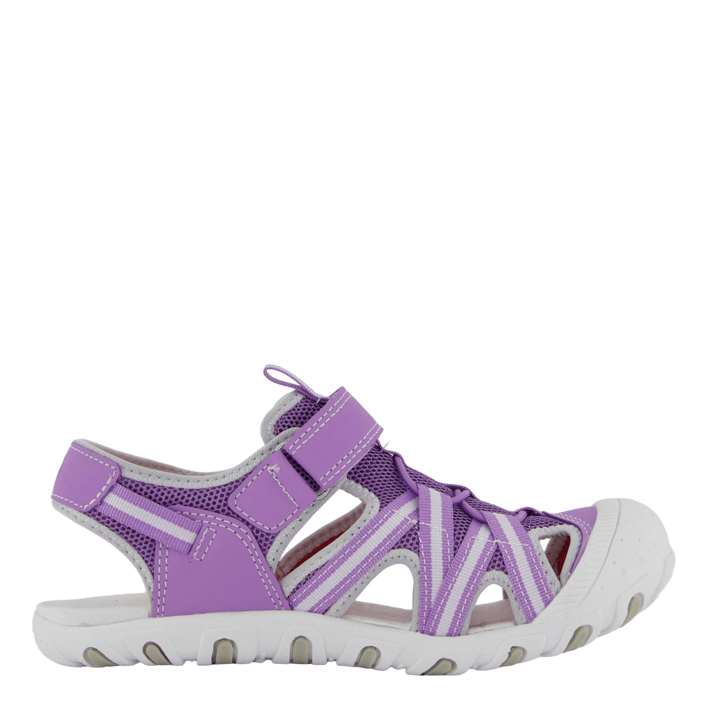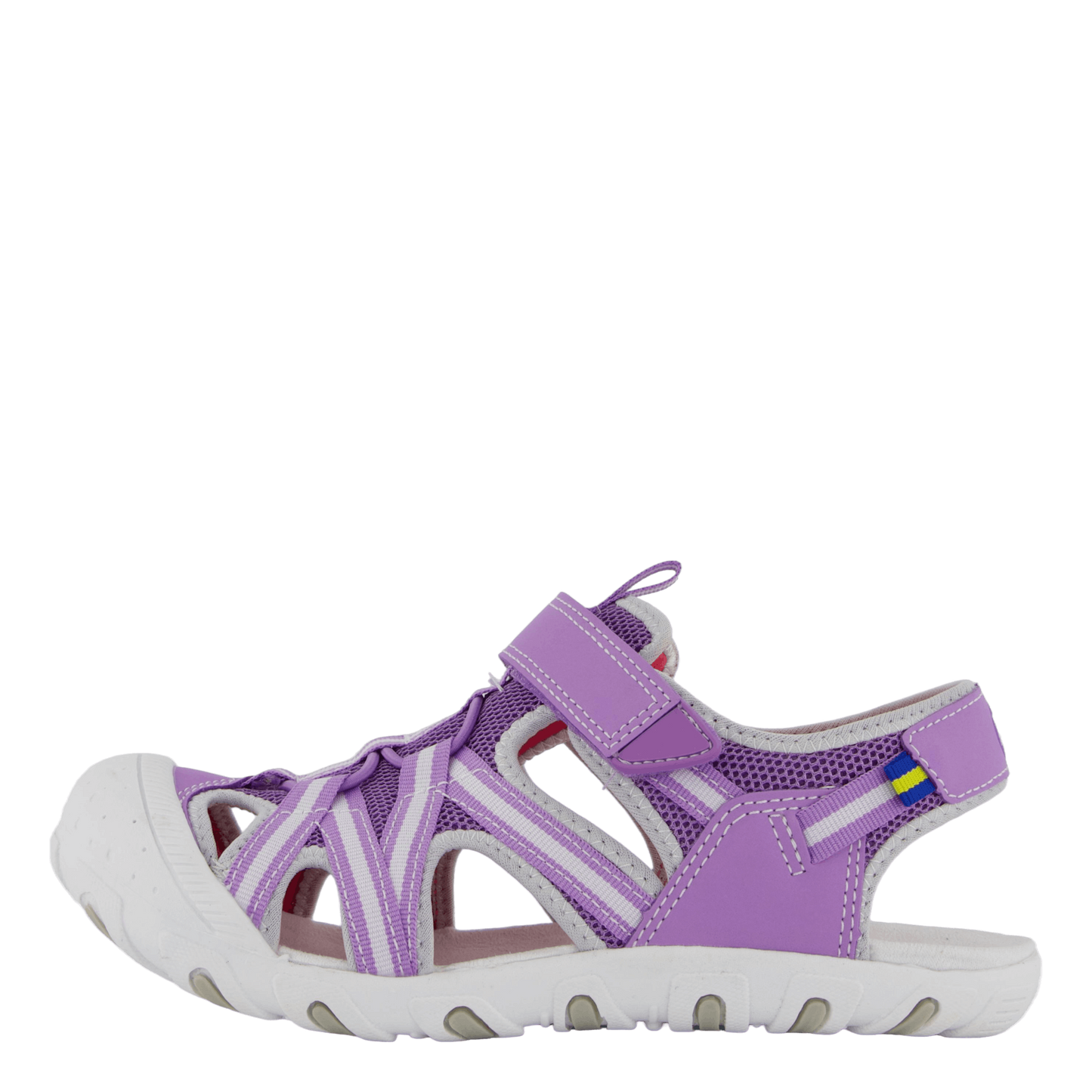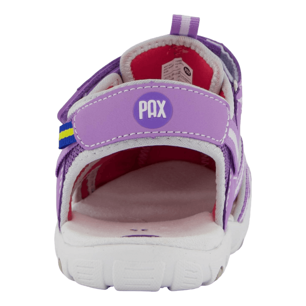 Discover comfort and style with these Cloudi Purple children's sandals by Pax. Featuring a soft lavender hue with white accents, these closed-toe sandals offer protection and breathability. The adjustable velcro strap ensures a secure fit, while the durable rubber sole provides excellent grip. Perfect for active kids, these sandals combine sporty design with practicality for outdoor adventures and water activities.