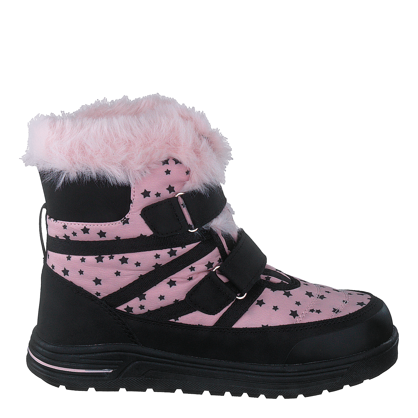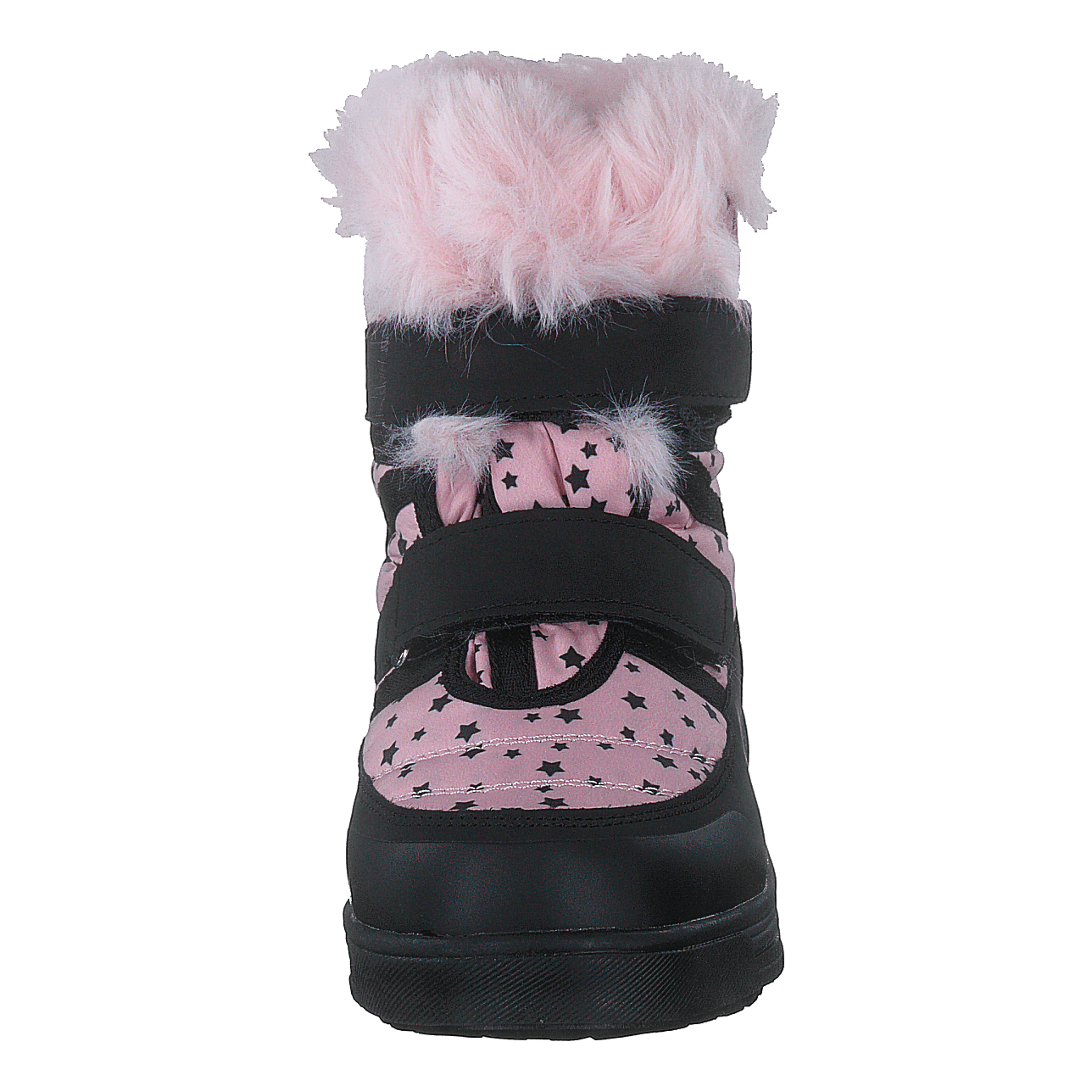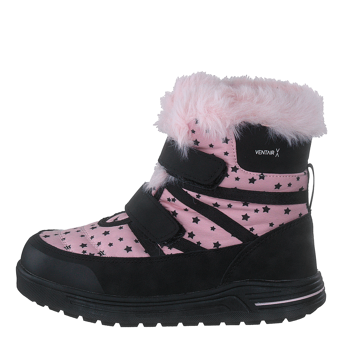 Stylish and functional, these children's winter boots feature a black and pink design with a playful star pattern. The thick rubber sole provides winter protection, while two Velcro straps ensure a secure fit. Pink faux fur lining offers warmth and comfort. The VENTAIR technology combines with a sporty yet cute design, perfect for young girls needing practical winter footwear.