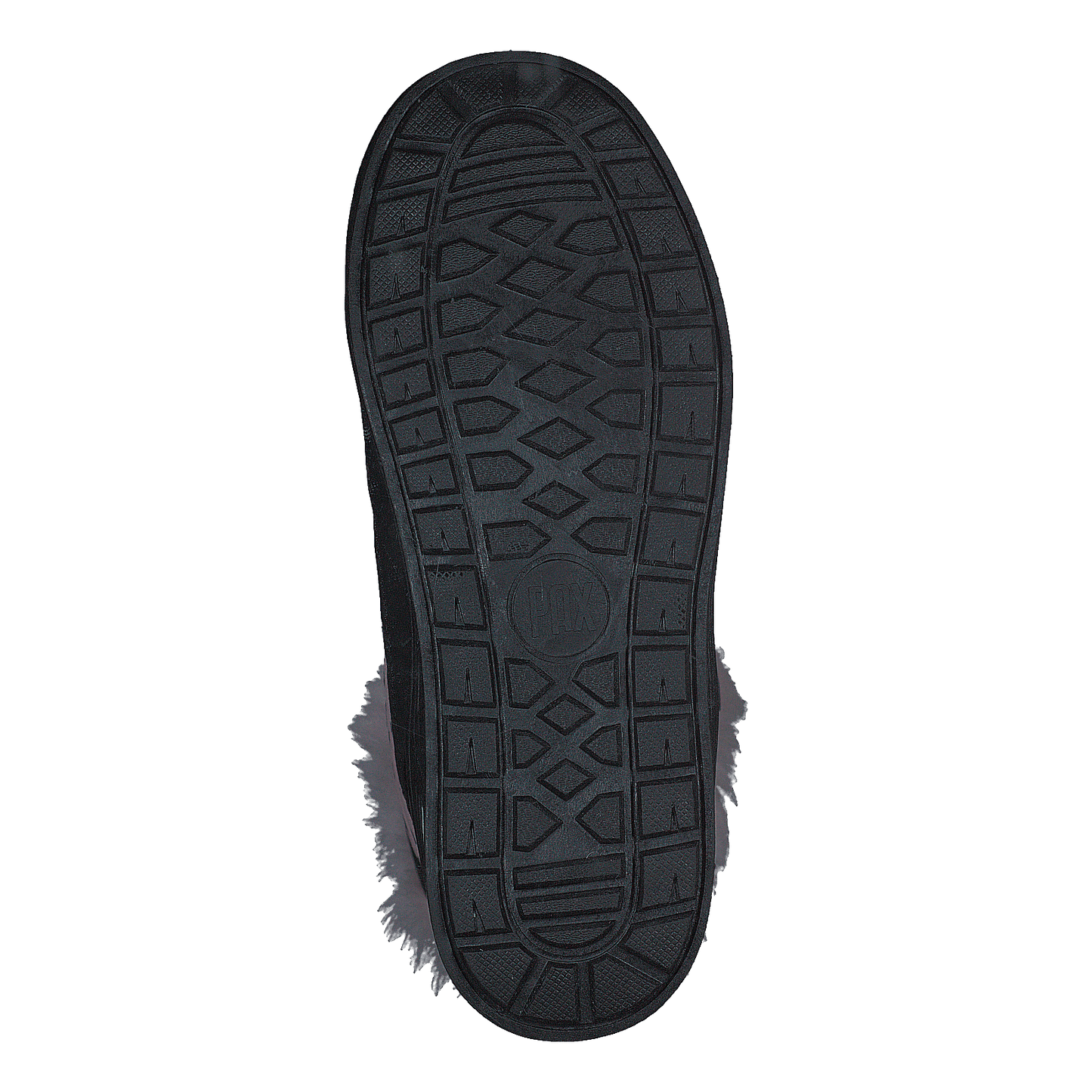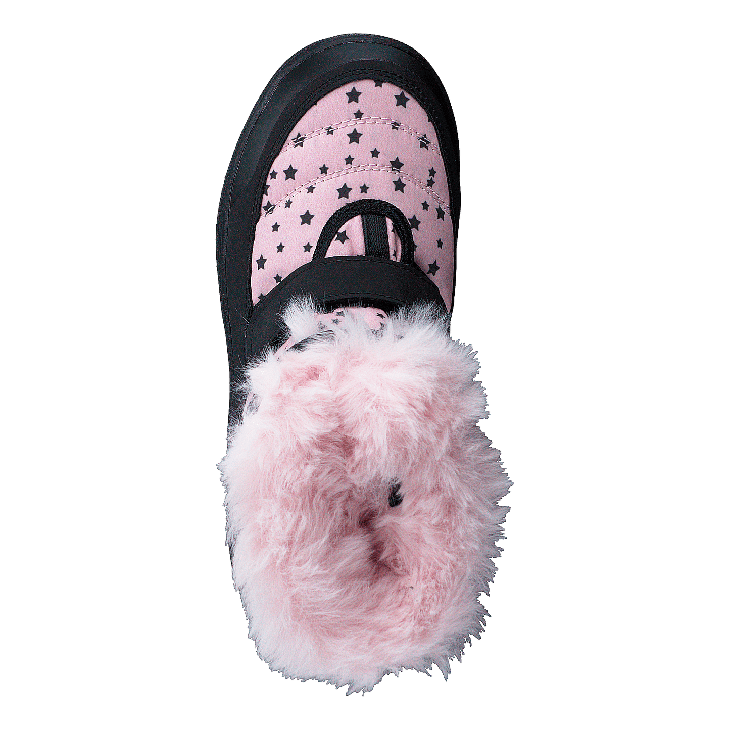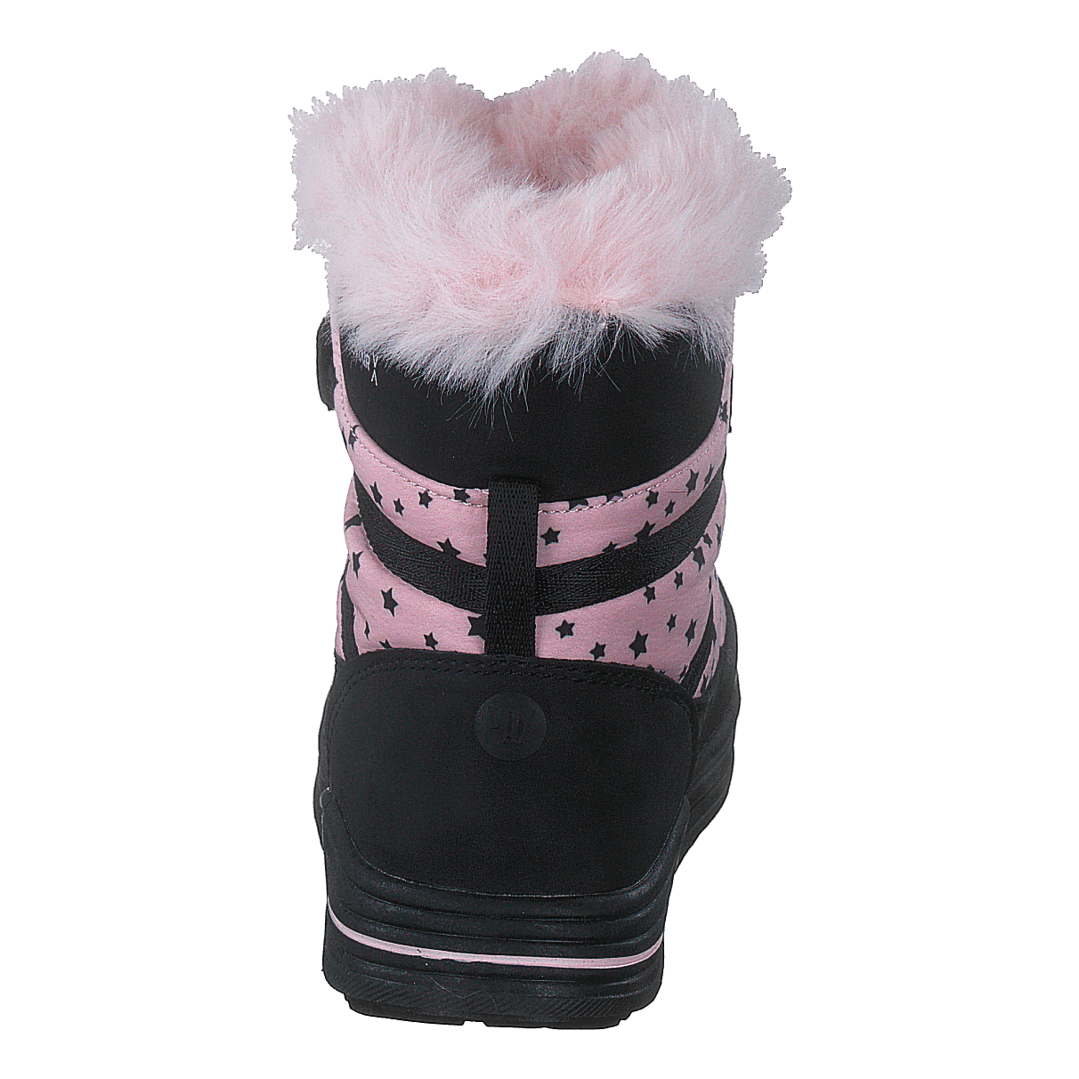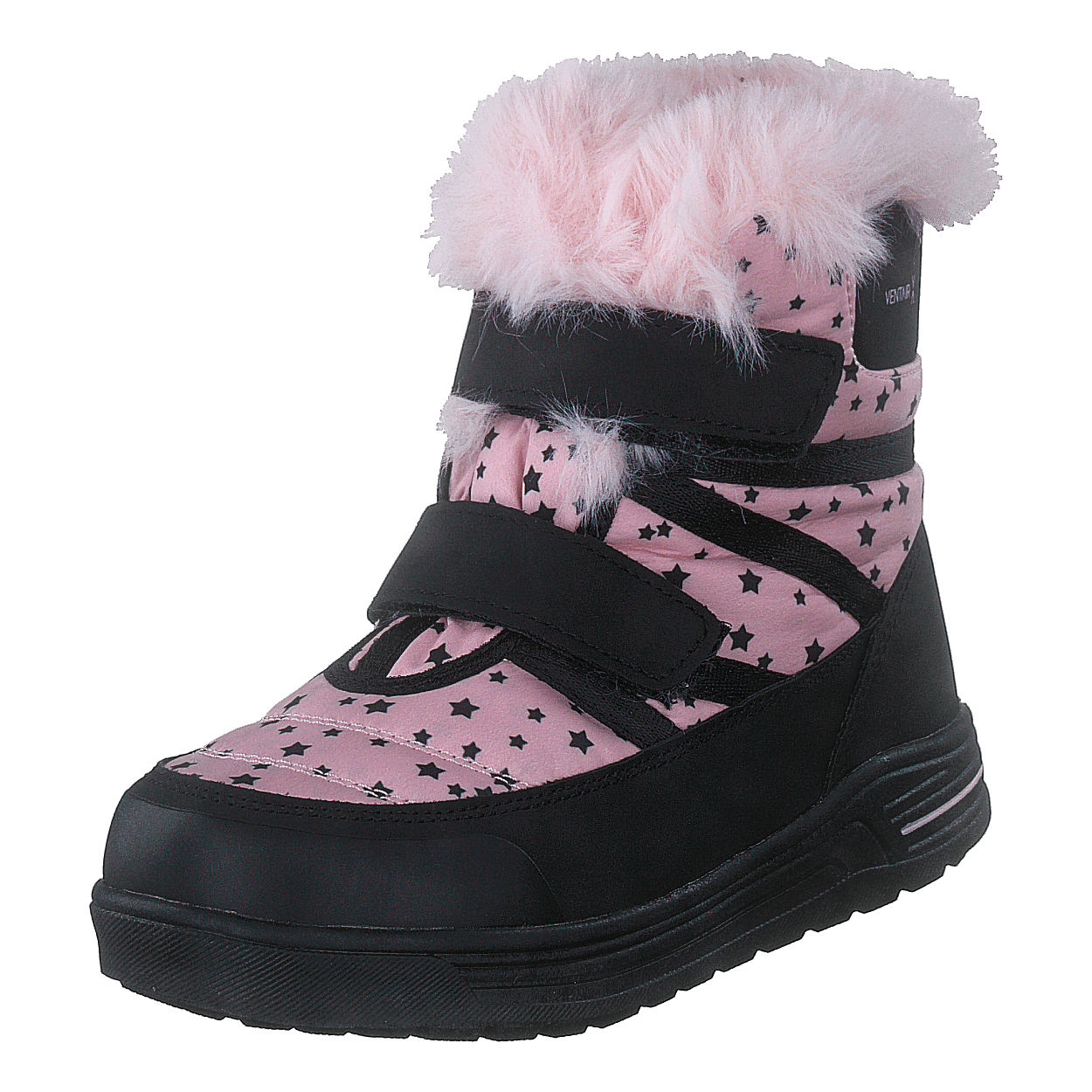 Stylish and functional, these children's winter boots feature a black and pink design with a playful star pattern. The thick rubber sole provides winter protection, while two Velcro straps ensure a secure fit. Pink faux fur lining offers warmth and comfort. The VENTAIR technology combines with a sporty yet cute design, perfect for young girls needing practical winter footwear.