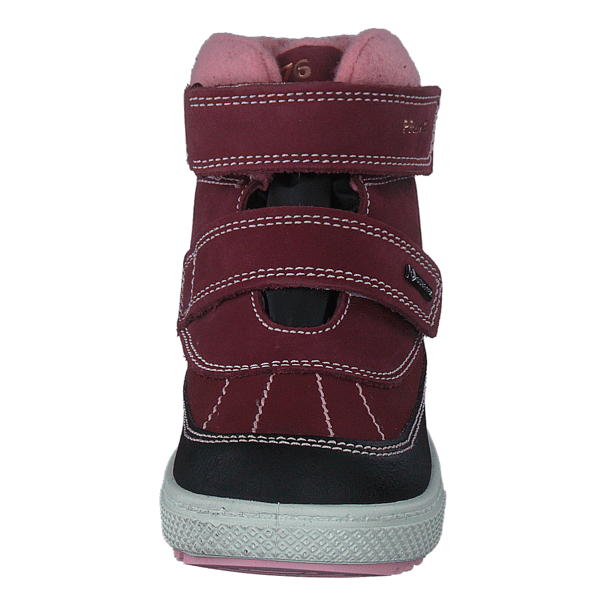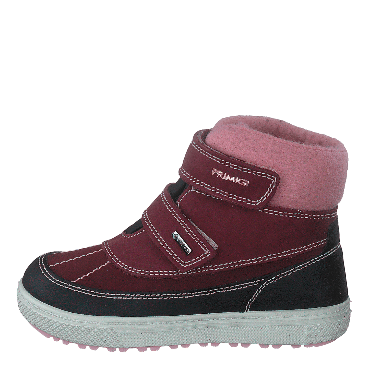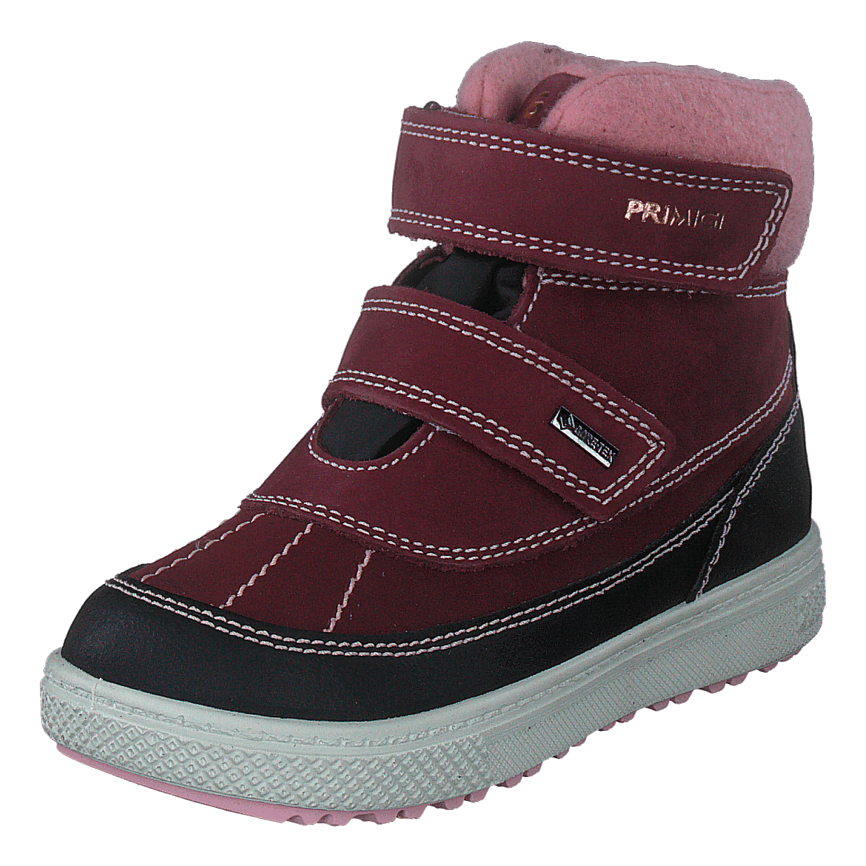 Primigi's children's winter boot combines style and practicality with its high-top design and dual velcro straps. The burgundy upper with black rubber toe cap and sole offers durability and water resistance. A soft pink lining provides warmth and comfort, while decorative stitching adds visual appeal. This casual boot is designed for easy wear and winter protection.