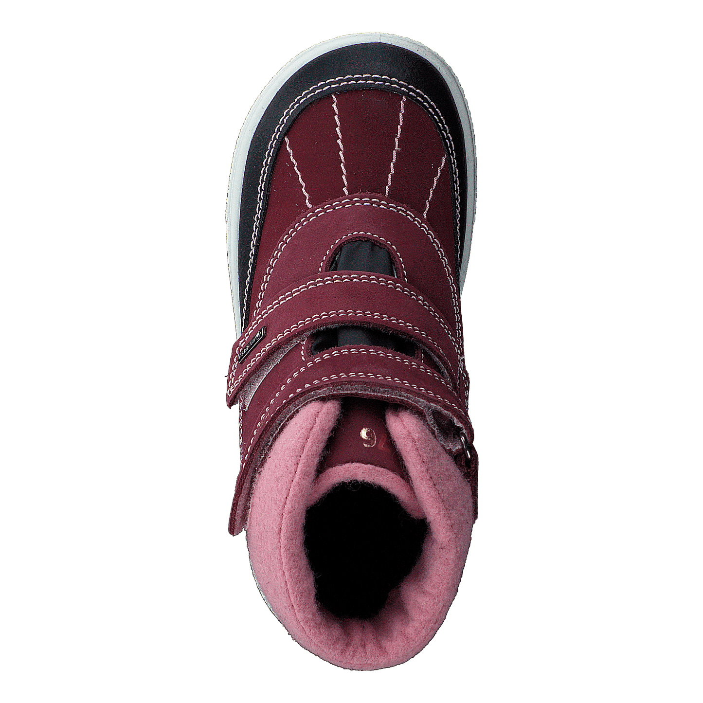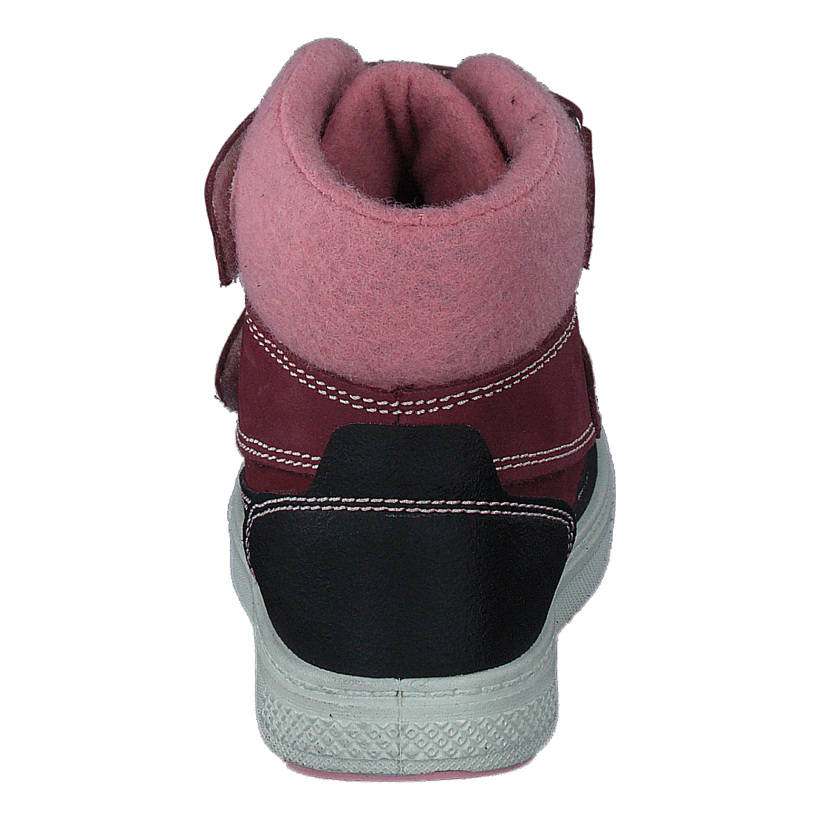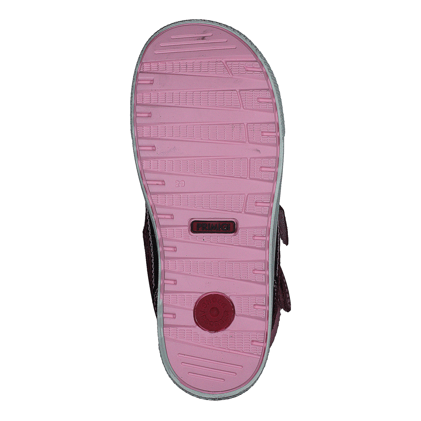 Primigi's children's winter boot combines style and practicality with its high-top design and dual velcro straps. The burgundy upper with black rubber toe cap and sole offers durability and water resistance. A soft pink lining provides warmth and comfort, while decorative stitching adds visual appeal. This casual boot is designed for easy wear and winter protection.