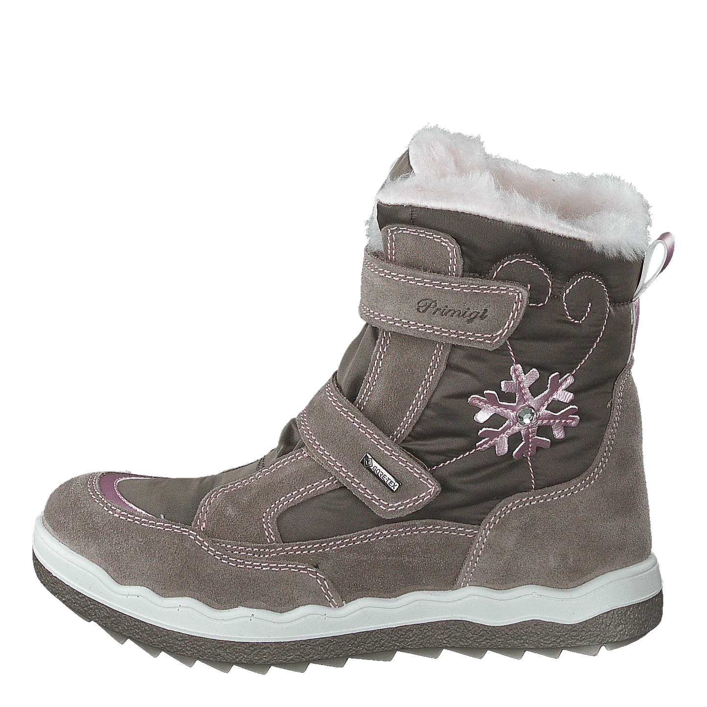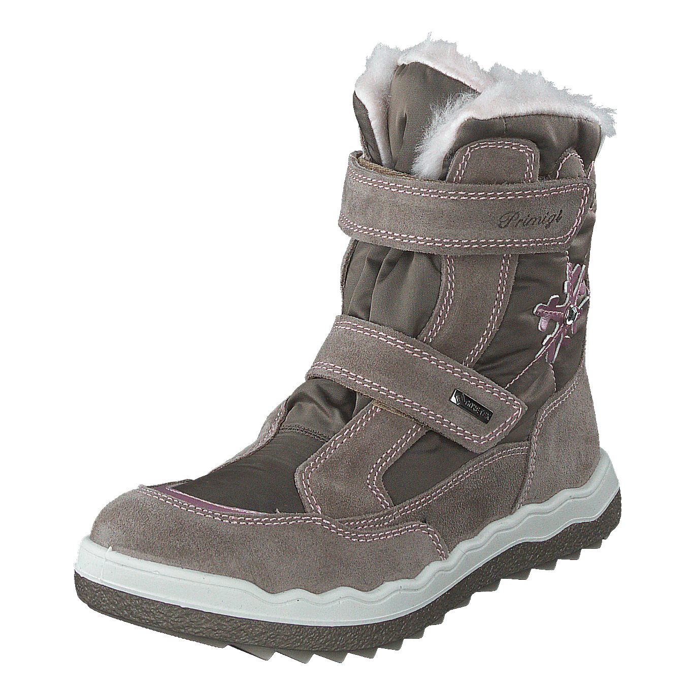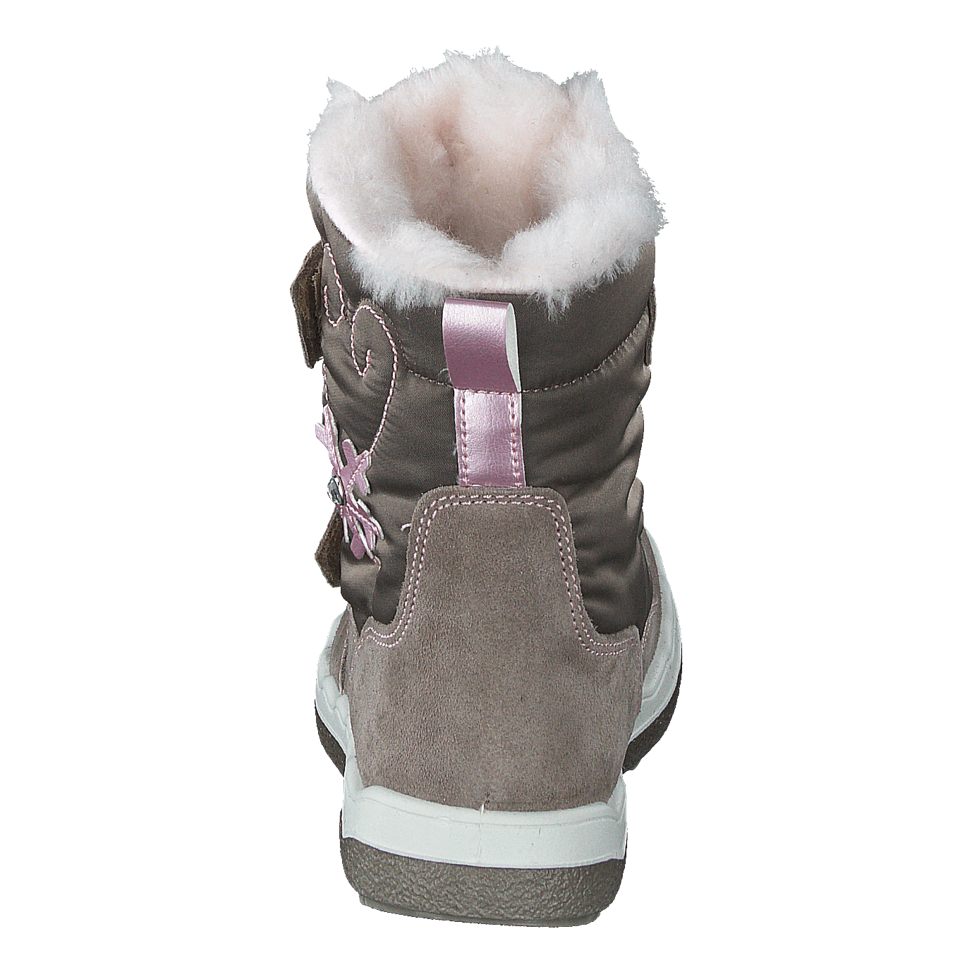 Cozy and stylish children's winter boot featuring a taupe suede and waterproof textile upper with purple accents. Soft white fur lining provides warmth, while two velcro straps ensure easy fastening. Adorned with a purple snowflake embroidery and rhinestone detail. White, grippy sole offers stability in winter conditions, combining practicality with child-friendly design.