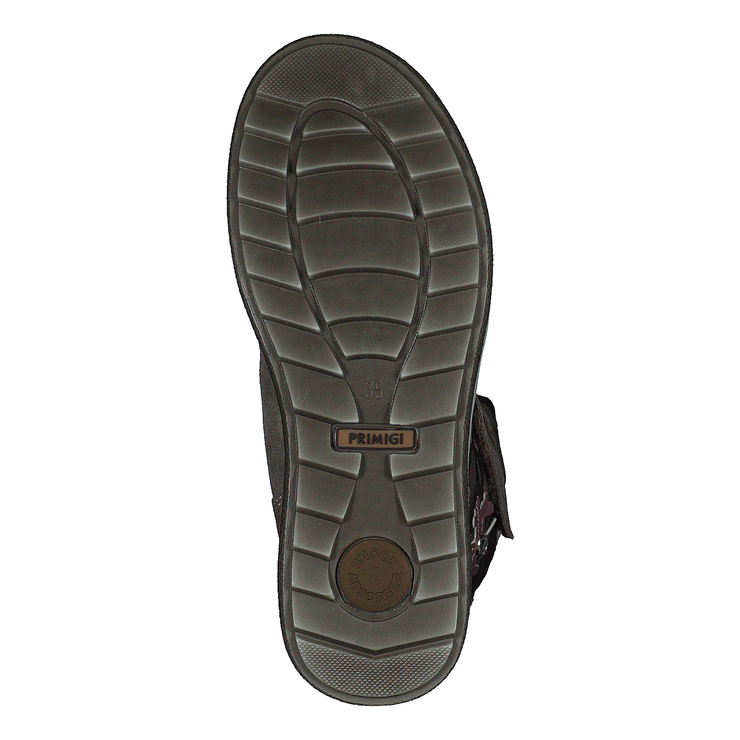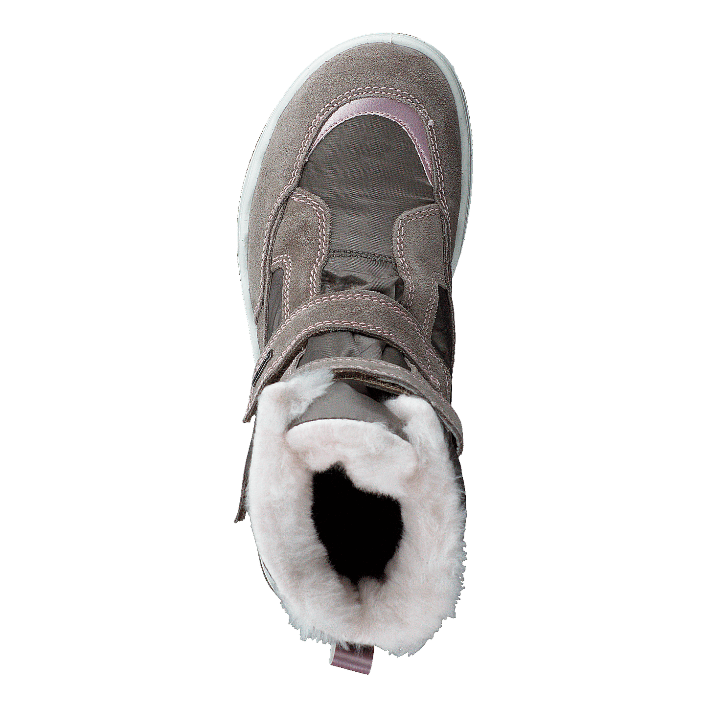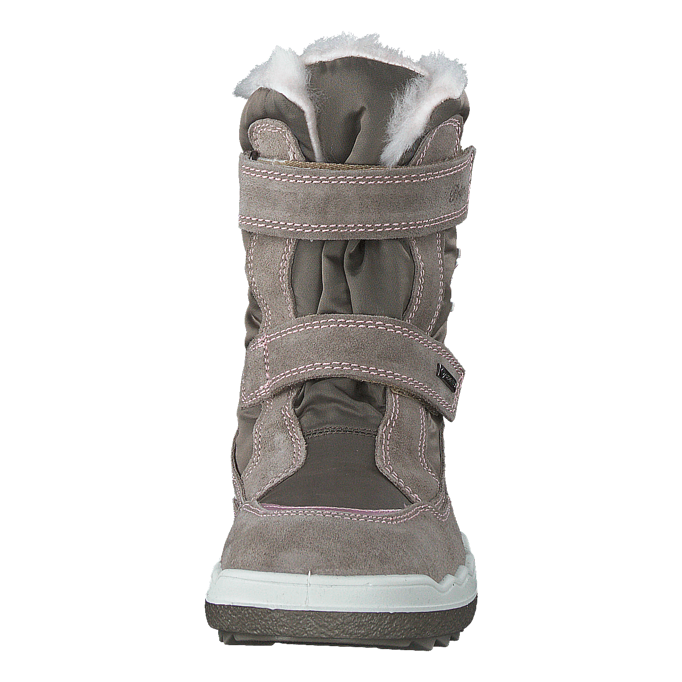 Cozy and stylish children's winter boot featuring a taupe suede and waterproof textile upper with purple accents. Soft white fur lining provides warmth, while two velcro straps ensure easy fastening. Adorned with a purple snowflake embroidery and rhinestone detail. White, grippy sole offers stability in winter conditions, combining practicality with child-friendly design.