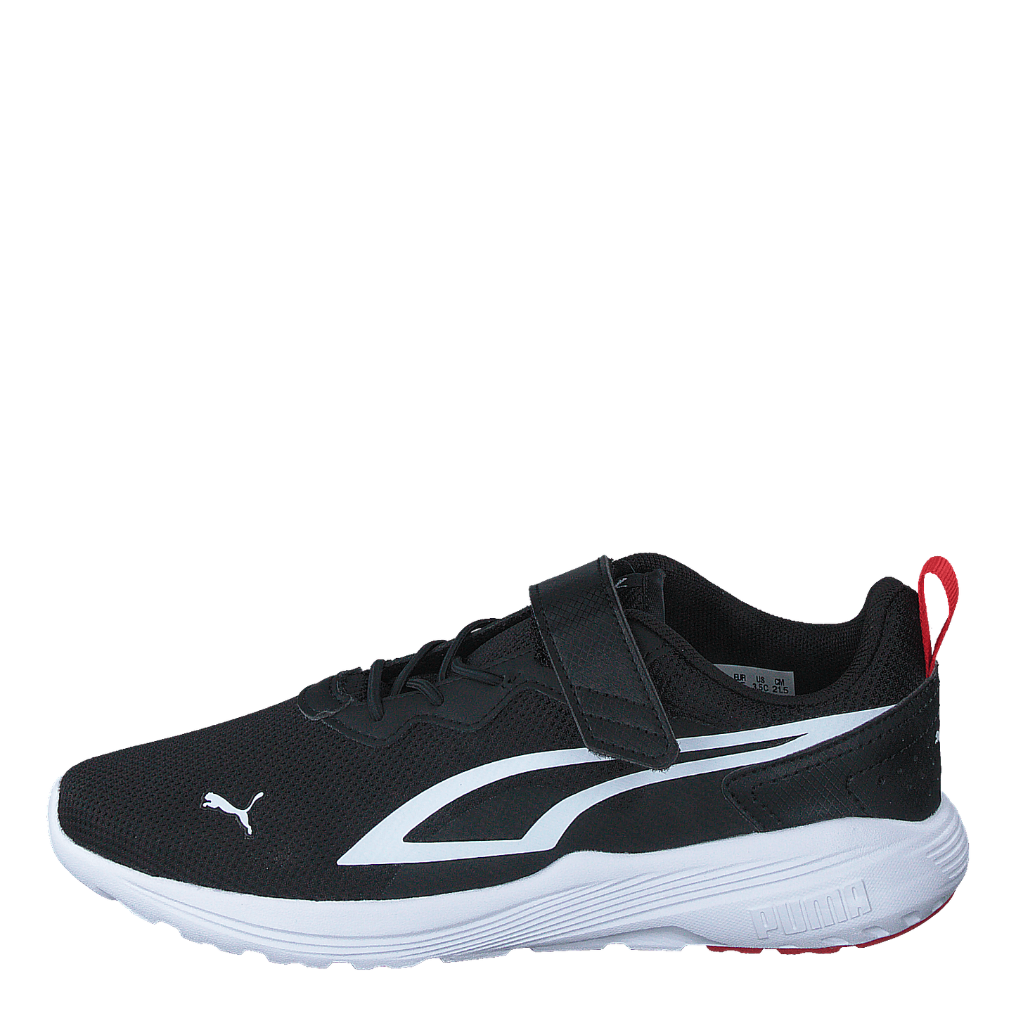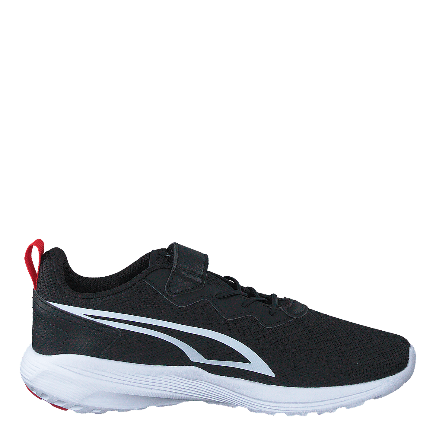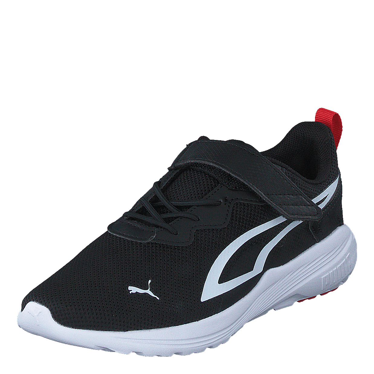 Experience all-day comfort and style with Puma's All-day Active sneaker. This sleek black and white shoe features a breathable mesh upper, supportive velcro strap, and traditional lacing system. The low-top design combines lightweight construction with a sporty aesthetic, perfect for both athletic activities and casual wear. Enjoy enhanced support and ventilation for maximum comfort throughout your day.