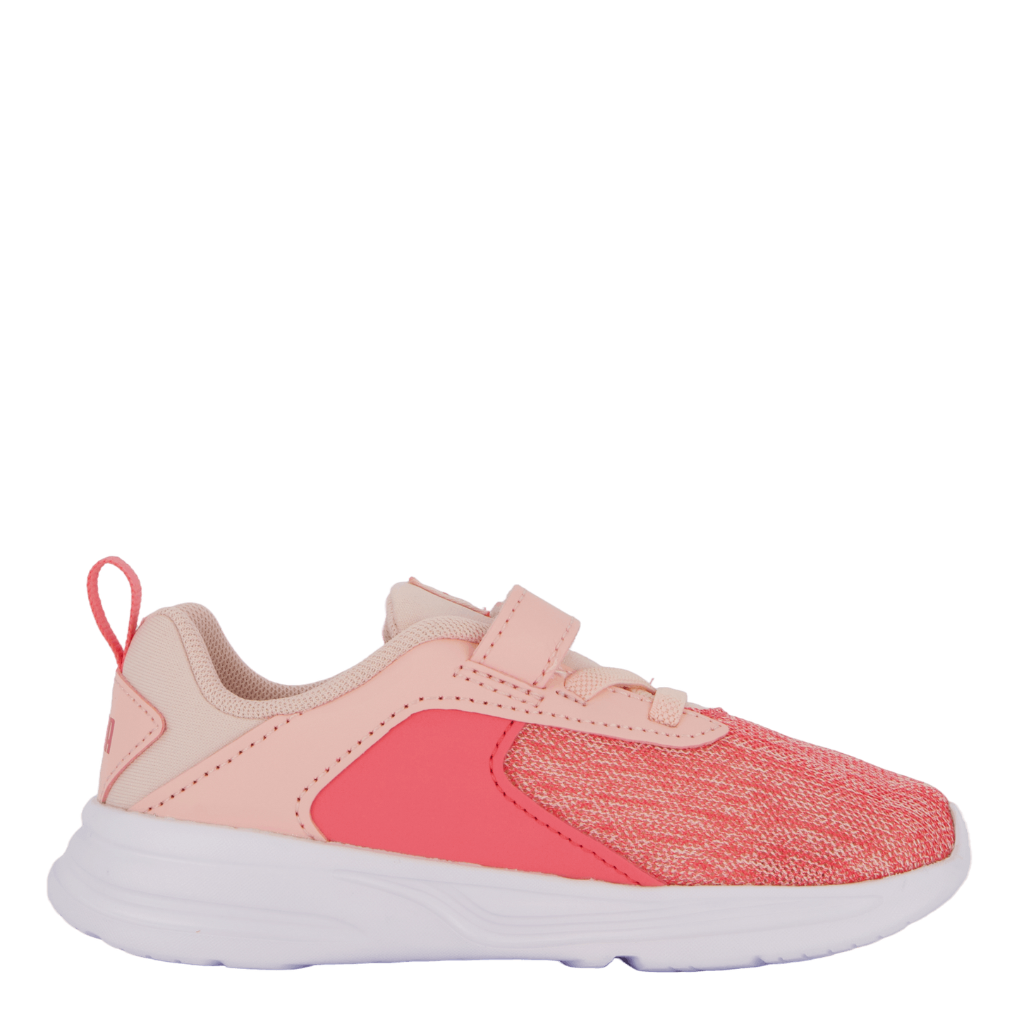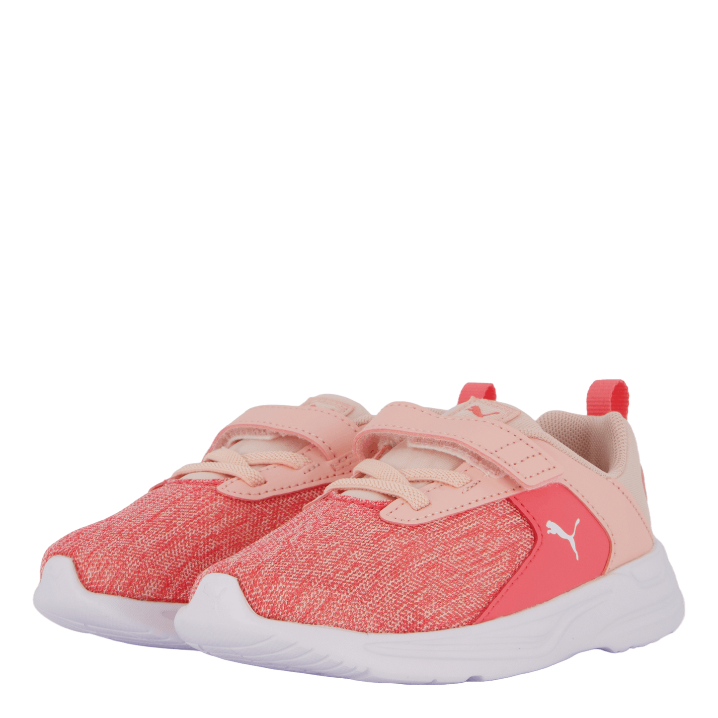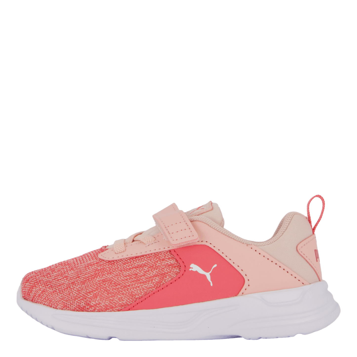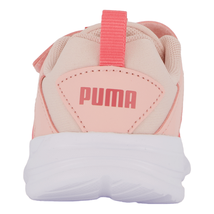 Puma's Comet 2 Alt V Inf in Loveable-rose Dust is a stylish children's athletic shoe designed for comfort and ease. Featuring a two-tone coral pink and light pink design, it boasts a single velcro strap for easy wear. The shoe combines textured and smooth materials, with a thick white sole for cushioning. A coral pull tab adds functionality, while the white Puma logo completes its sporty look.