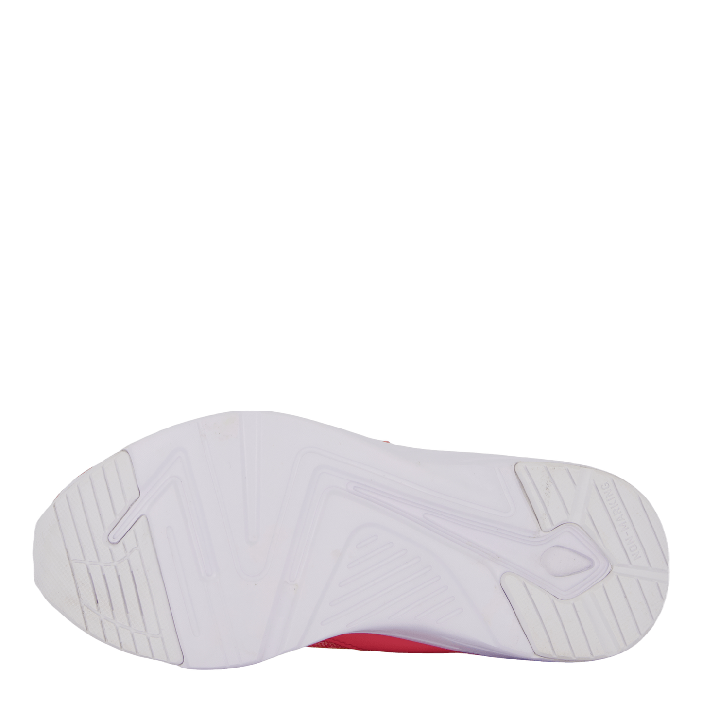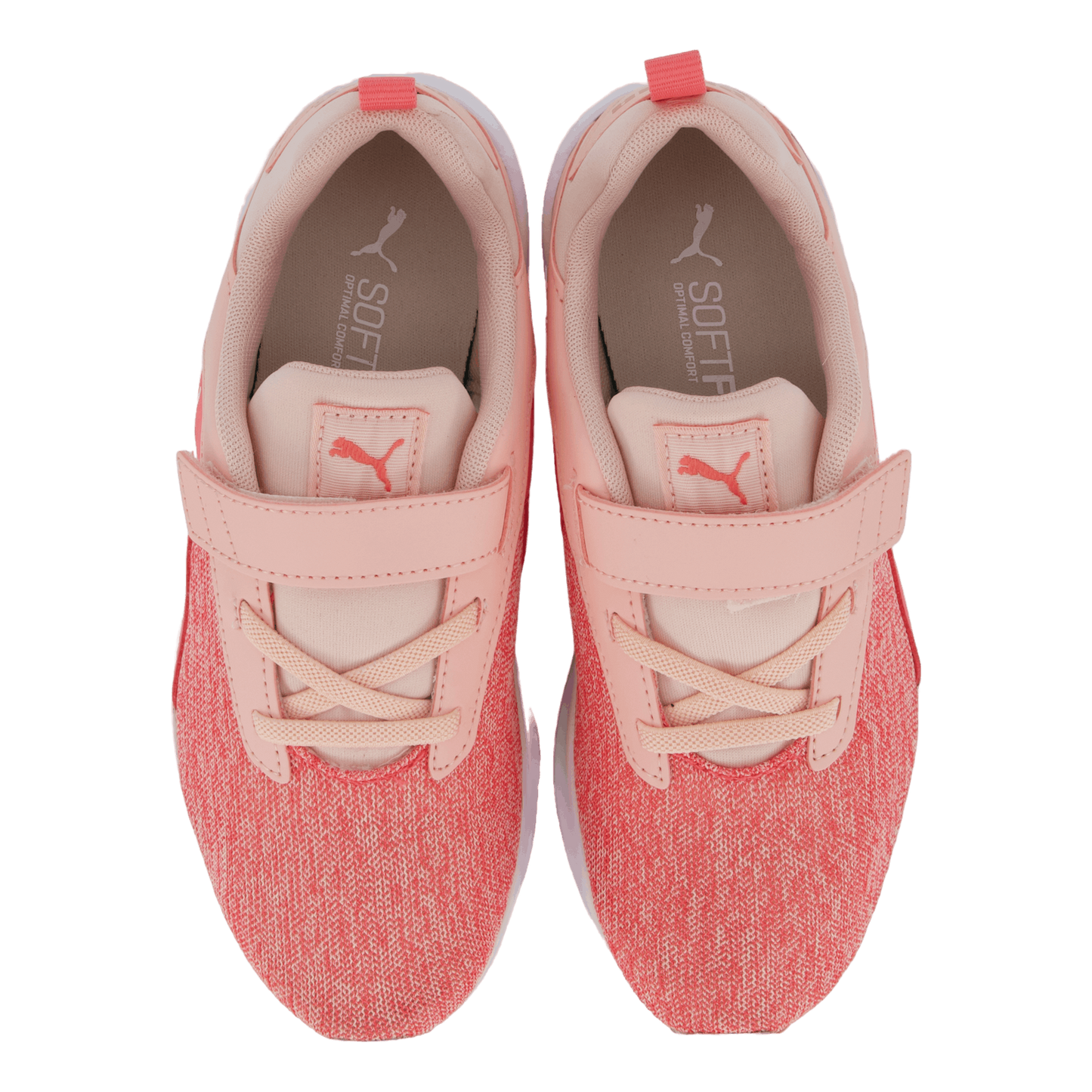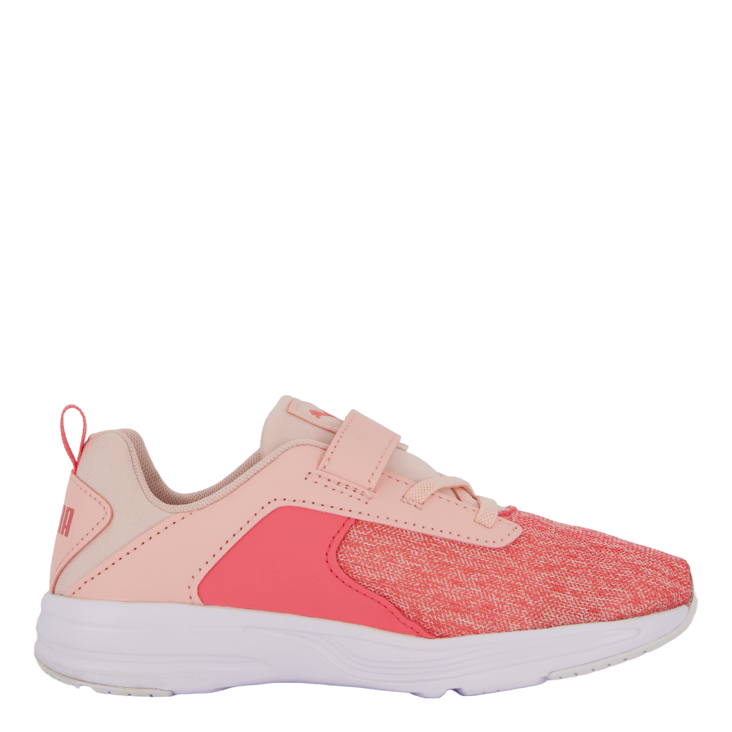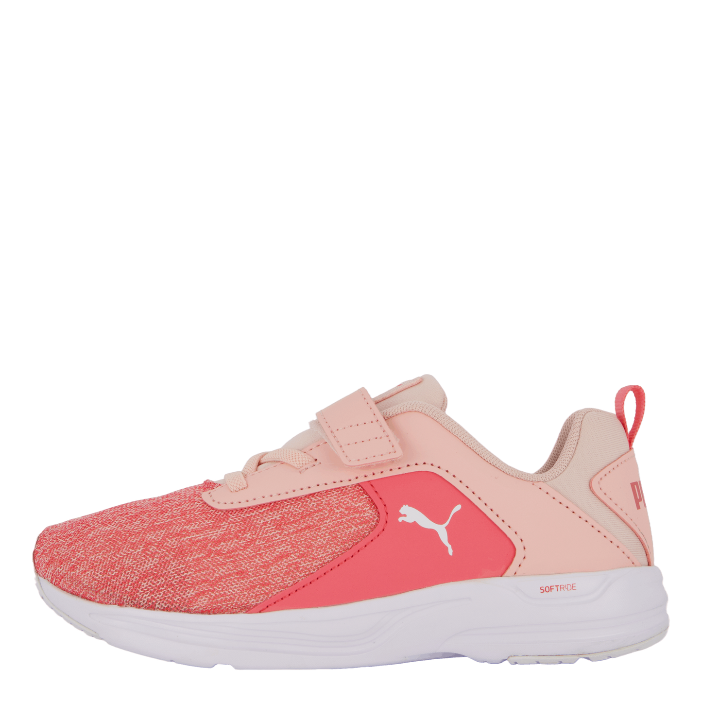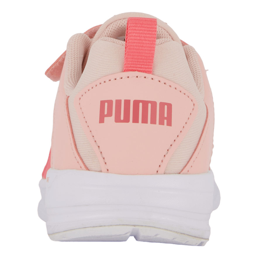 The Puma Comet 2 Alt V Ps offers stylish comfort for active kids. This children's athletic shoe features a vibrant coral pink and pale pink two-tone design with a single velcro strap for easy wear. The white sole provides contrast, while the EVA midsole ensures soft cushioning. A pull tab at the heel adds convenience to this modern, sporty shoe.