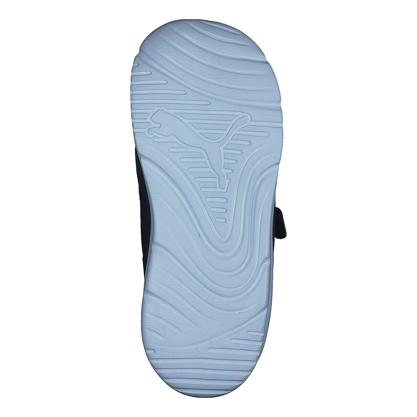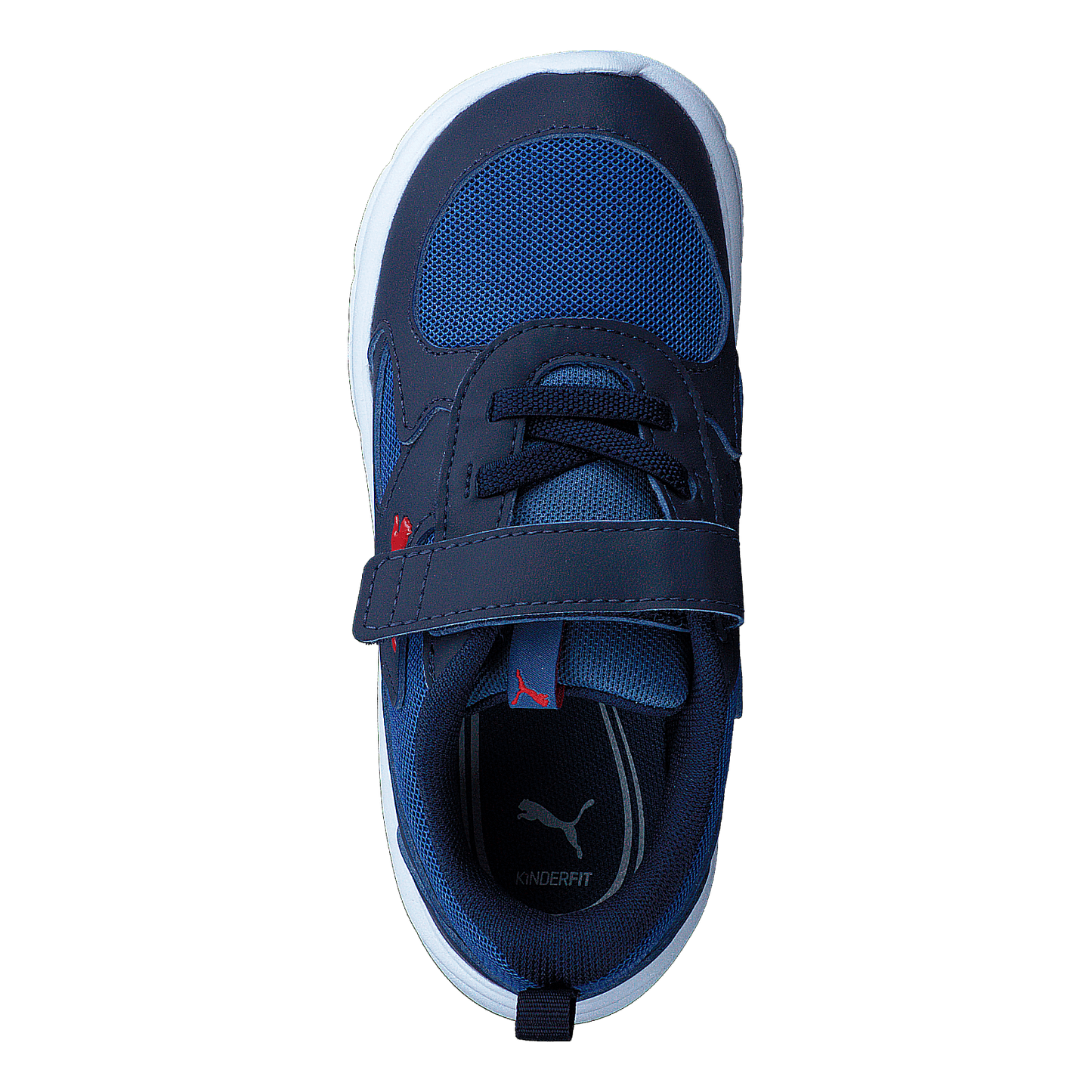 Puma Fun Racer children's athletic shoe combines style and functionality. Features a navy blue synthetic leather upper with lighter blue mesh for breathability. Easy-to-use velcro strap closure and padded collar ensure comfort and fit. Red Puma logo adds a pop of color. White sole provides contrast and stability, perfect for everyday activities and playground adventures.