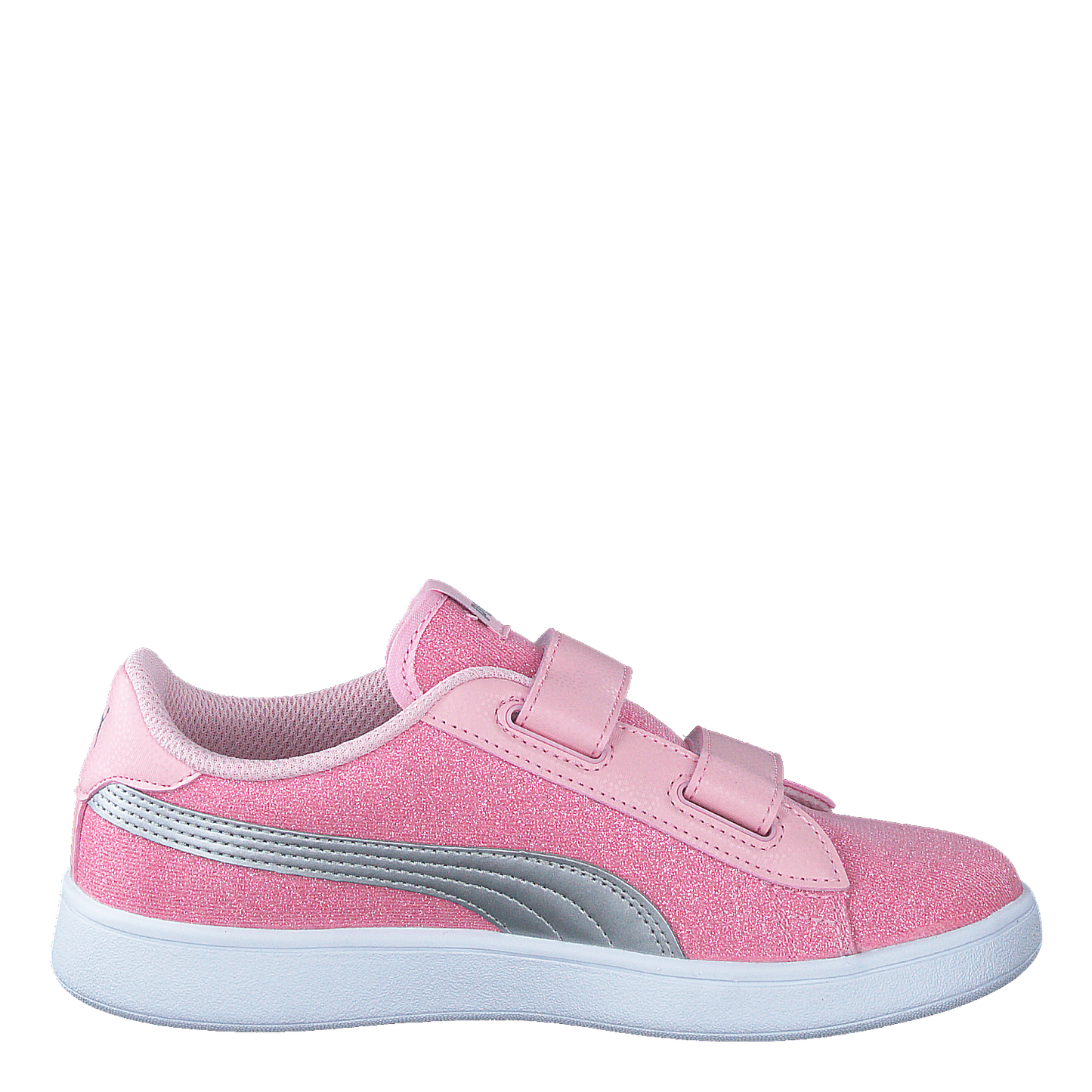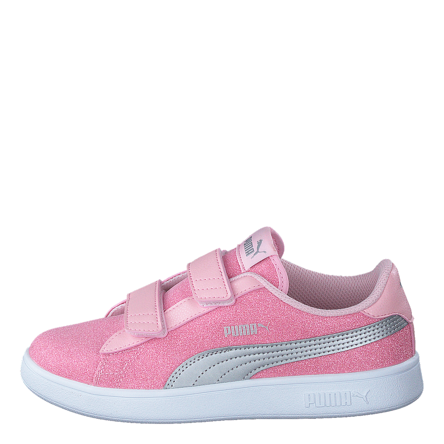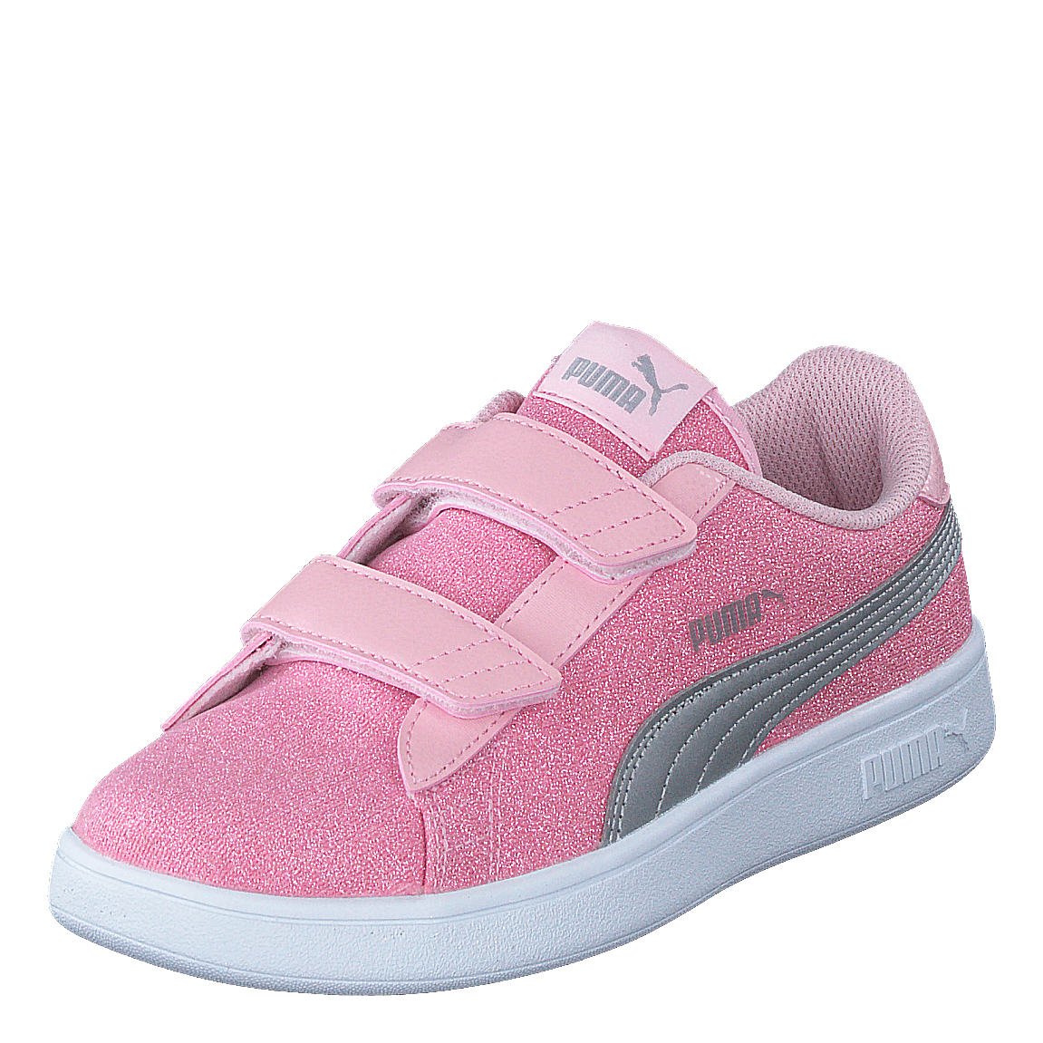 Puma Smash V2 Glitz Glam V Ps sneakers combine style and practicality for young girls. These pink, glittery shoes feature a sparkly synthetic upper, silver Puma stripe, and two convenient velcro straps. The white sole contrasts nicely with the glamorous upper, creating a sporty yet feminine look that's perfect for active children who love a touch of sparkle.