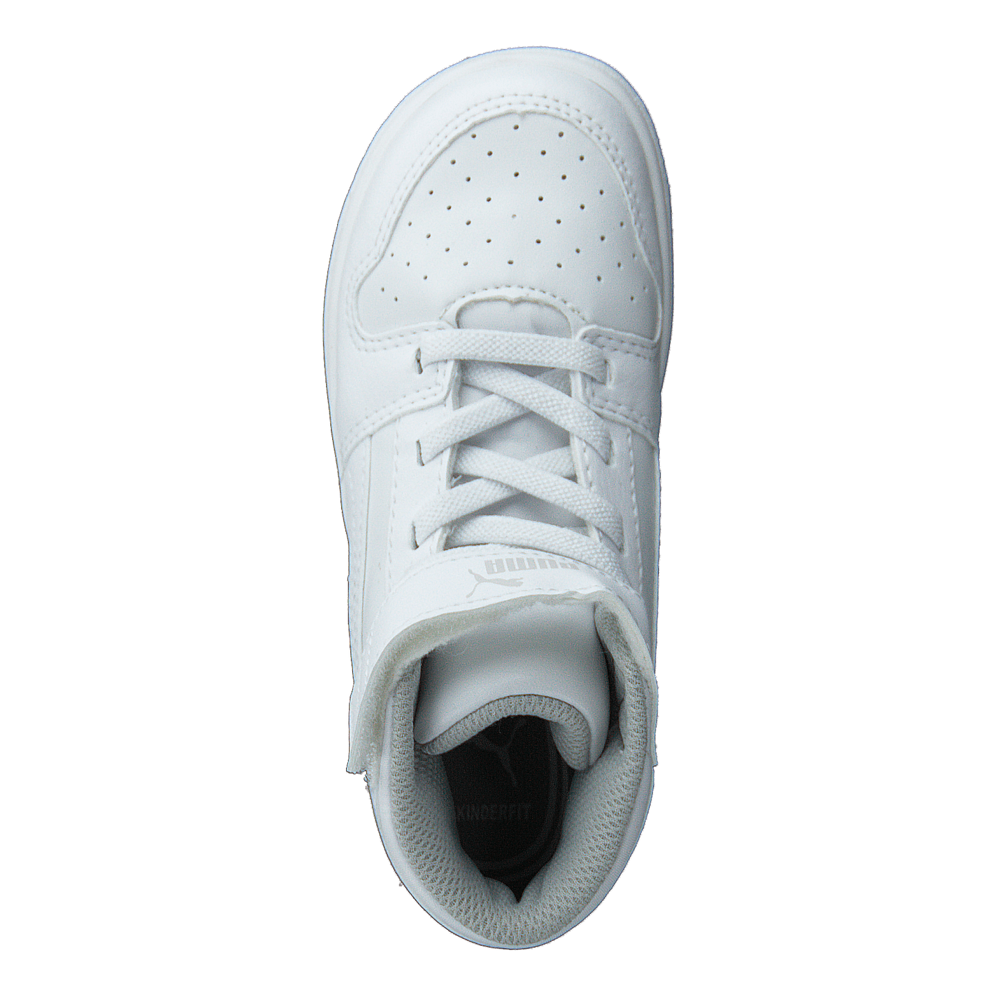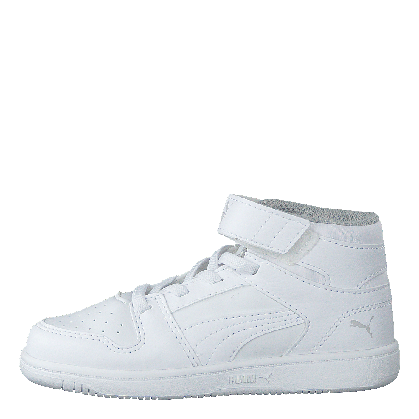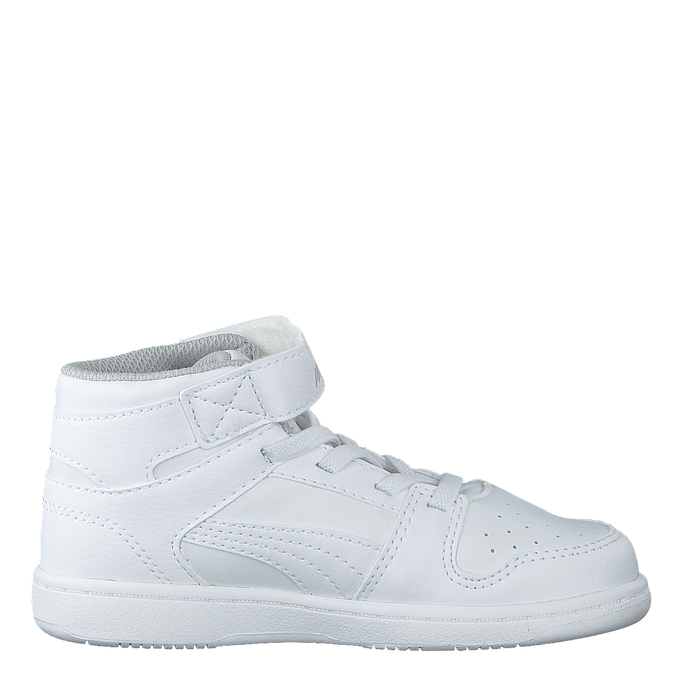 Puma Rebound Layup SL V Inf combines retro and futuristic basketball style in a mid-cut sneaker for toddlers. Featuring a white synthetic leather upper, perforated forefront, and iconic PUMA Formstrip, it offers a non-marking rubber outsole and Kinder-Fit® removable sockliner. Easy-to-use Velcro strap closure ensures a secure fit for active little ones.