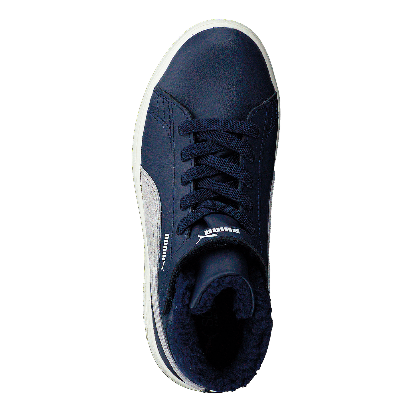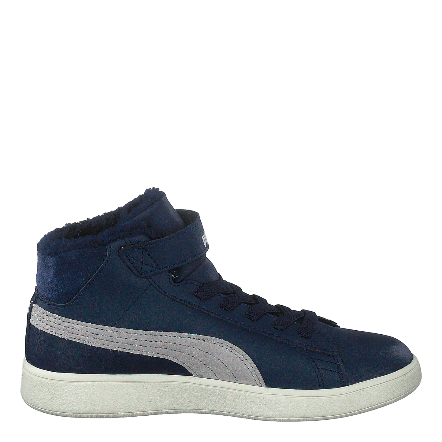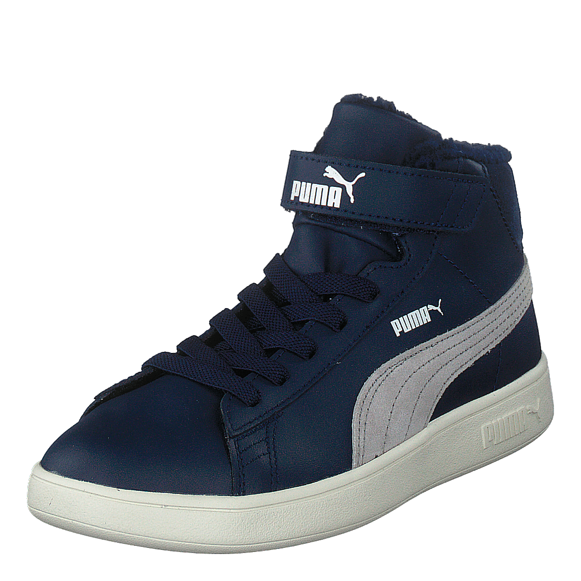 Puma Smash V2 Mid L Fur V Ps combines style and warmth with its leather upper and cozy fur lining. This mid-boot sneaker features a tennis-inspired silhouette in peacoat blue with gray violet accents. SoftFoam+ technology ensures all-day comfort, while the velcro strap and lace closure provide a secure fit. Perfect for young kids aged 4-8.