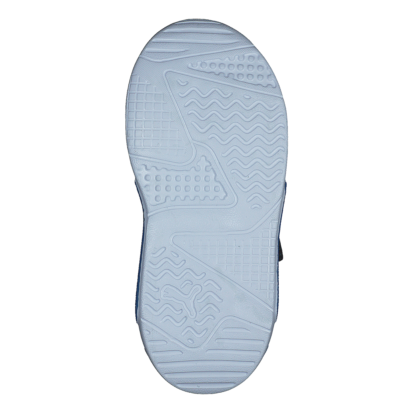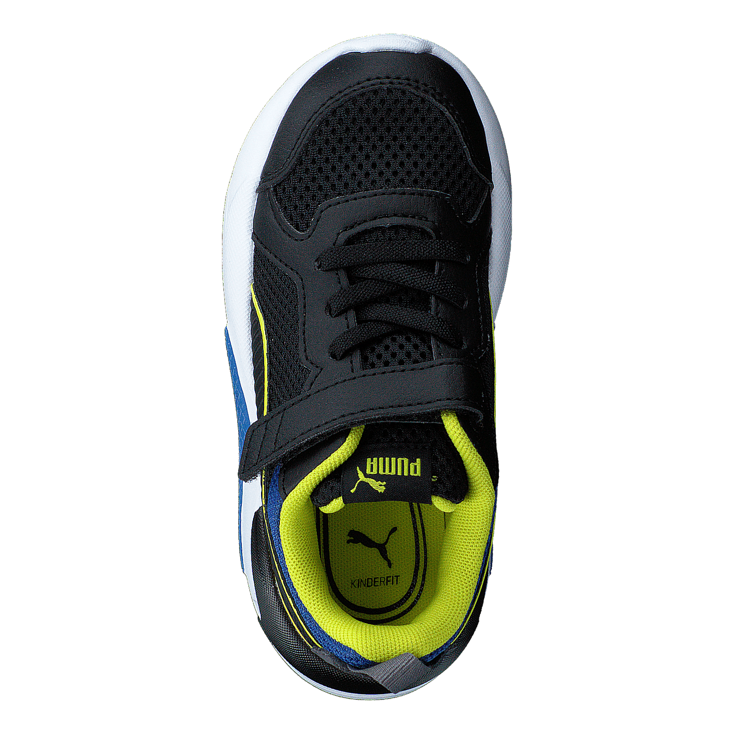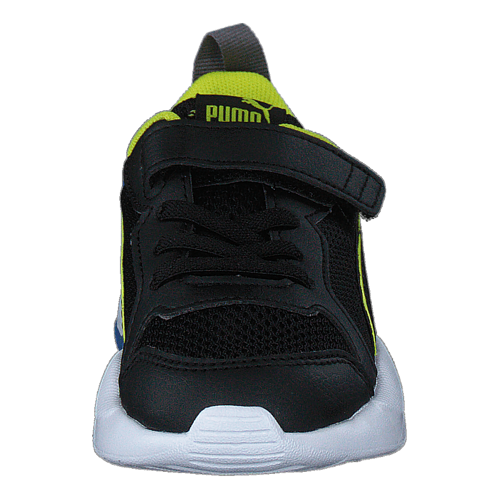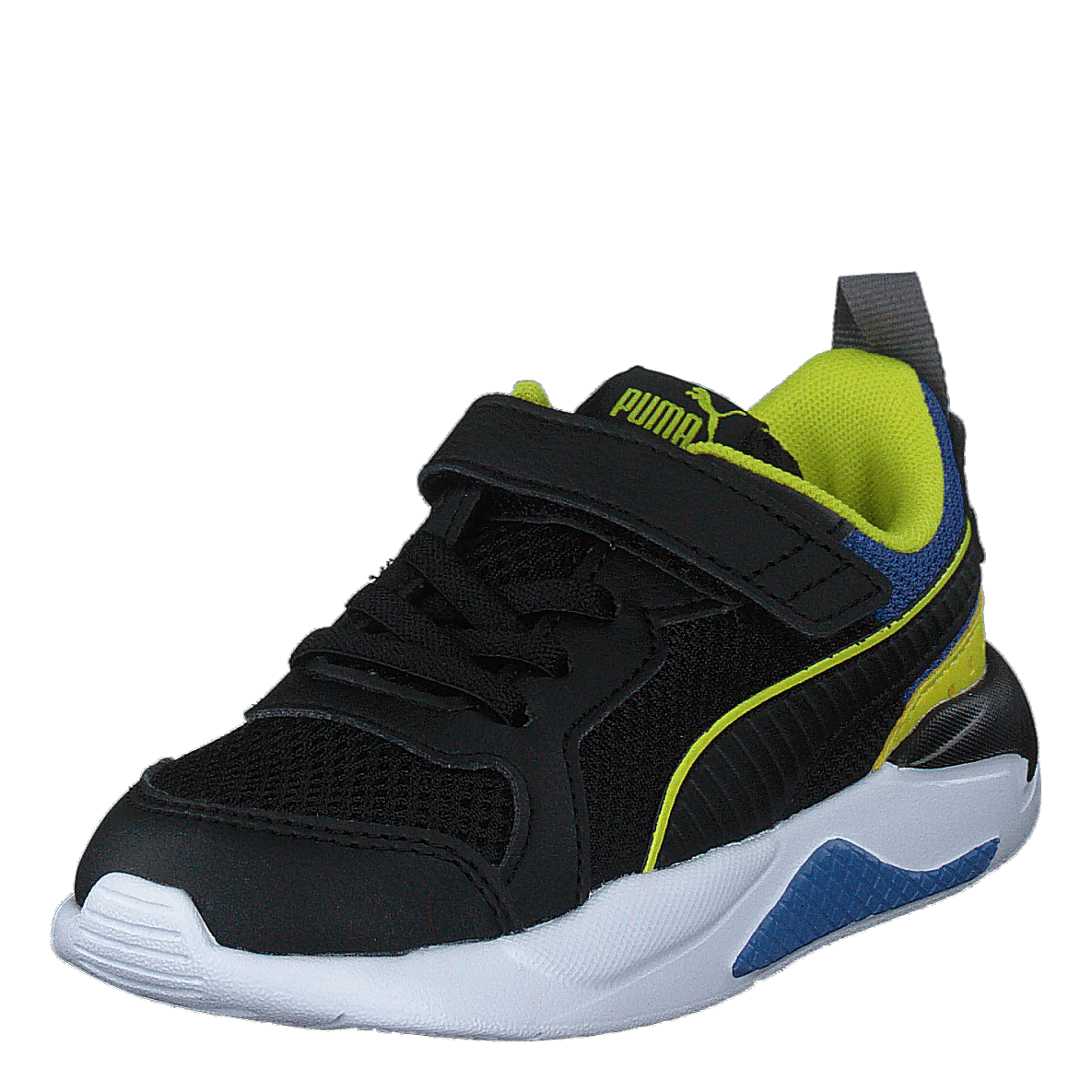 Puma's X-Ray children's sneaker combines retro style with modern comfort. Featuring a black mesh and synthetic leather upper with lime green and blue accents, it boasts a chunky sole, velcro strap, and laces for a secure fit. The SoftFoam+ sockliner and IMEVA midsole provide lightweight cushioning, while the rubber outsole ensures durability for active kids.