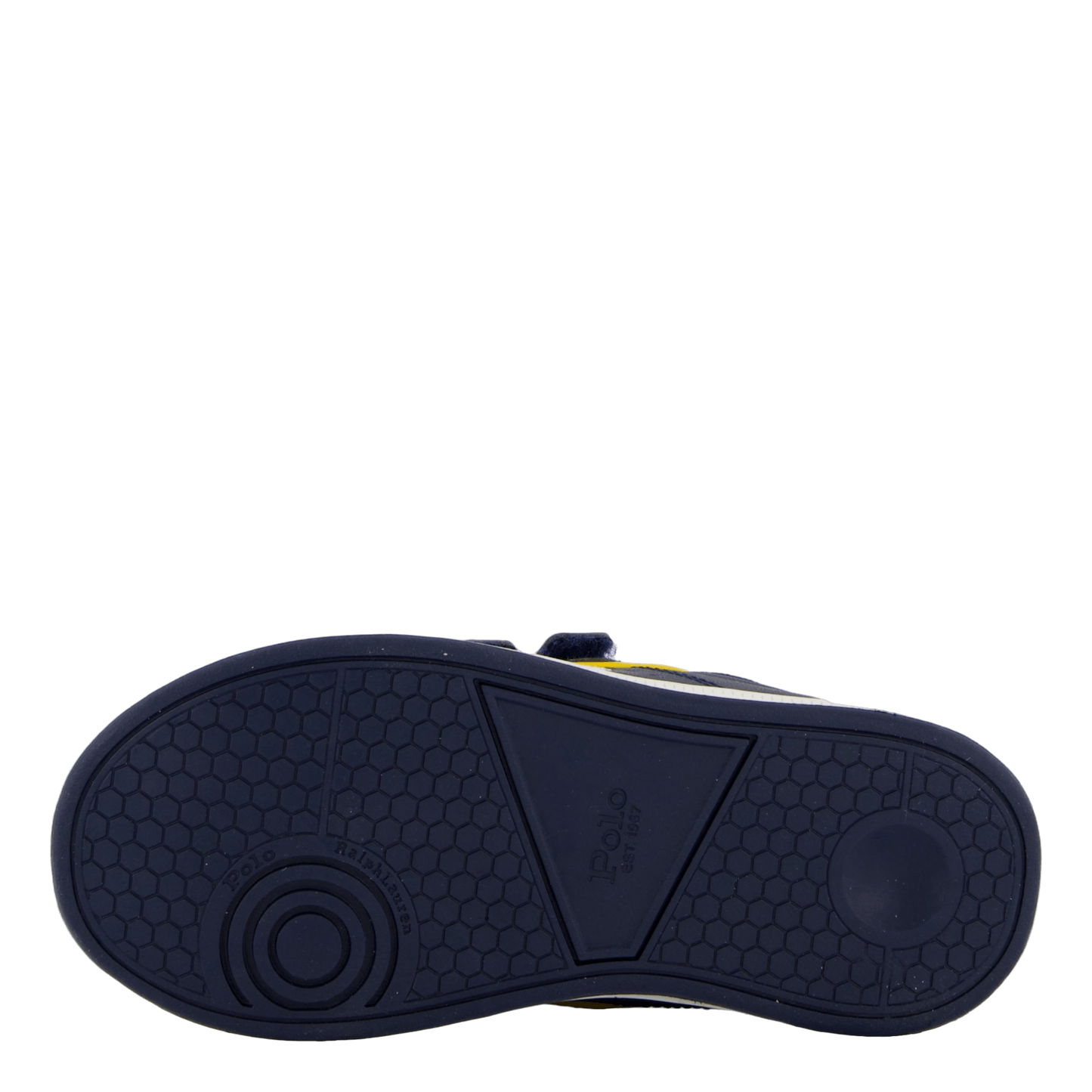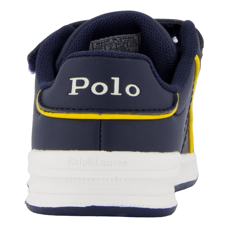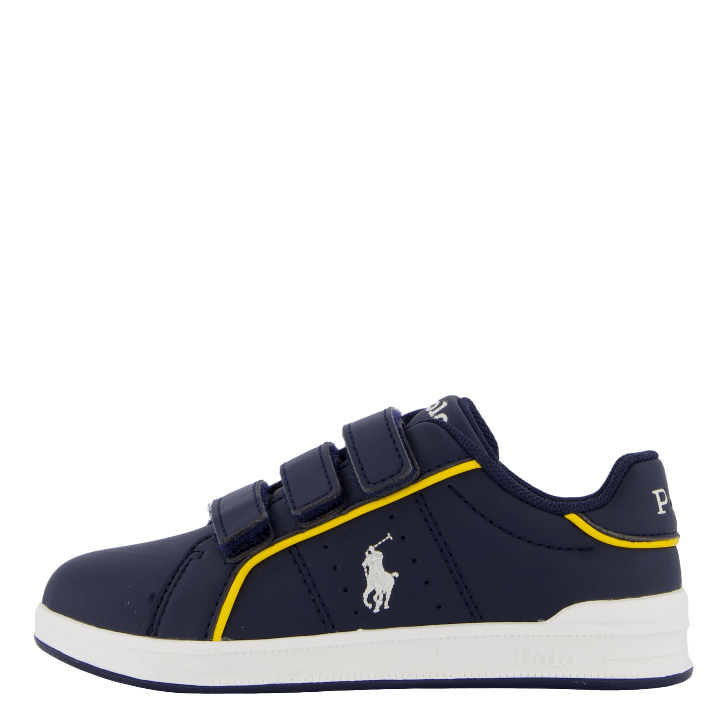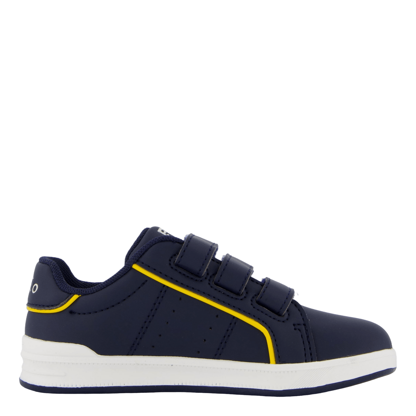 Elevate your child's style with Ralph Lauren Junior's Heritage Court III EZ sneaker. This navy smooth leather-like shoe features three convenient velcro straps, a white Polo pony logo, and a contrasting white sole. A subtle yellow stripe adds a pop of color to this sleek, low-top design, perfect for active kids seeking both comfort and fashion.