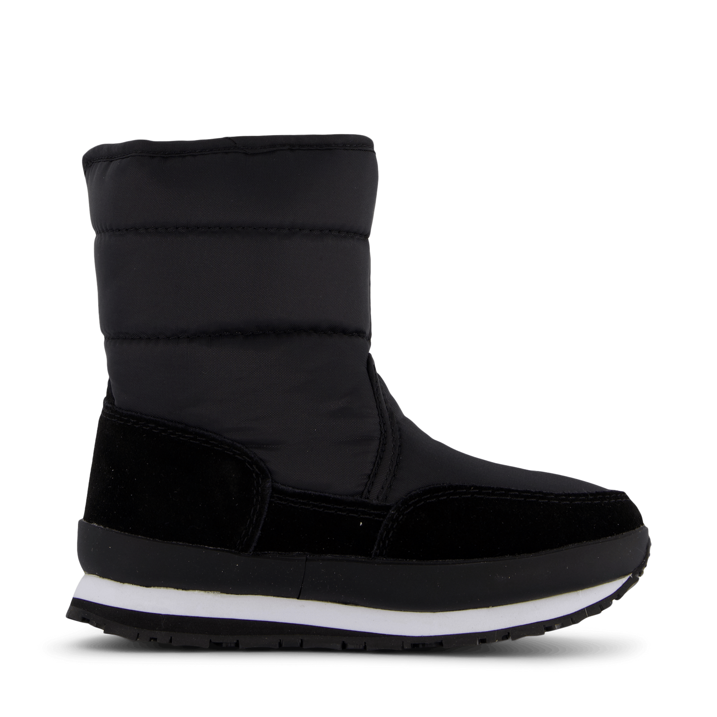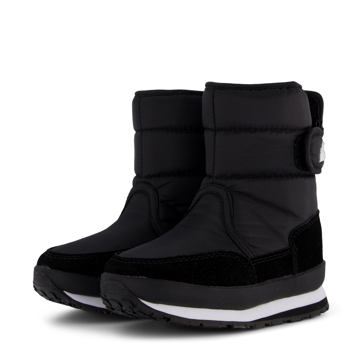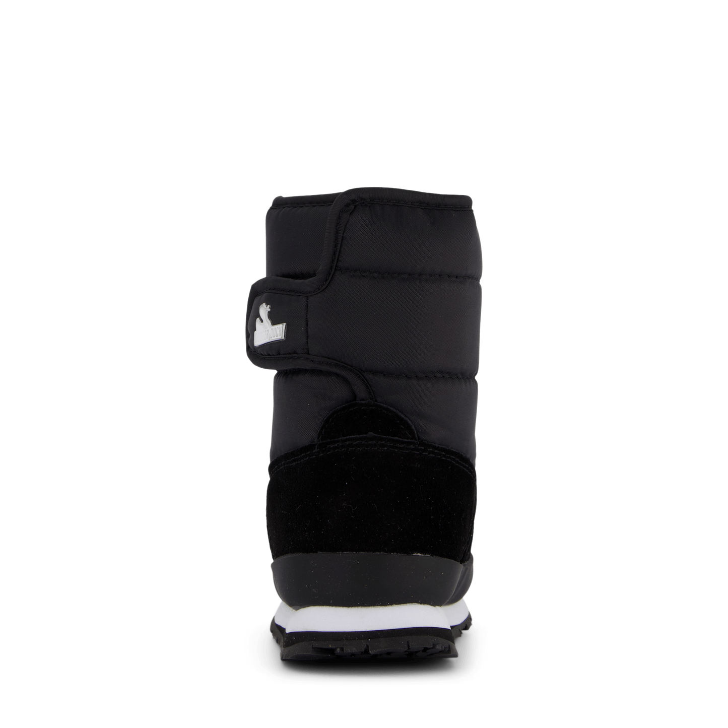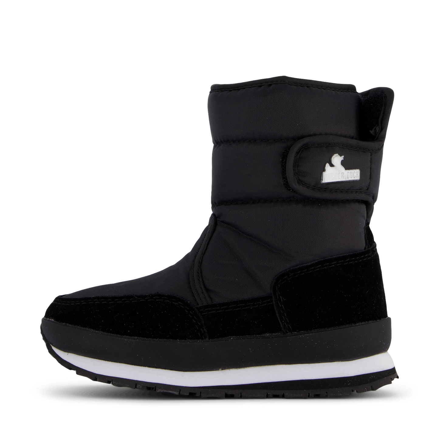 Designed for winter adventures, these Rubber Duck kids' boots combine practicality with style. Featuring a black nylon and suede construction, these boots offer warmth and water resistance. The chunky, padded design with a thick sole ensures comfort and insulation, while the velcro strap provides a secure fit. A distinctive white logo adds a playful touch to these functional winter boots.