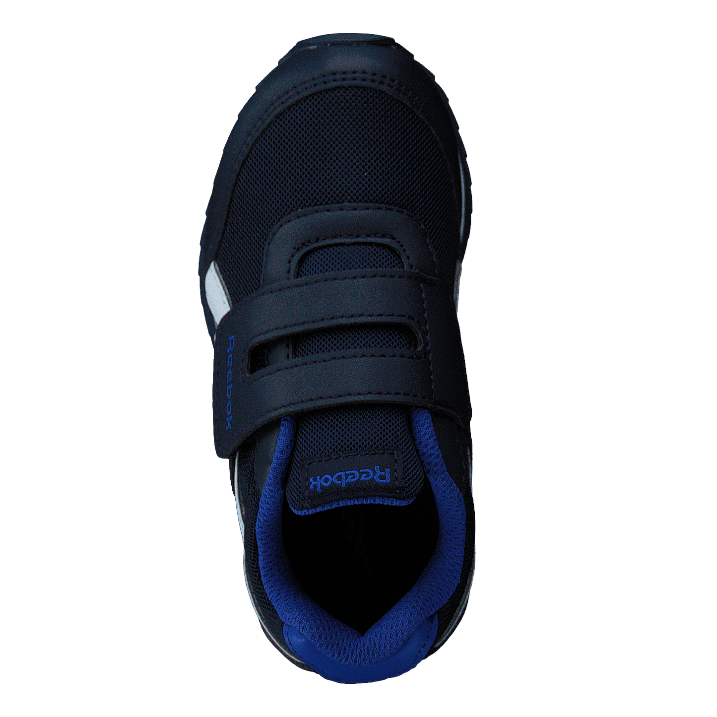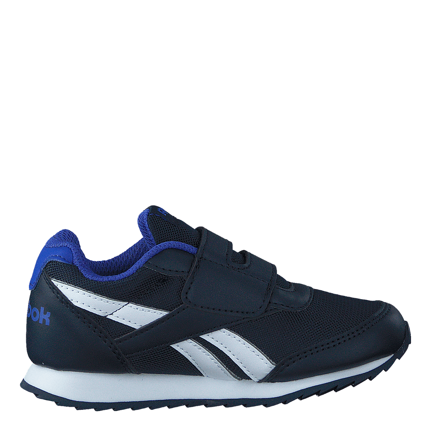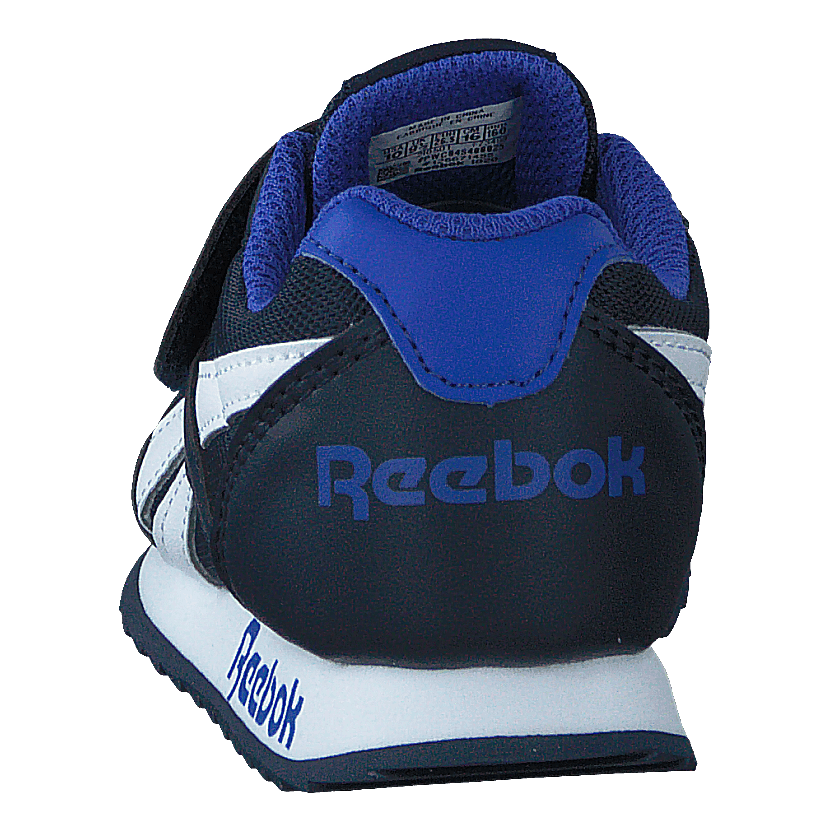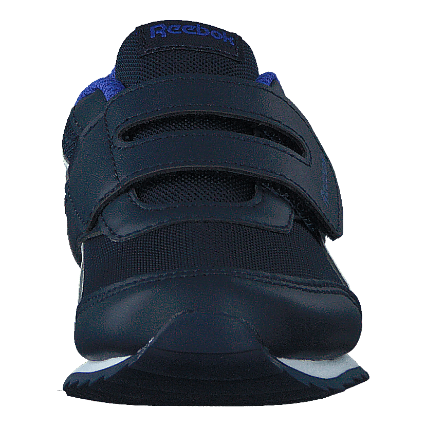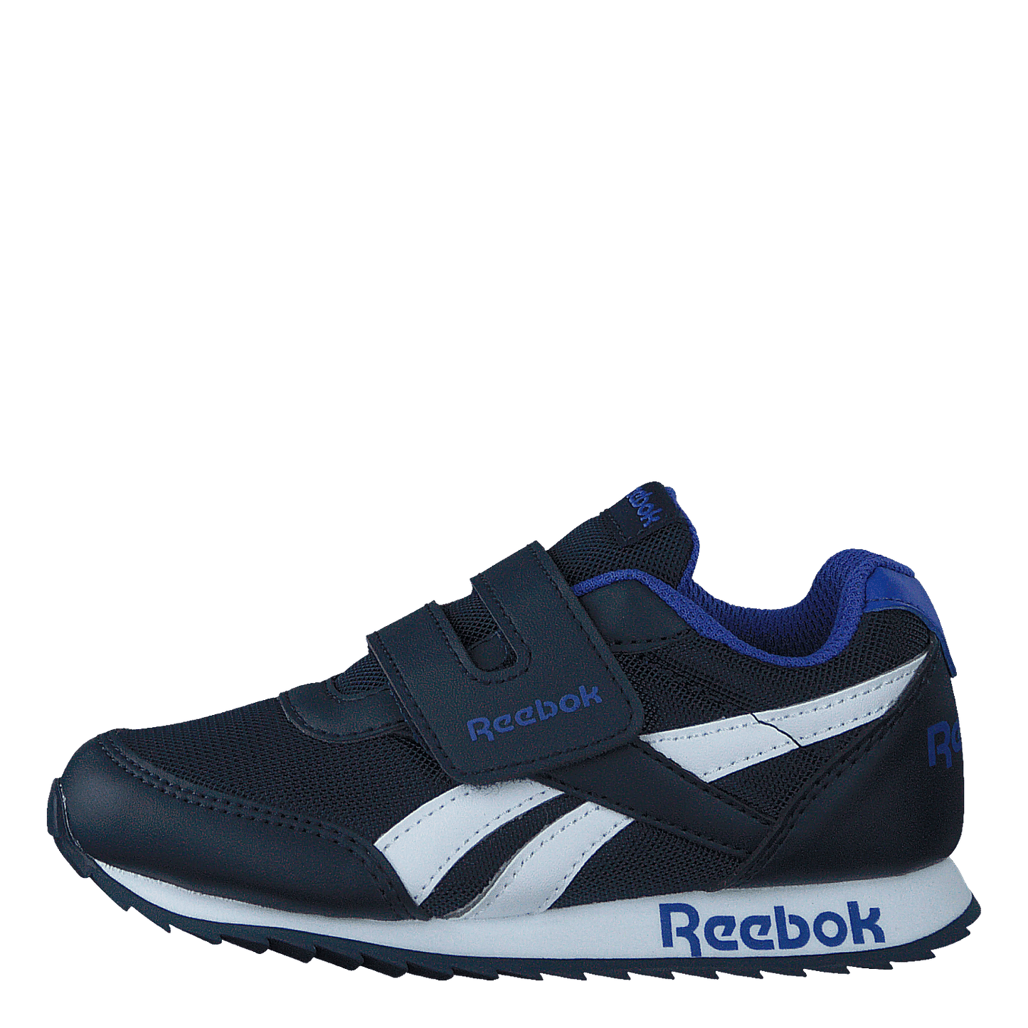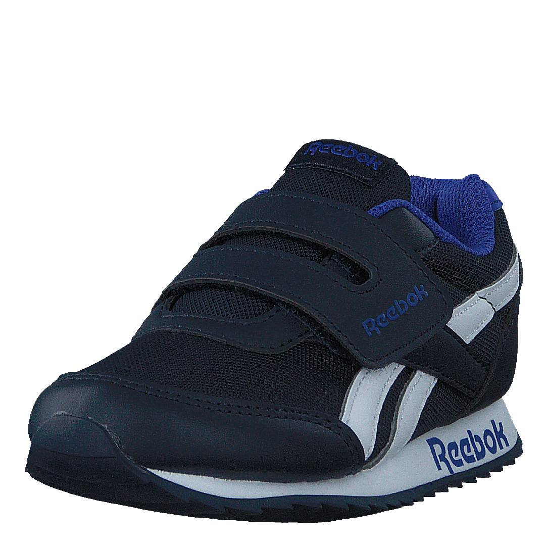 Reebok Royal Cljog 2 KC is a children's athletic shoe designed for comfort and ease. Featuring a navy blue synthetic leather and mesh upper with white and royal blue accents, this shoe combines style with functionality. Two velcro straps replace traditional laces, making it perfect for kids. The white midsole and rubber outsole provide durability and traction for everyday wear or light sports activities.