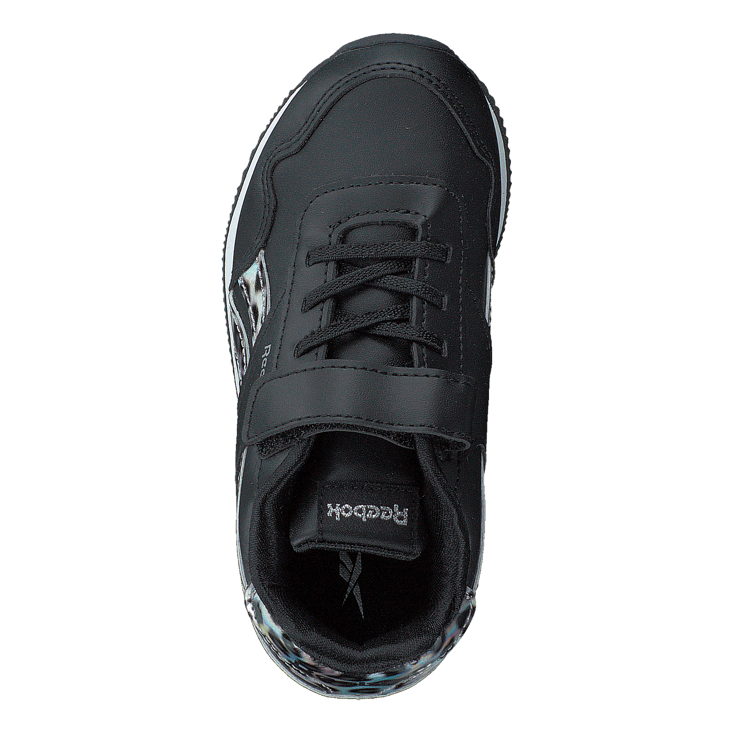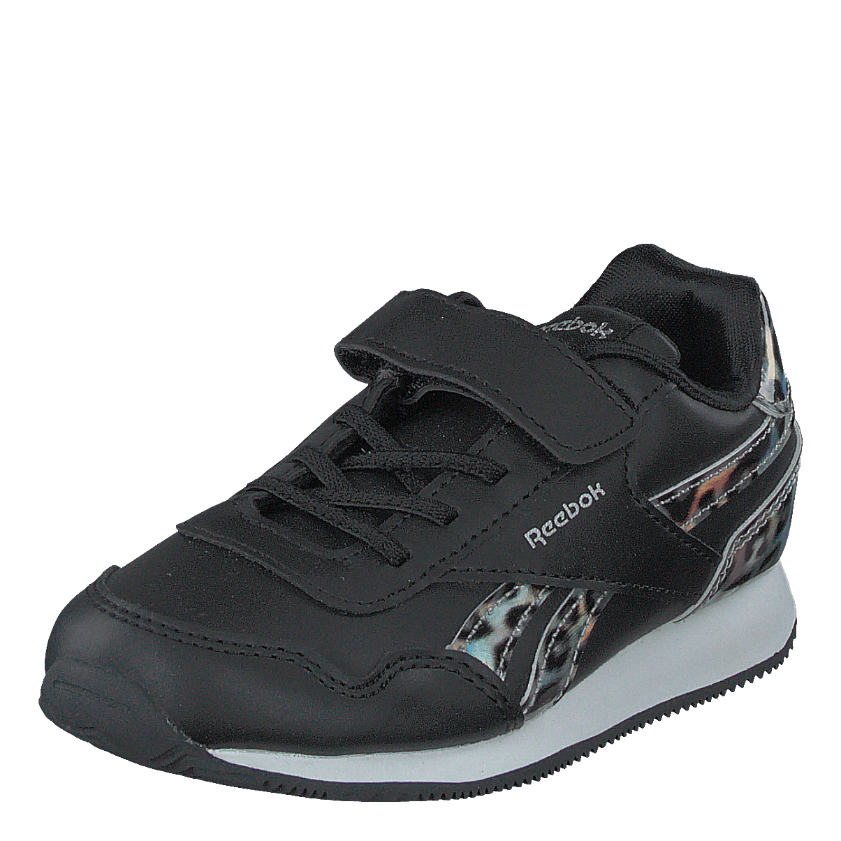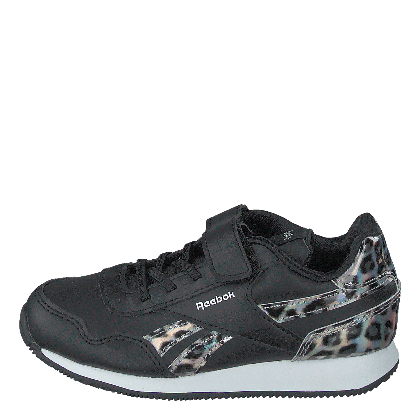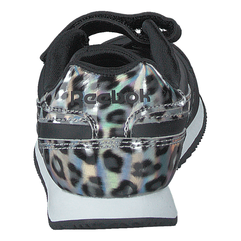 Reebok Classic's Royal Classic Jog 3.0 1V combines style and functionality for kids. This black sneaker features a sleek synthetic upper with eye-catching leopard print accents. Designed for comfort and ease, it boasts a padded collar, lace-up detail, and velcro strap for adjustable fit. The white midsole adds contrast to this sporty yet fashionable low-top shoe.