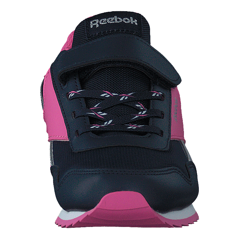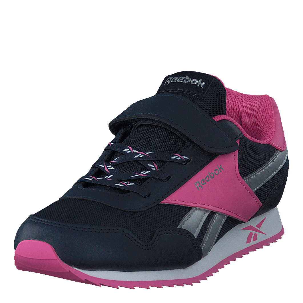 Reebok Royal Cljog 3.0 1V is a stylish children's athletic shoe featuring a navy blue upper with vibrant pink accents. Designed for easy wear, it boasts a single velcro strap closure and a durable rubber outsole. The shoe combines mesh and synthetic leather-like materials, offering comfort and breathability. Its low-top silhouette and sporty design make it suitable for everyday use or light athletic activities.