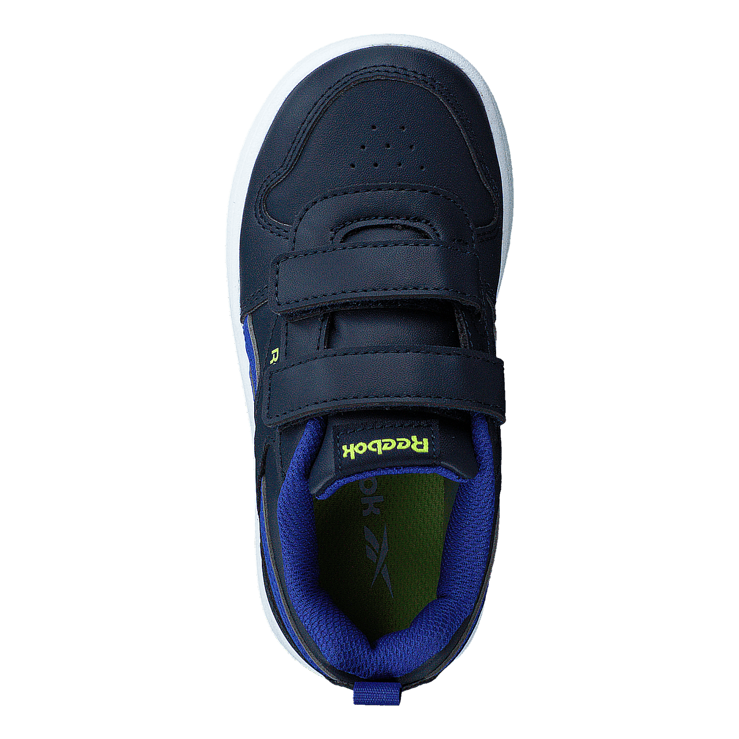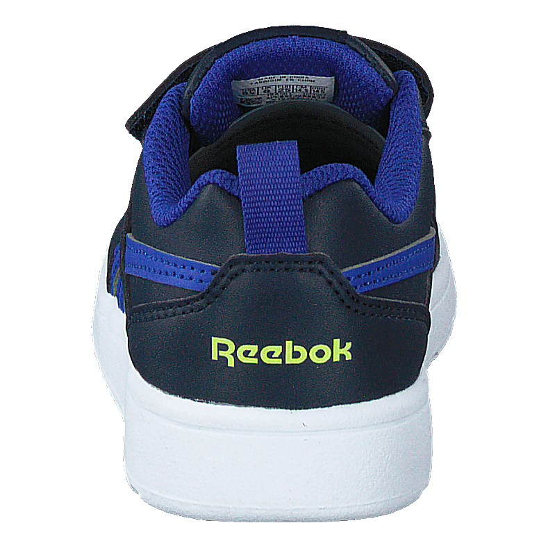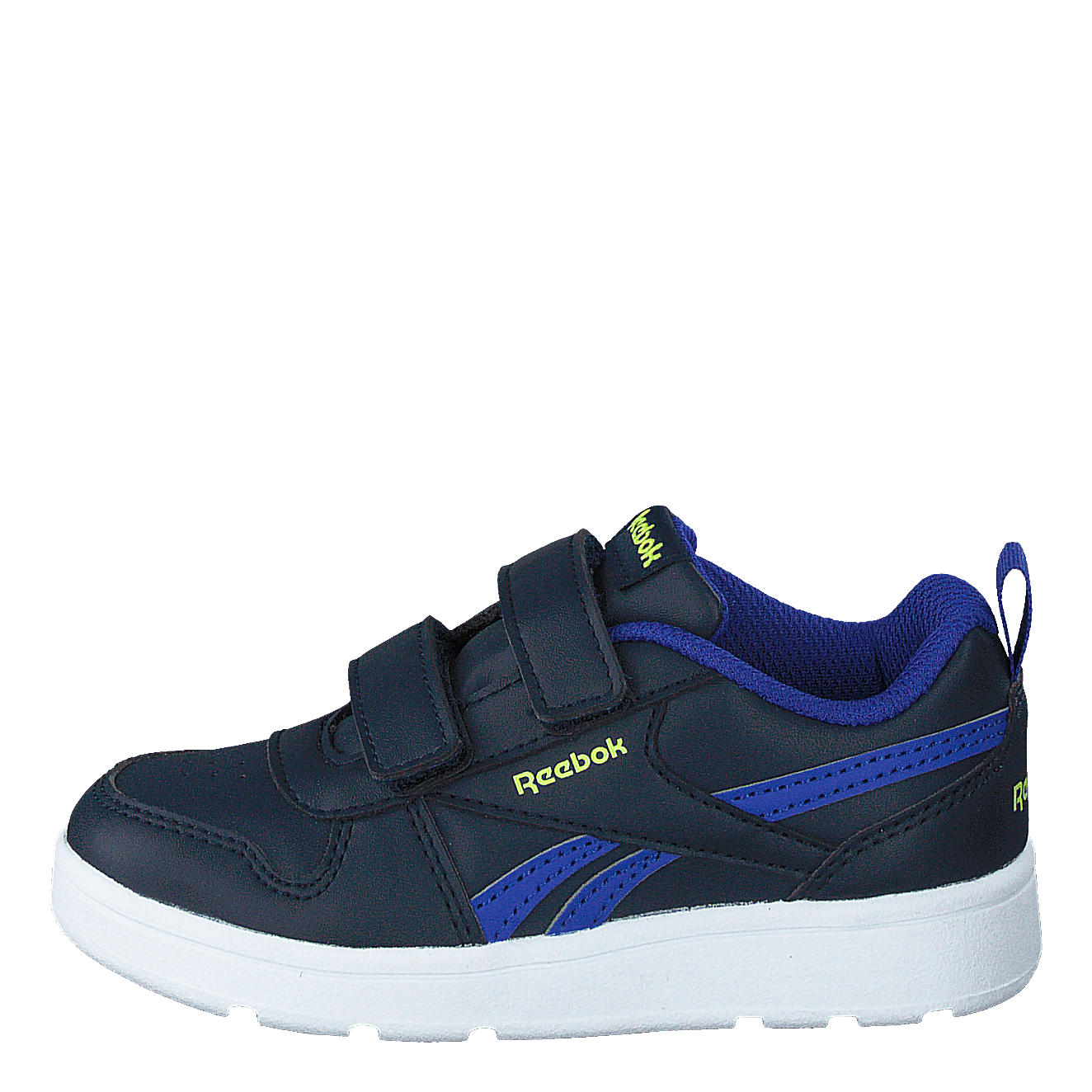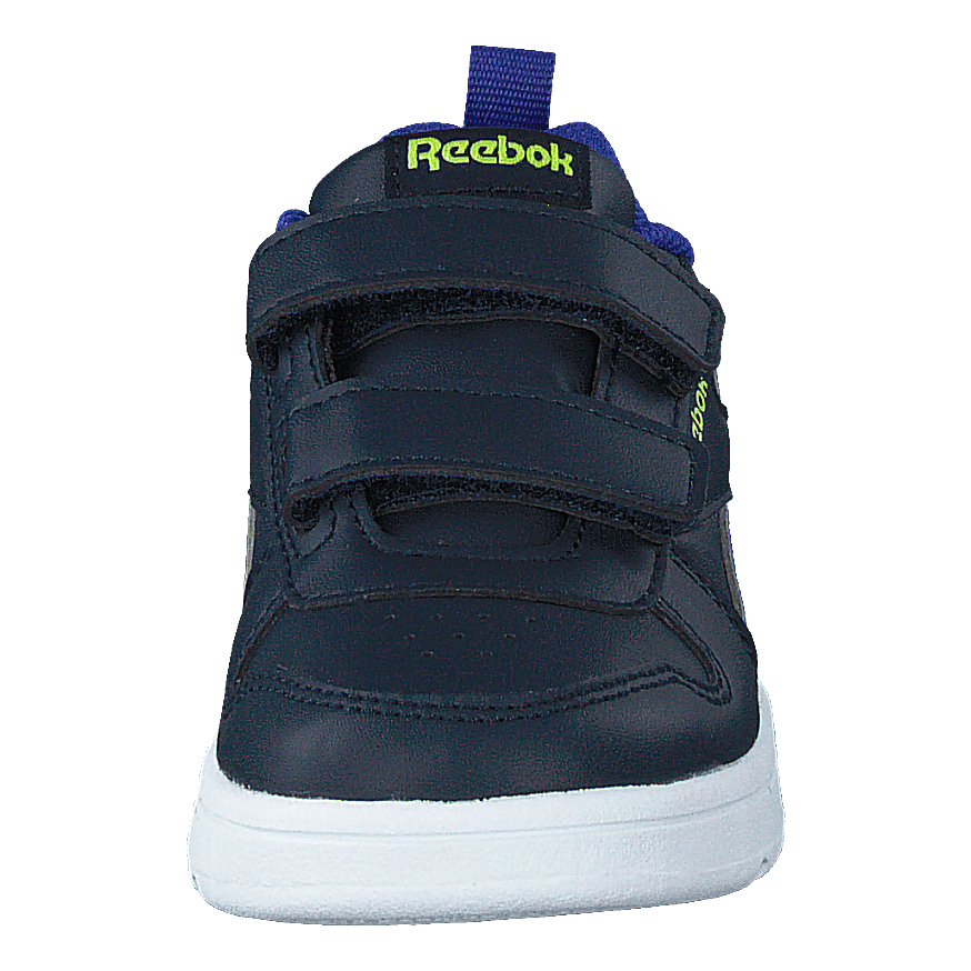 Reebok Royal Prime 2.0 2v offers classic style with modern comfort for active kids. This navy blue athletic shoe features bright blue and neon yellow-green accents, a synthetic leather upper, and breathable mesh collar. Two velcro straps ensure easy fastening, while the white sole completes the sporty look. Perfect for young athletes on the go.