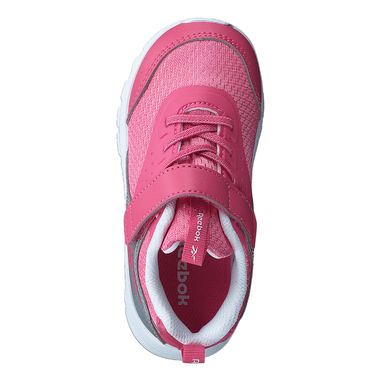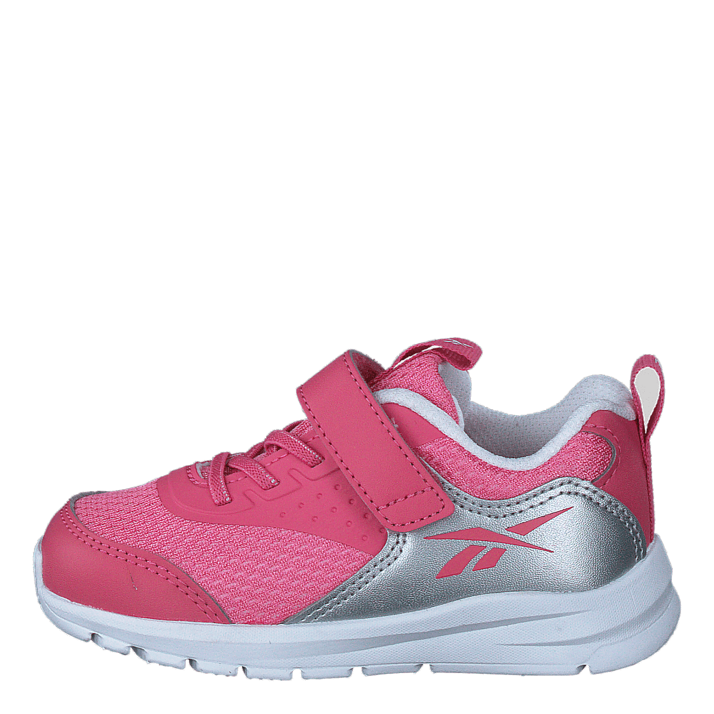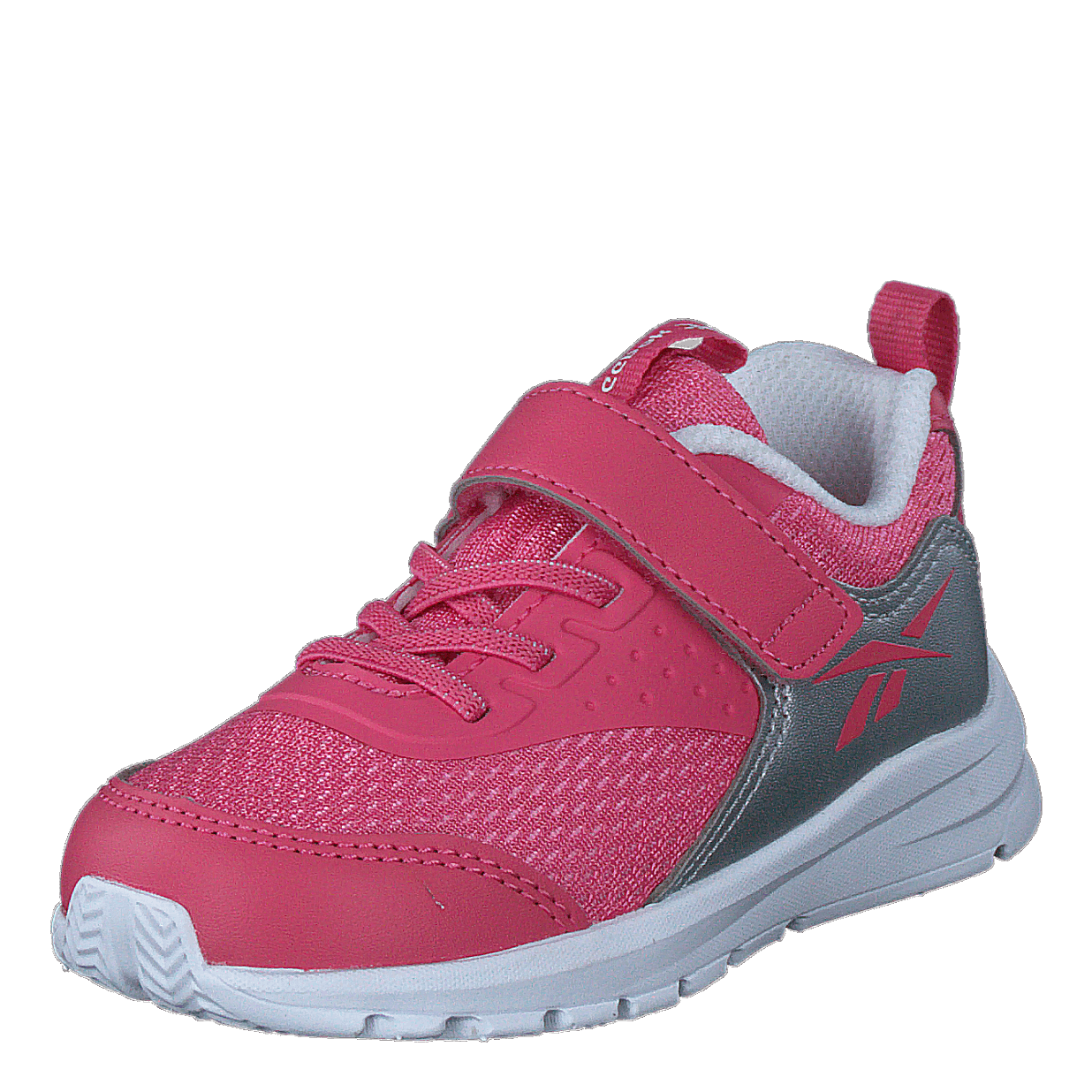 Reebok Rush Runner 4.0 TD combines style and functionality for active kids. This vibrant pink athletic shoe features a breathable mesh upper with synthetic leather accents, a sleek silver Reebok logo, and a white sole. The easy-to-use velcro strap ensures a secure fit, making it ideal for young runners and everyday wear.