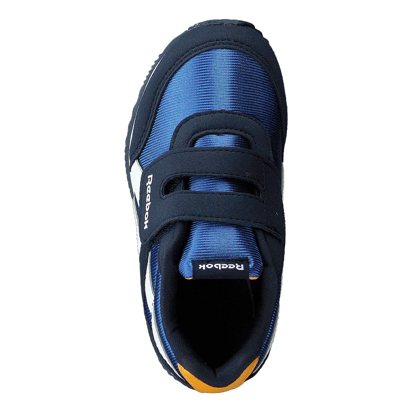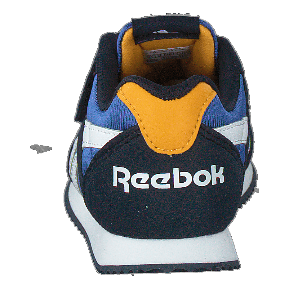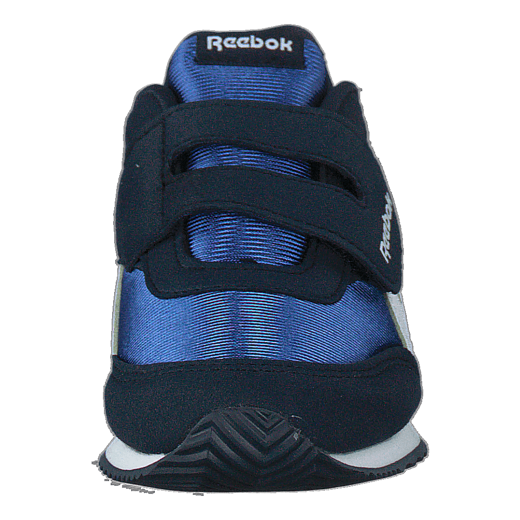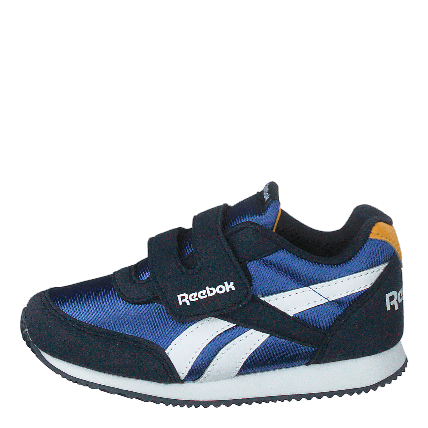 Reebok's Royal Classic Jog 2 Kc combines retro style with modern comfort. This navy and royal blue sneaker features a synthetic leather upper, padded tongue and collar for enhanced comfort, and convenient velcro straps for easy fastening. The white sole and signature Reebok logo add classic appeal, while a touch of gold near the heel provides subtle flair.
