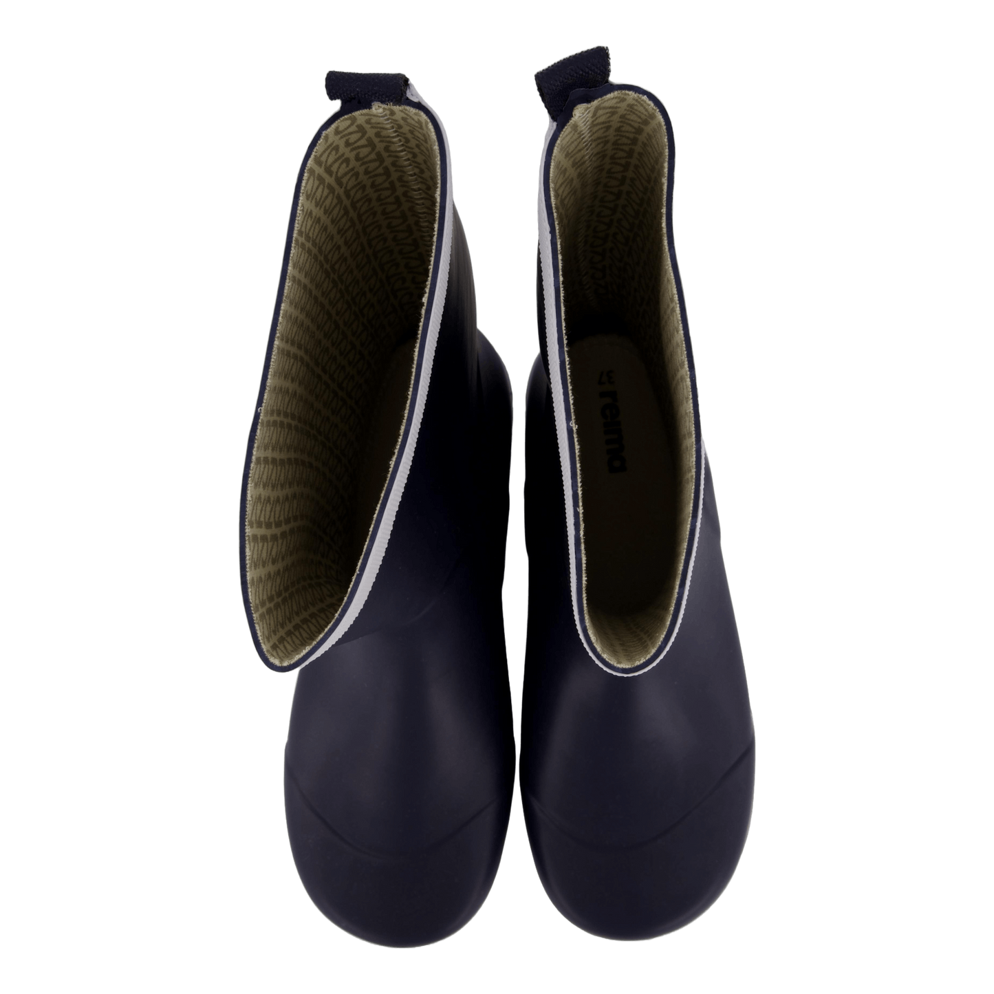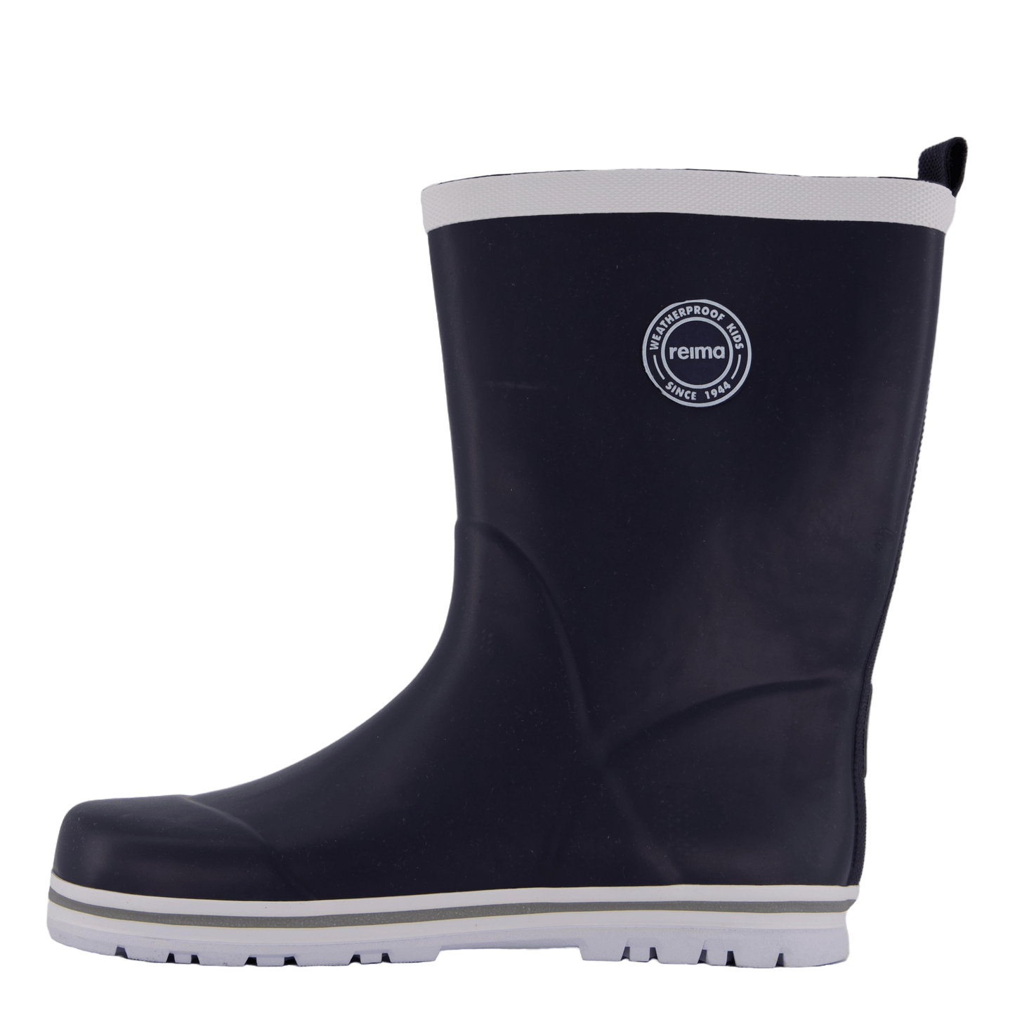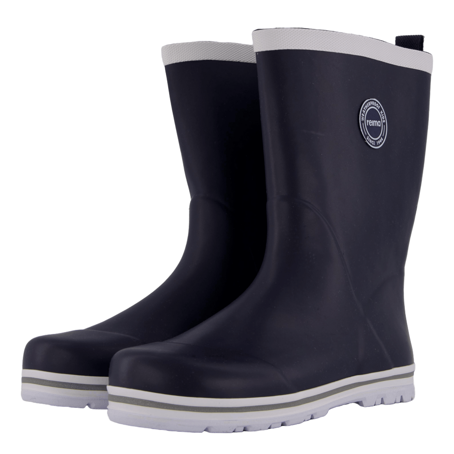Reima's Taika 2.0 Navy rain boots offer classic waterproof protection for children. These easy-to-wear boots feature a cotton lining, flexible rubber outsole for good grip, and removable insoles with Happy Fit print. The navy blue design with white trim includes reflective details and the Reima logo, emphasizing the brand's weatherproof heritage since 1944.