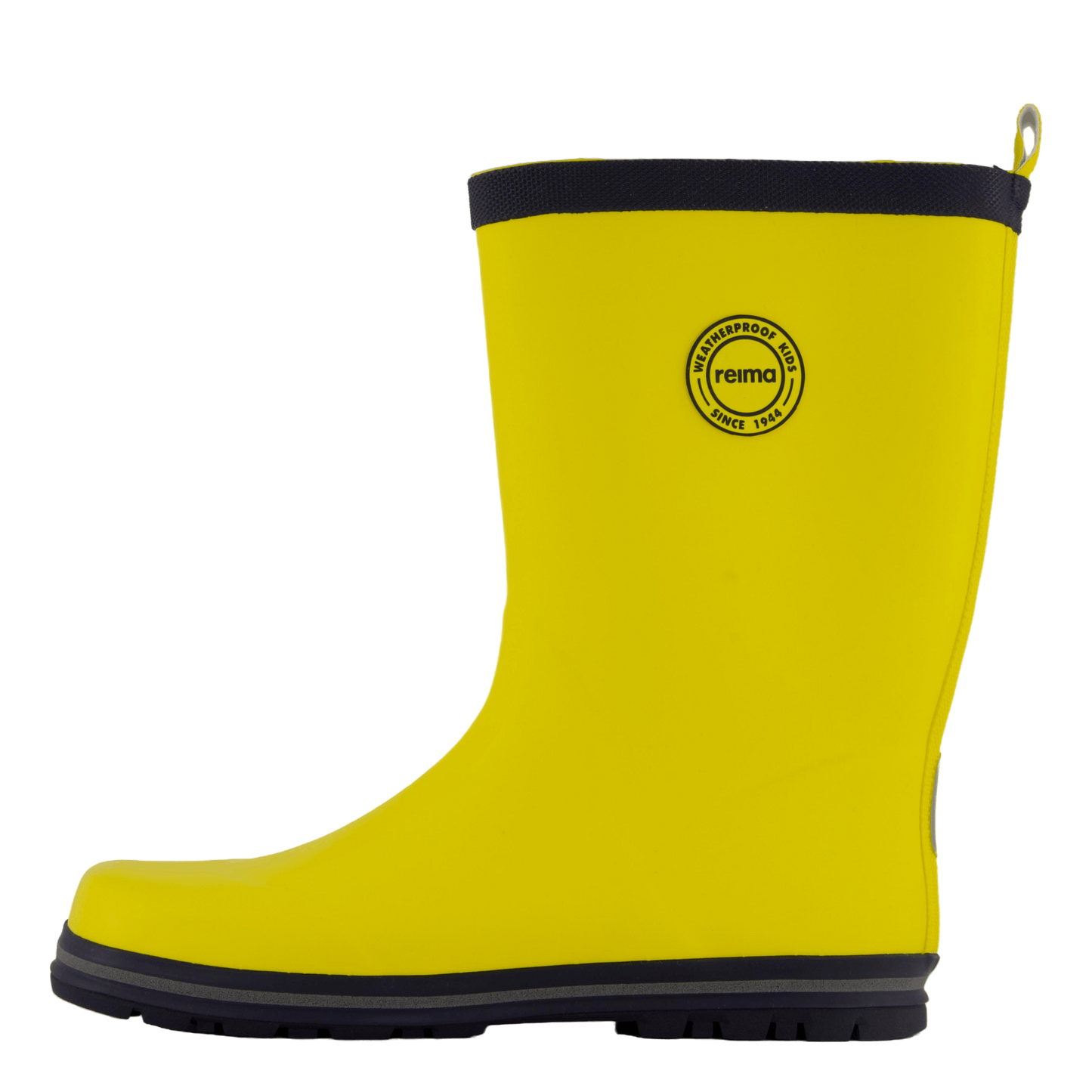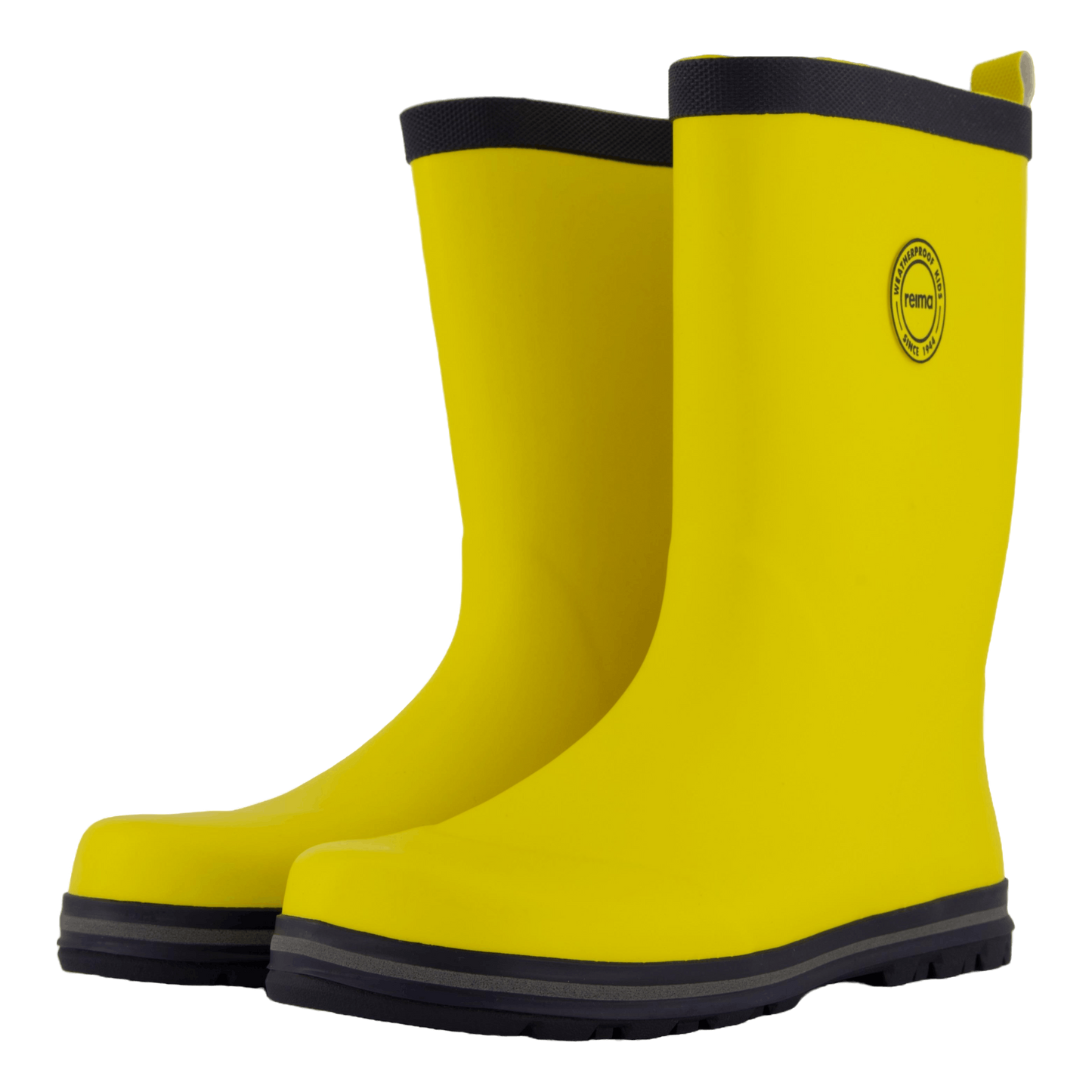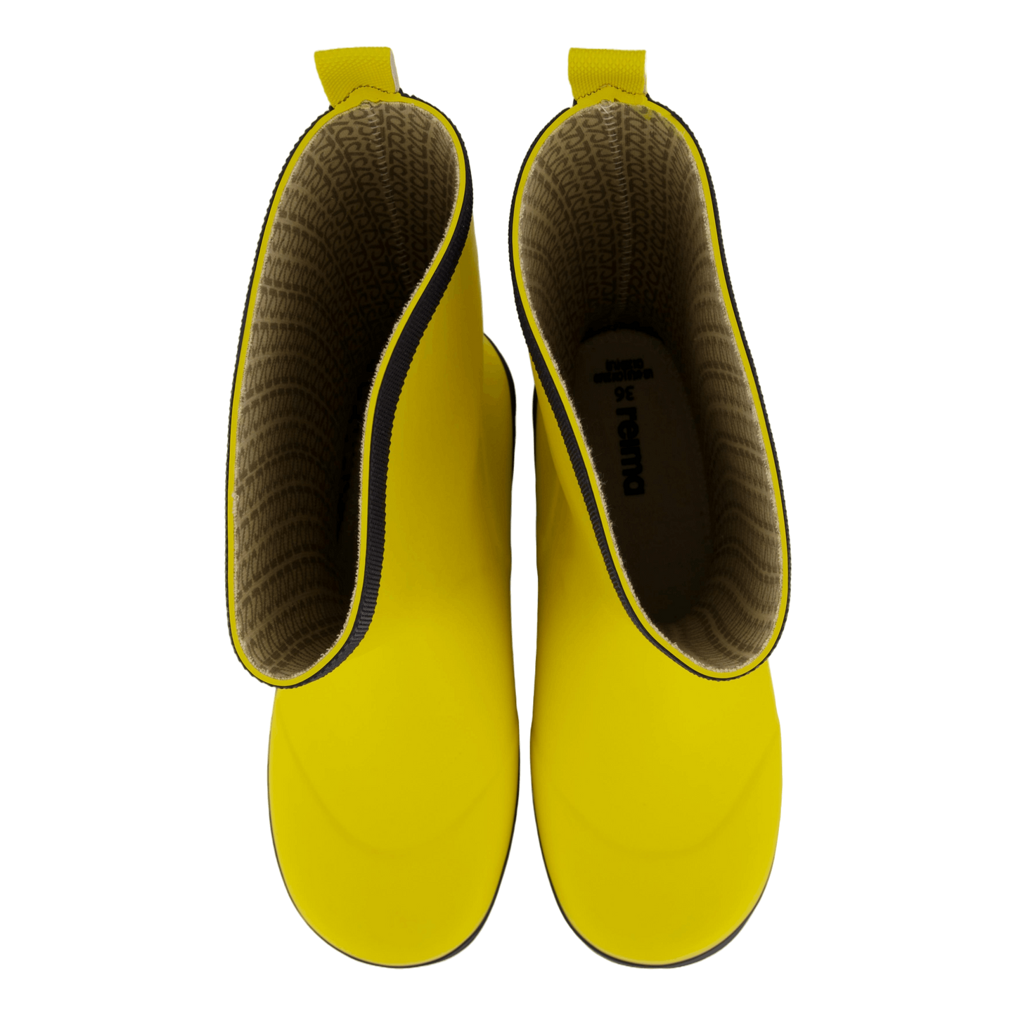 Reima's Taika 2.0 Yellow rain boots offer classic, waterproof protection for children. These bright yellow rubber boots feature a cotton lining, flexible outsole for grip, and removable insoles with Happy Fit print. Easy to put on with a height designed for age-appropriate fit, they include reflective details and a textile lining. Vegan-friendly and perfect for spring and autumn.