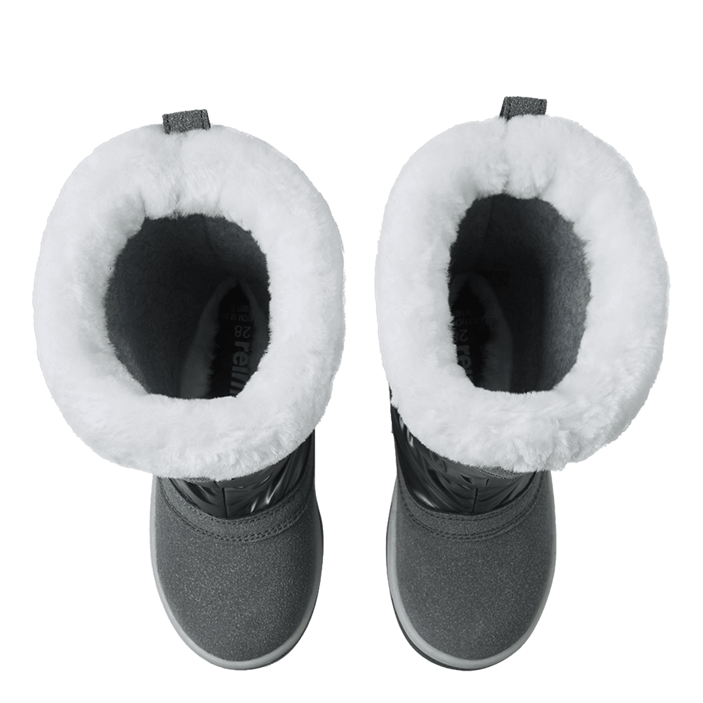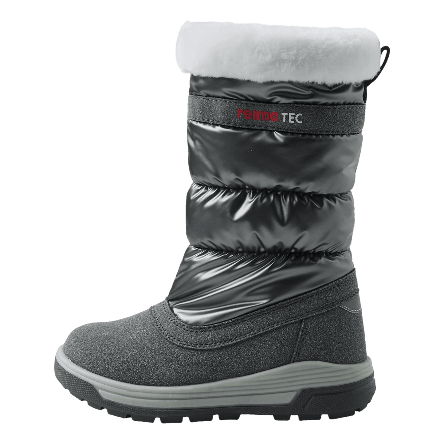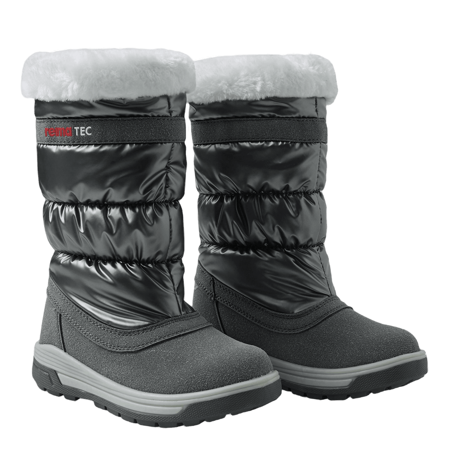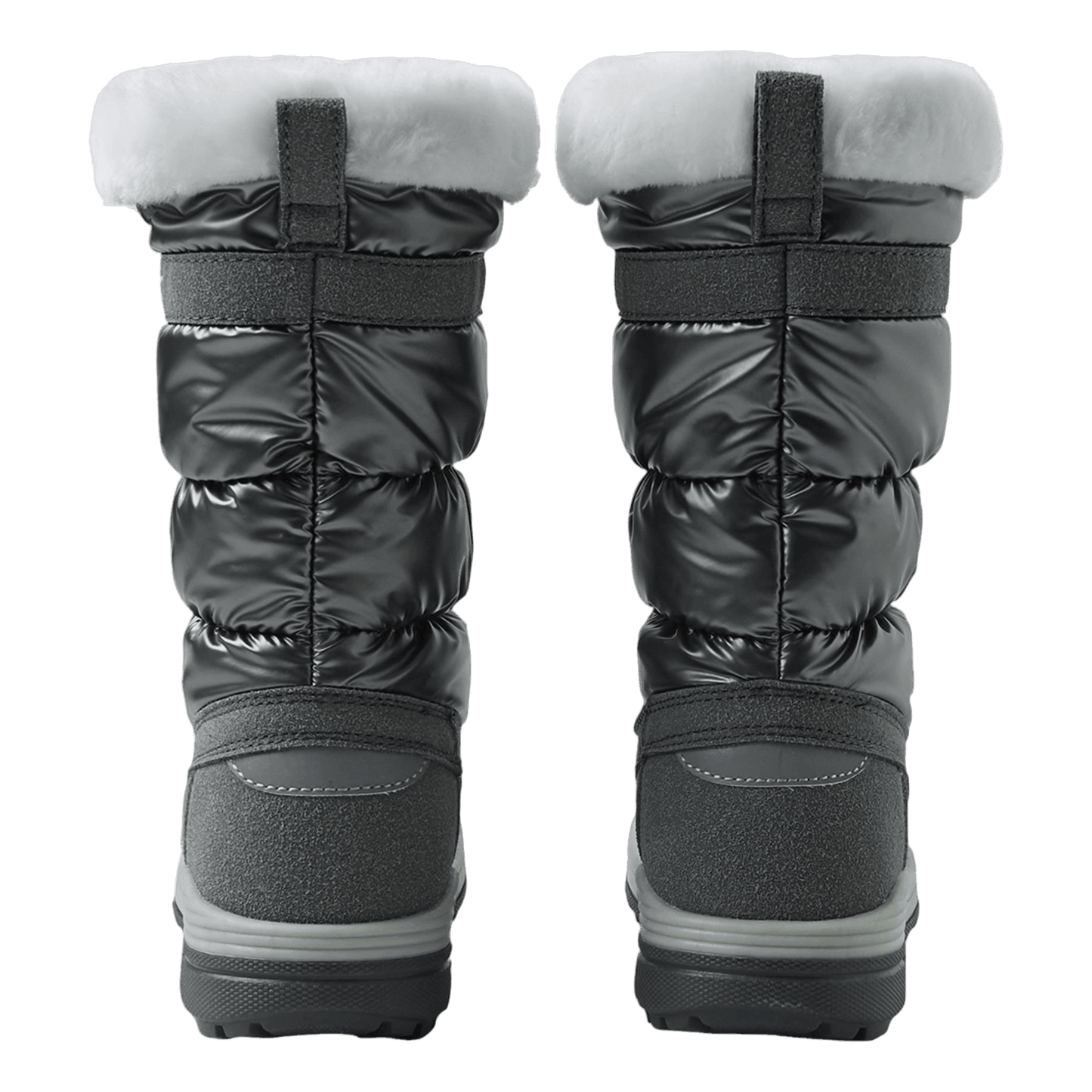 Reimatec Winter Boots blend style and functionality for cold weather. Featuring a quilted, dark silver upper with plush white faux fur trim, these boots offer a sleek, modern look. The durable rubber sole provides excellent traction, while the reimaTEC technology ensures warmth and water resistance. Perfect for outdoor winter activities and casual wear, these boots combine comfort with contemporary design.