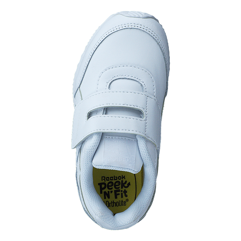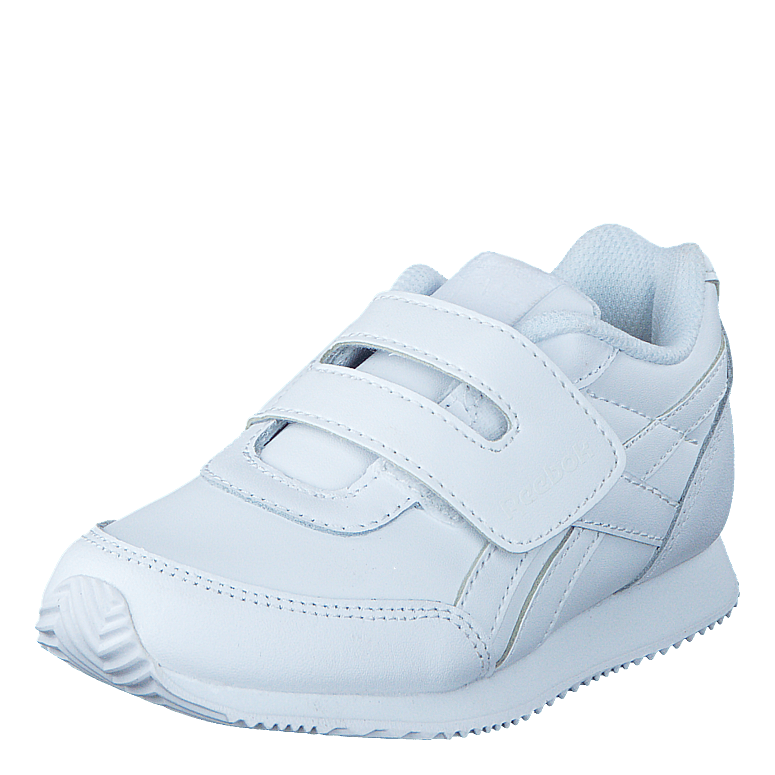 Reebok Classic's Royal Cljog 2 KC is a sleek, all-white athletic shoe designed for children. Featuring a synthetic leather and mesh upper for durability and breathability, it boasts two convenient Velcro straps for easy on-and-off. The low-top design with padded collar ensures comfort, while the thick rubber sole provides traction and cushioning for active kids.