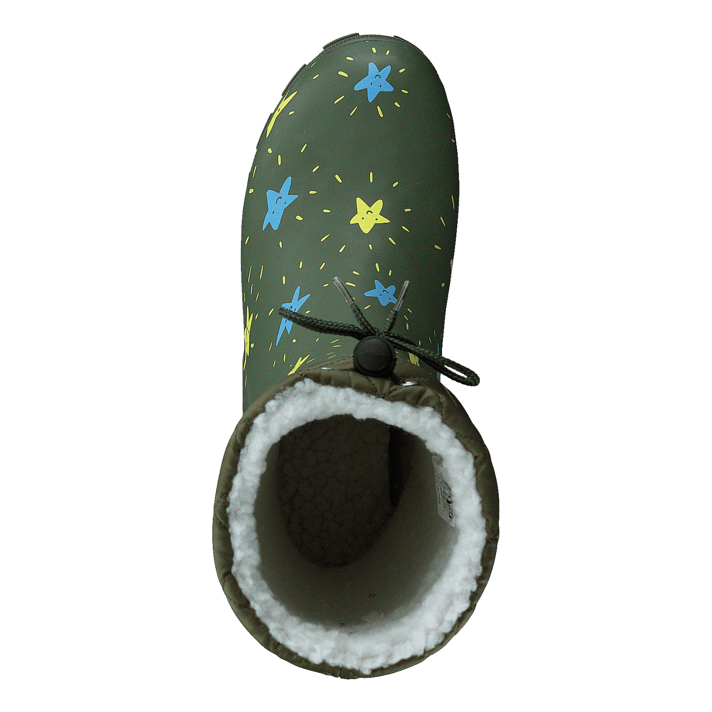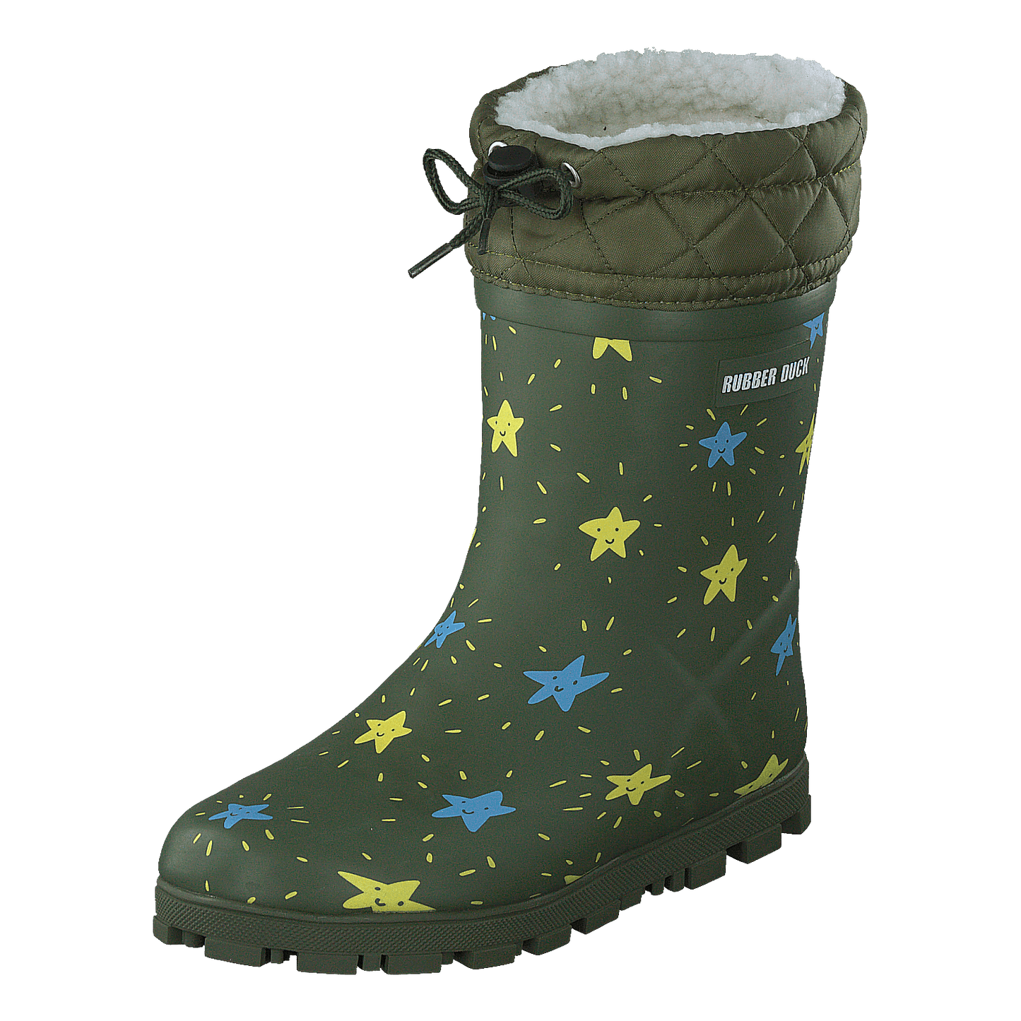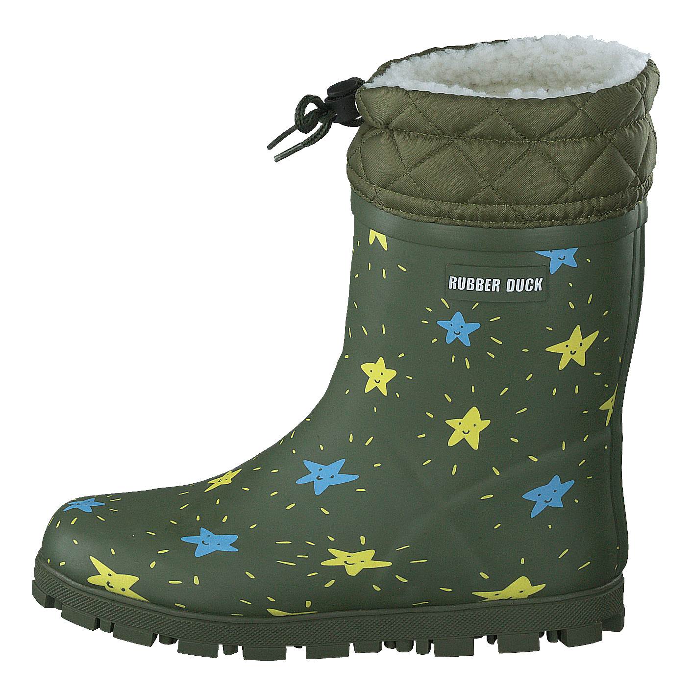 Rubber Duck's army-green thermal flash stars kids' boots combine style and functionality. Featuring a rubber lower with playful star patterns and a quilted fabric upper lined with warm, fluffy material, these boots are perfect for cold weather. The drawstring closure keeps moisture out, while the rugged tread ensures good traction. Ideal for children's winter adventures.