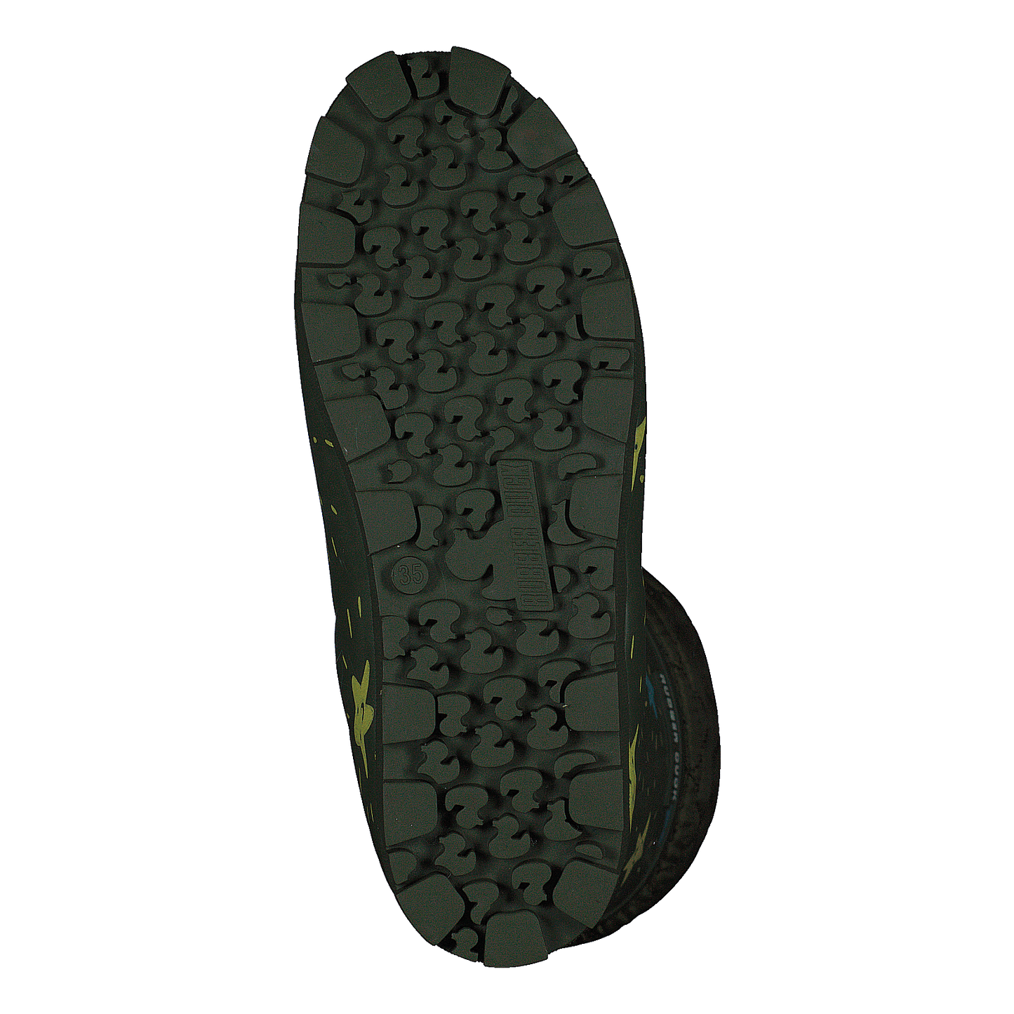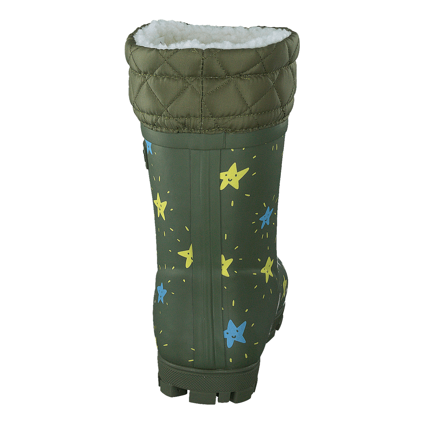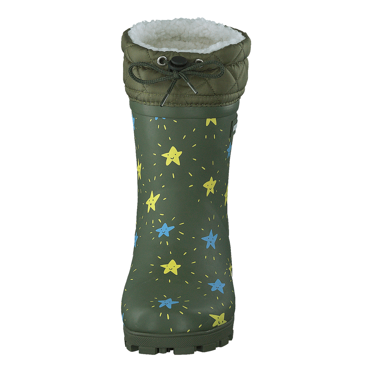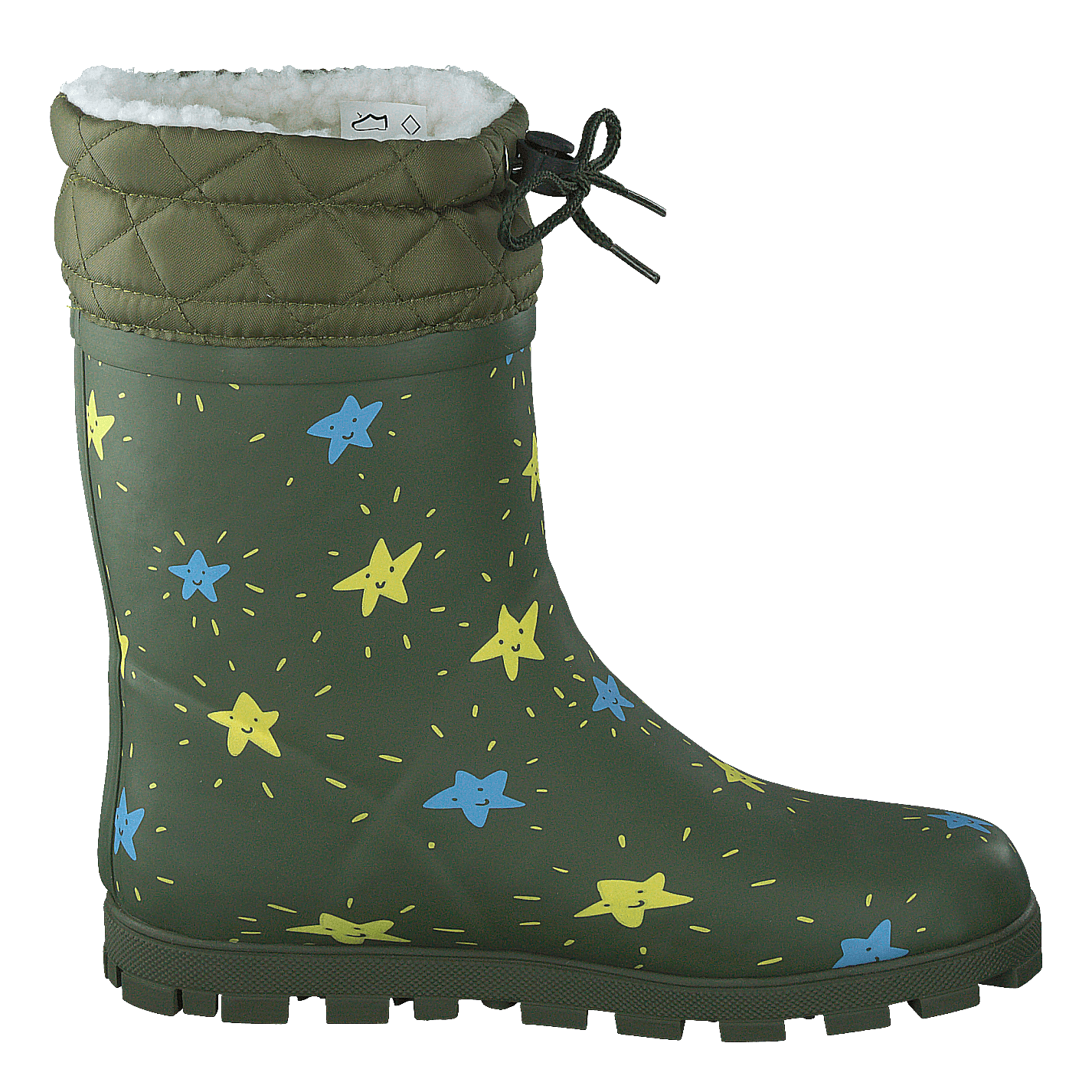 Rubber Duck's army-green thermal flash stars kids' boots combine style and functionality. Featuring a rubber lower with playful star patterns and a quilted fabric upper lined with warm, fluffy material, these boots are perfect for cold weather. The drawstring closure keeps moisture out, while the rugged tread ensures good traction. Ideal for children's winter adventures.