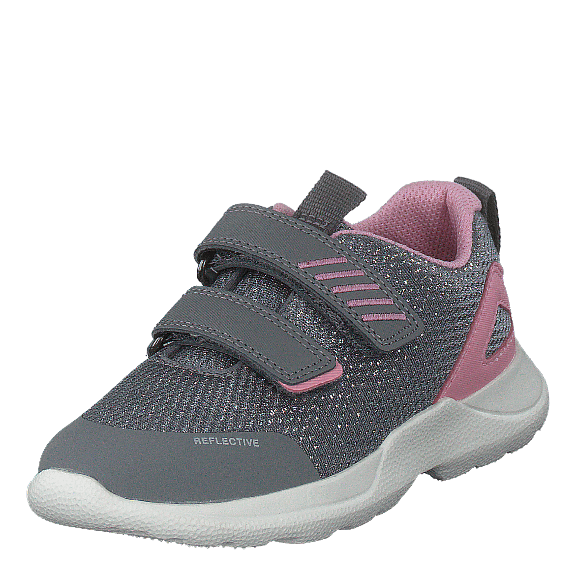 Superfit's Rush Grey/pink children's sneaker combines style and functionality. Featuring a shimmery grey upper with pink accents, this sporty shoe offers easy on-off with dual velcro straps. The reflective elements enhance visibility, while the breathable mesh construction ensures comfort. Perfect for active kids who love fashion-forward footwear with practical design.